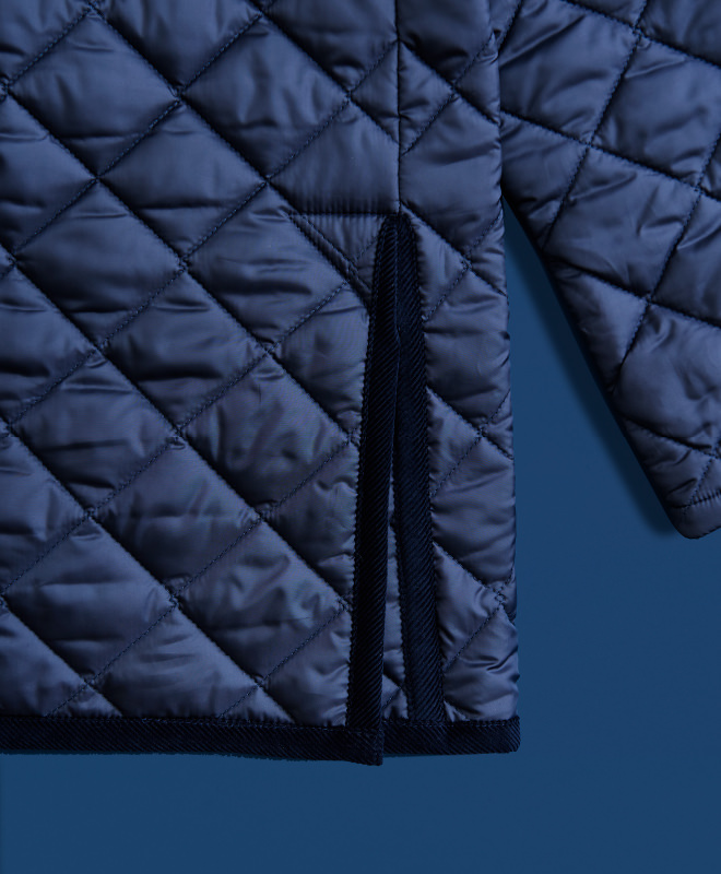 SHIPS では '95 年に取り扱いをスタートし、'97 年には初の別注にも着手。そして 2016 年、キルティングの生地をはじめ、襟やパイピングのコーデュロイ、フロントボタンといった素材やパーツの選定、さらにはパターンワークまでオーダーで作り込み、専用のモデル名を与えられたSHIPSのオリジナル型となる「ケジントン」を完成させました。特筆すべきは、そのレングス。屈指の人気を誇るスリムフィットモデルのレイドンのシルエットを基に、スーツのジャケットが裾まで隠れるよう着丈を 4cm ほど長く設定。通勤スタイルがスマートにキマるため、多くのビジネスパーソンから好評をいただいています。