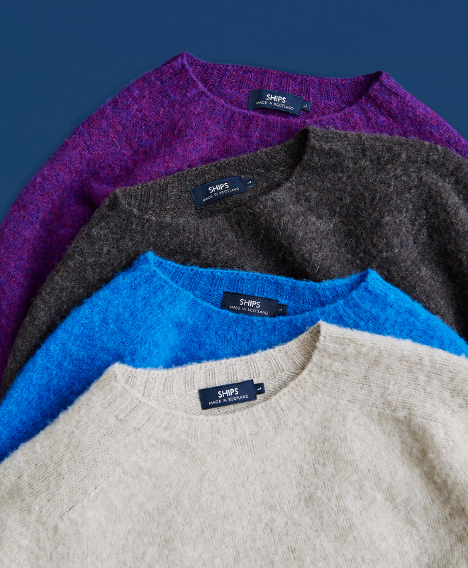 SHIPS では 2011 年より「SHIPS MADE IN SCOTLAND」シリーズとして別注モデルをご用意。以来マイナーチェンジを重ねながら、この季節になると店頭を飾る10年定番に。今シーズンは時流に合わせ、適度にゆったりとしたサイジングを提案しています。加えて、シェットランドウールならではのクリアでみずみずしいカラーも見どころであり、ダークに沈みがちな冬のコーディネイトが華やぐ鮮やかな彩りのほか、スッと馴染んで着回しやすい落ち着いた色合いもラインナップ。装いの主役として1枚でサマになり、アウターを羽織っても表情豊かな佇まいを演出します。また家庭で手洗いできるイージーケアも嬉しいポイント。毎年のように色違いで買い足されるリピーターも多いウィンター・スタンダードです。