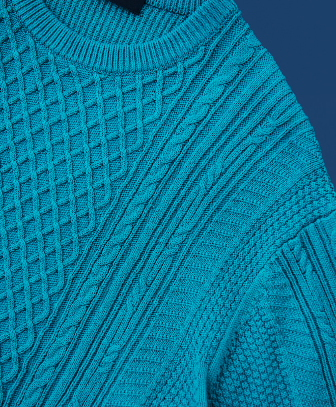 一見すると、いたってベーシックなフィッシャーマンセーターのようにも映ります。しかしつぶさに目をやると、特定のモチーフを繰り返すポピュラーなケーブル編みではなく、いくつもの異なるパターンをランダムに組み合わせた珍しいデザインに。奇をてらった印象や強い主張こそないものの、この実にユニークな模様が、豊かな表情とさりげない個性をもたらします。柄の選定と配列、凹凸がハッキリと浮かぶ立体的な編み立てなど、何度も試行錯誤を重ねて最良のバランスとクオリティを叶えました。