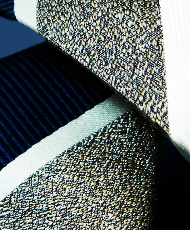 ランダムピッチのワイドストライプを彩るのは、金粉を吹きかけたかのようにキラキラと光る砂子(すなご)織りと、しっとりとしたシックな艶を帯びるレップ(うね)織り、それらを爽やかに引き締めるホワイトの平織りという組み合わせ。華やかさがありながらも決して派手ではなく、その豊かな表情と大剣幅8.5cmというベーシックなサイズが相まって、あらゆるスーツ&ジャケットに対応し、ビジネスをはじめフォーマルなシーンにも活躍します。また、フレッシャーズにもベテランにも世代を問わずエイジレスにマッチ。そうした万能性からギフトにも最適で、事実としてプレゼント用に選ばれる女性が多いのも、周囲に好印象を与える一本であることを物語っています。