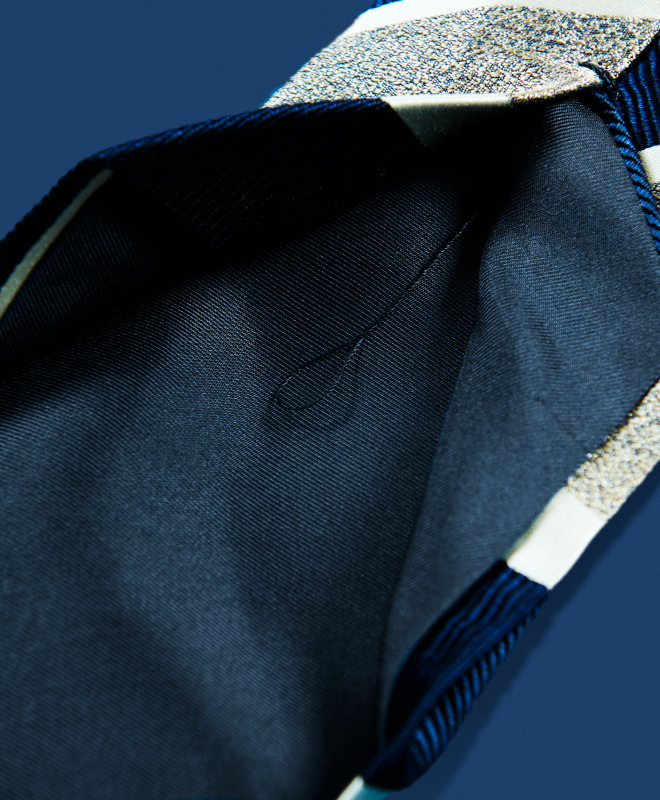 さらにデザインの魅力とともに、ジャパンメイドで叶えた確かなクオリティも人気の理由。言うまでもなく素材はシルク100%。適度にハリ・コシのある芯地を使っているため、ノットとディンプルが美しくキマります。加えて、大剣裏に確認できるたるみ糸も、手縫いによる上質な仕立ての証。と、いいネクタイに求められる条件が揃っています。
