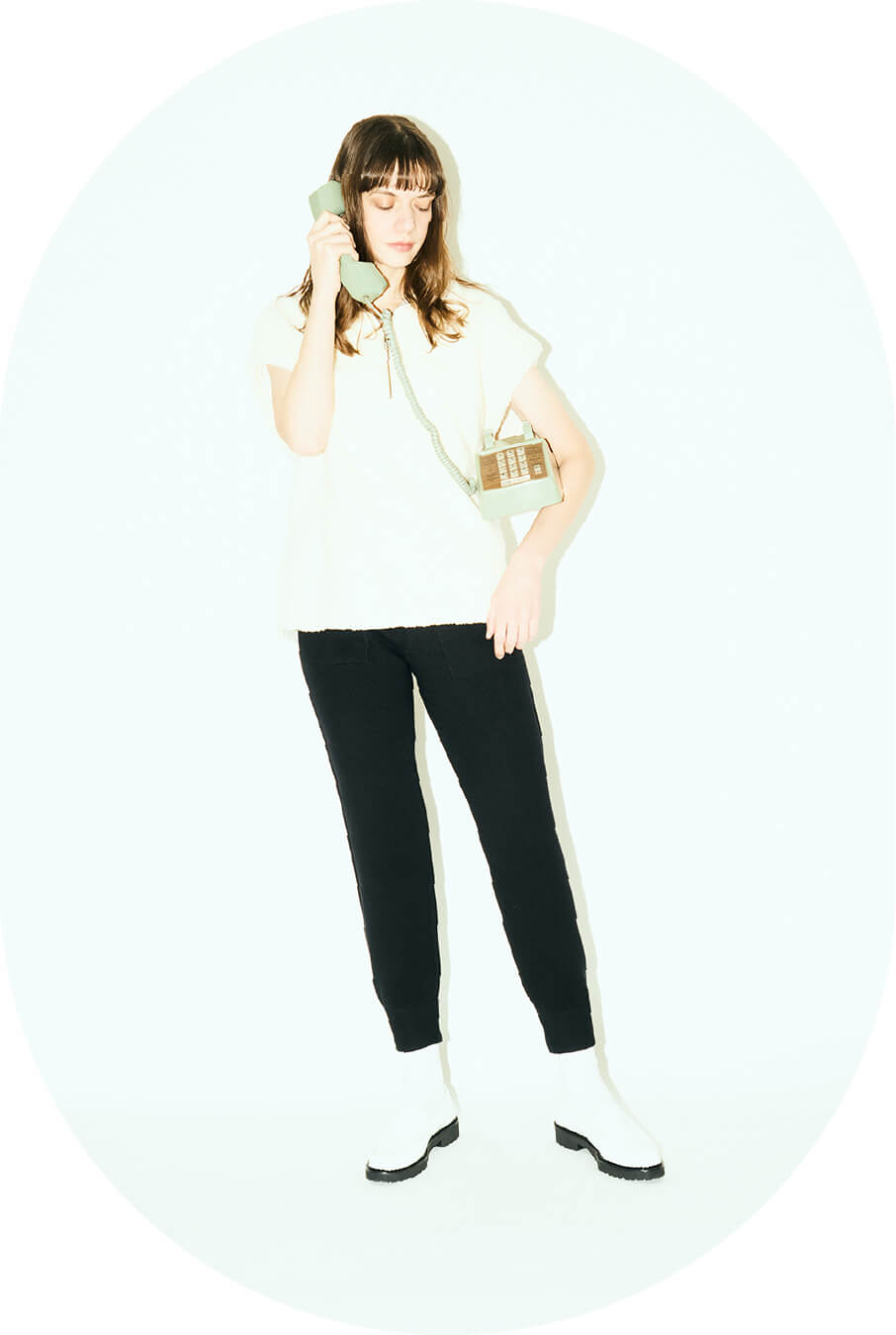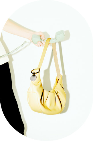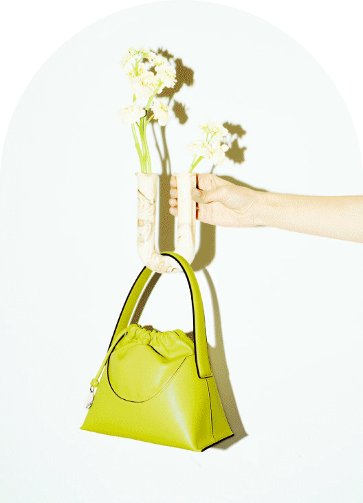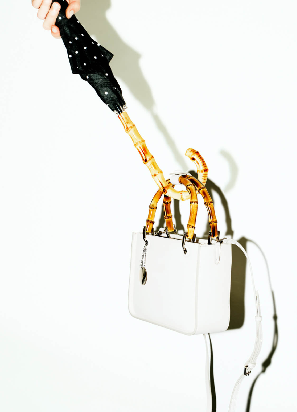 小ぶりなバッグは、エレガントなバンブーハンドルが主役。ストラップを細くして優雅な印象にしたのと、底をラウンドにすることで全体の表情を和らげたのがこだわりです。ミラーチャームも程よいアクセントに。