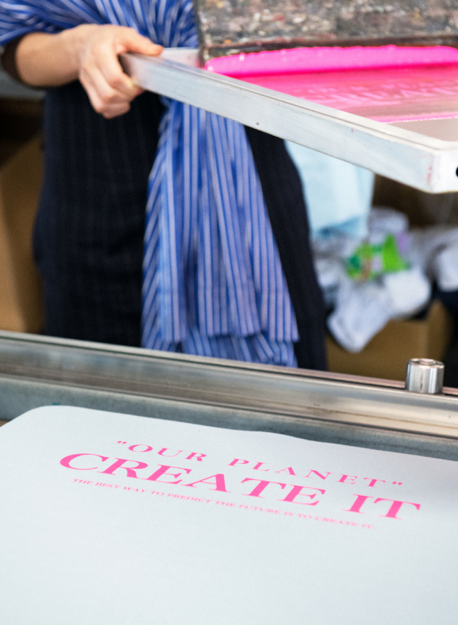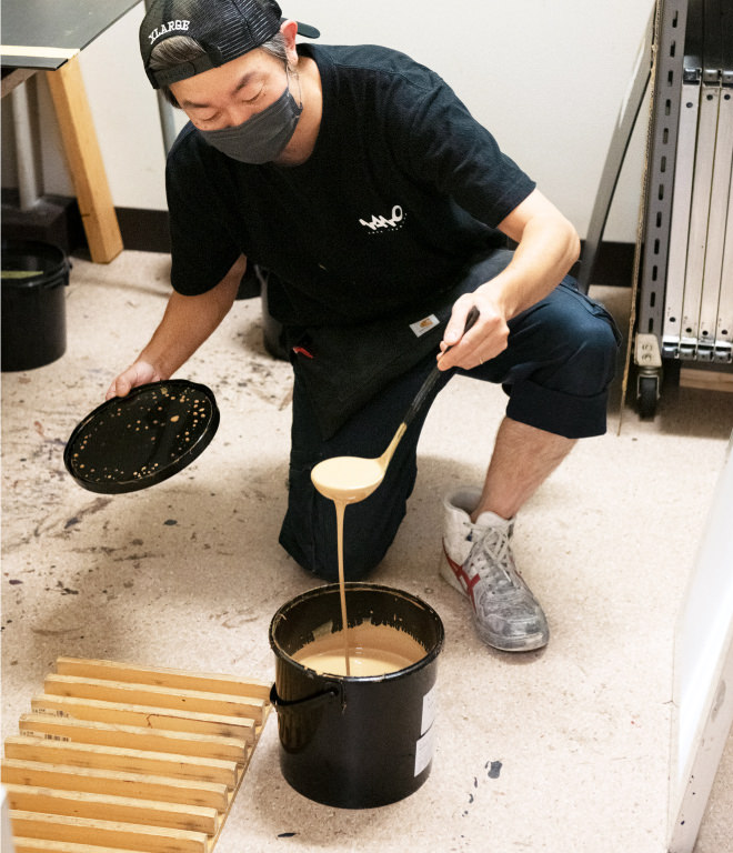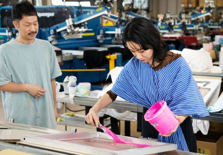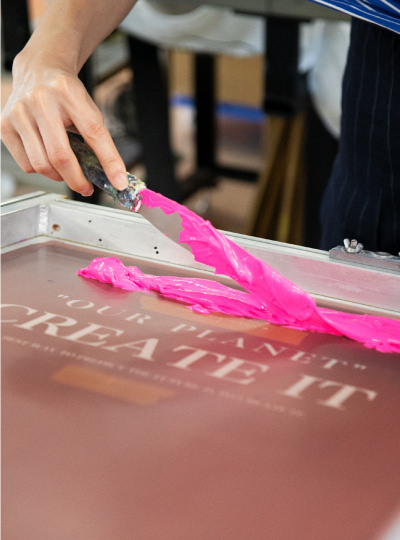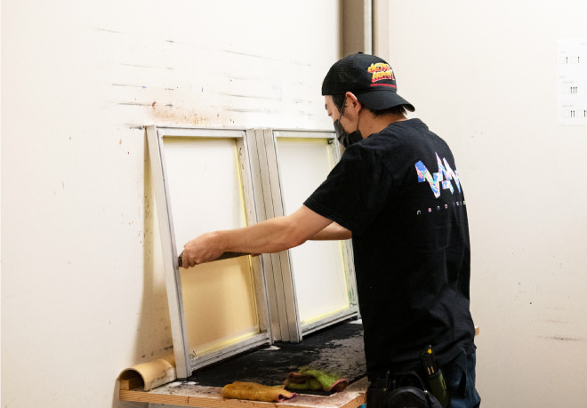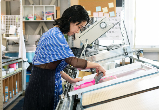 伊藤 : プリントには主にインクジェットとシルクスクリーンの2種類があって、インクジェットはコピー機のように一気にすべての色を印刷するもの。シルクスクリーンは1色ずつ重ね塗りするので、仕上がりがよりきれいなんです。ただ手作業なので、ずれないように細心の注意を払いながら作業しています。
