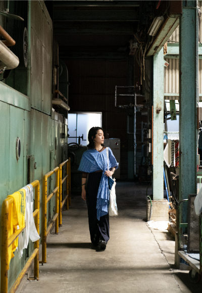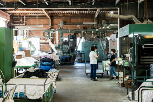まずは訪れたのは今回のコラボレーションにおいて、カットソー生地の染色をご担当いただいた田代ニット加工。ニットという名前がついているものの現在はカットソー生地の染色がメインで、なかでもバイオやケミカルなどの特殊加工を得意とされているんだそう。