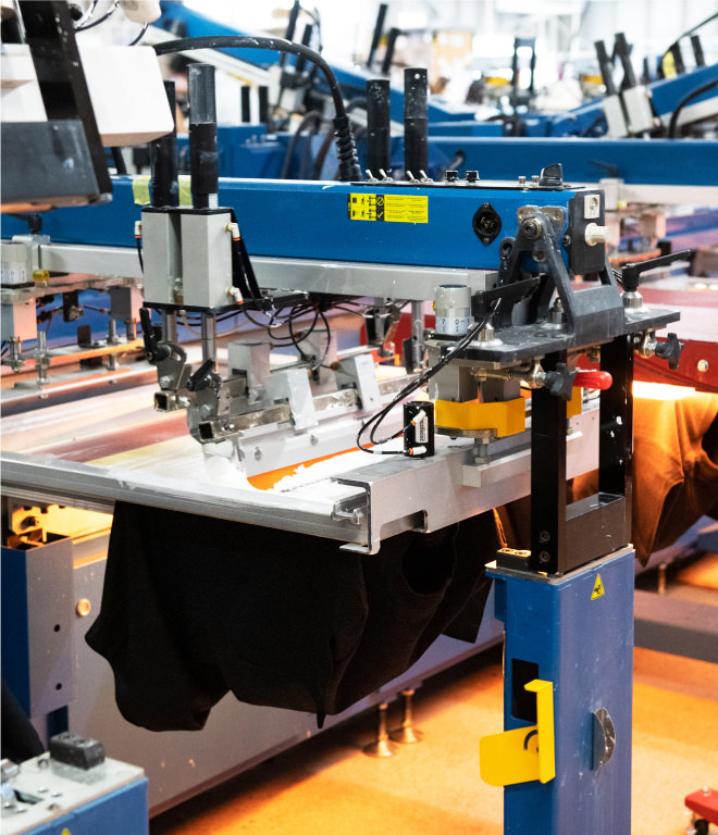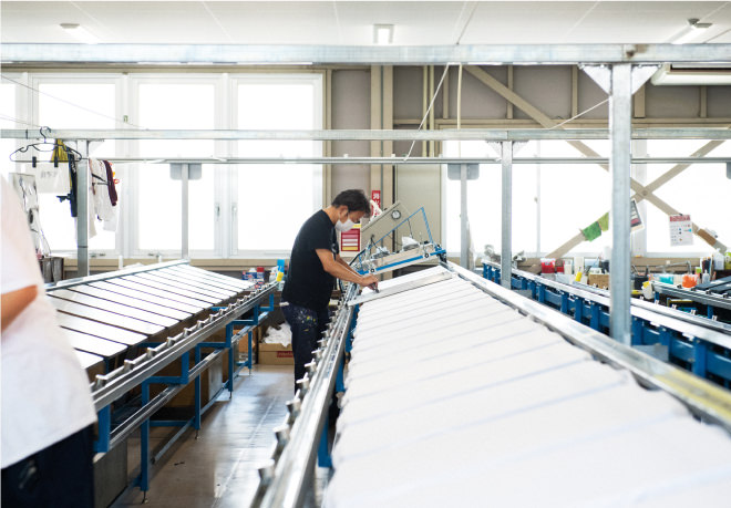 シルクスクリーンは職人が1枚1枚台にTシャツを通し、刷り上げていく。