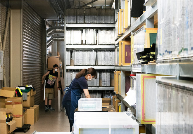 シルクスクリーンの版は倉庫に1万点ほど保存されている。1年追加の依頼がなかったらまっさらな紗割りという状態に戻す。