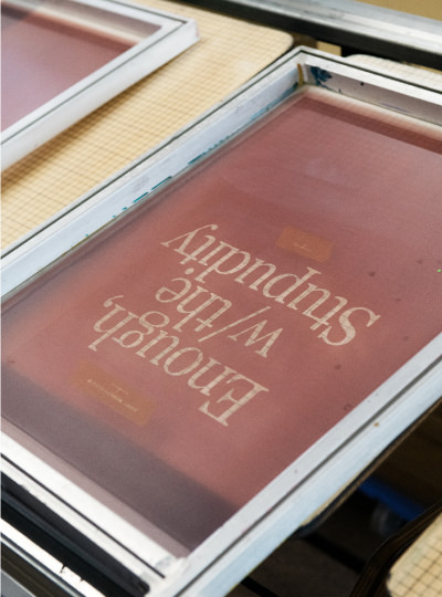 データを印刷したポジフィルムを乳剤を塗った紗割りに貼り、紫外線を当てて洗うことでシルクスクリーンの版が完成する。