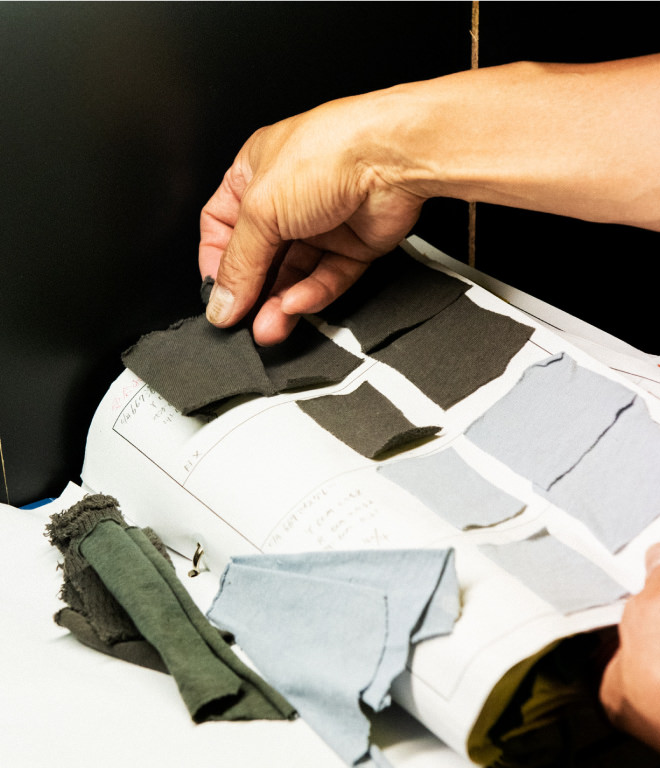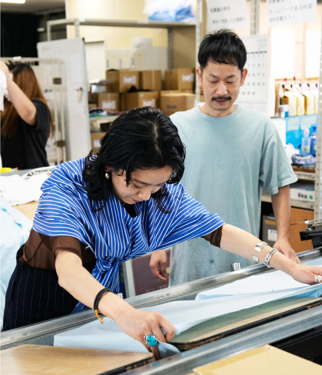 田代 : 今回の商品は「顔料染め」という生地の上に顔料を乗せて、それを色止めで接着させる染め方と、「反応染め」という布のうえで化学反応を起こす染め方の2種類を使っています。