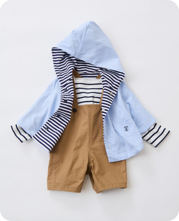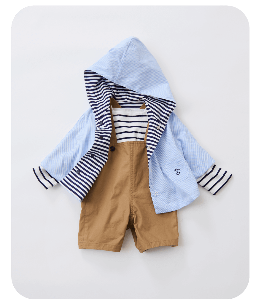 ベビーをやさしく包むポンチョに、ボーダーのトップスを合わせて。オーバーオールは、お出かけにもデイリーにも。