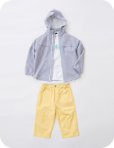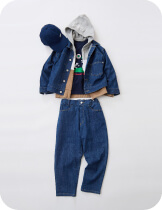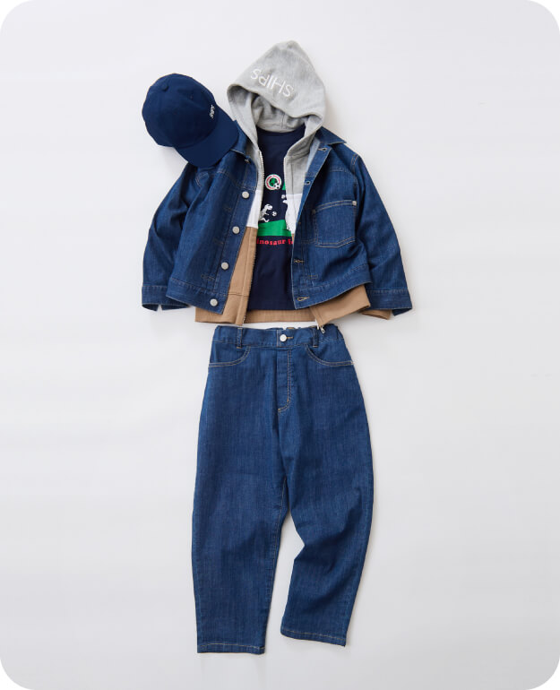 肌寒い朝の登校は、デニムセットアップにパーカーでしっかり重ねて。走り回るボーイは、脱ぎ着でこまめに調節!