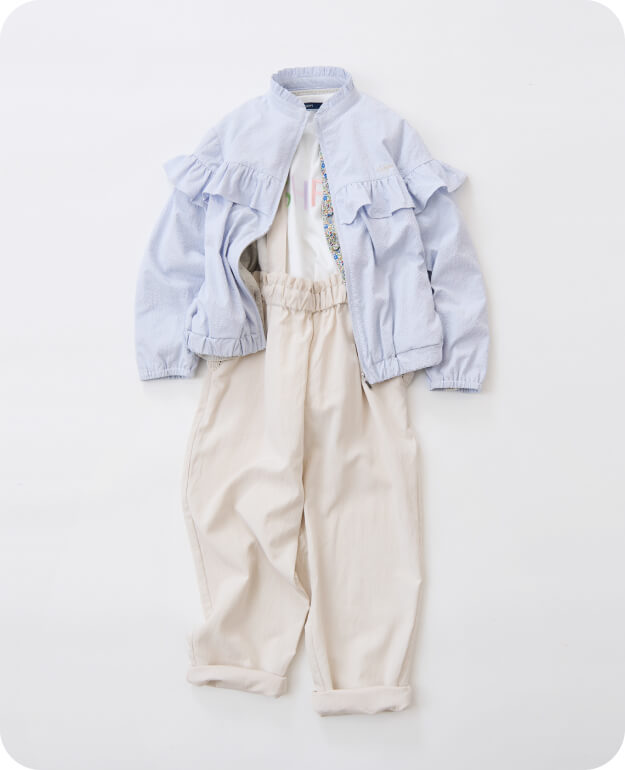 さらりとしたサッカー素材のジャケットの内側に、カーディガンを忍ばせて。朝晩の冷えに備えつつ、フリルでガールらしさも忘れずに。