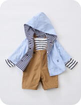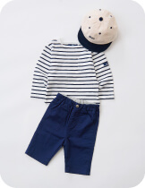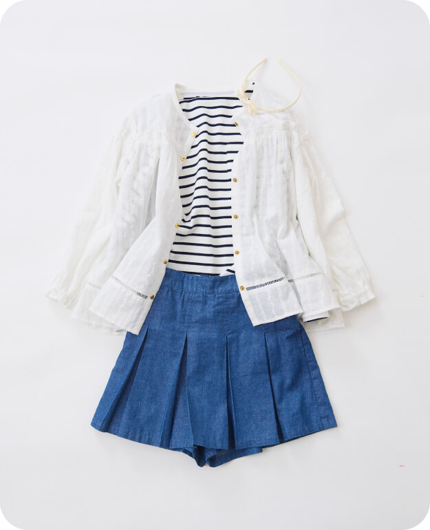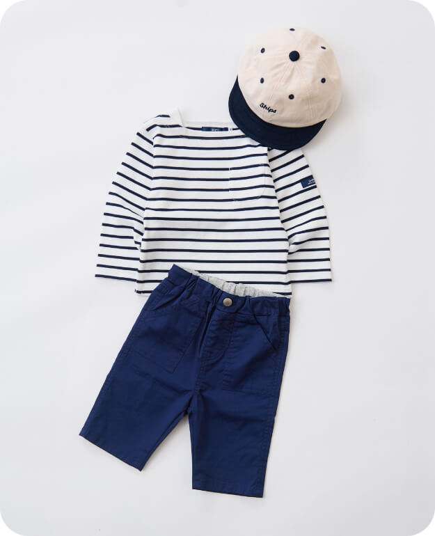 陽射しが心地よい日は、1枚で決まるボーダーを主役にシンプルに。動きやすいハーフパンツで軽やかに、のびのび過ごして。