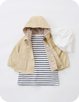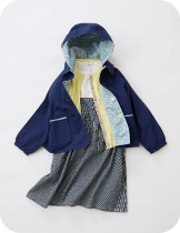 リバティ生地のフードコートに、イエローのカーデを重ねてあたたかく。フレアなワンピースで春らしい軽やかさをプラスして。