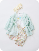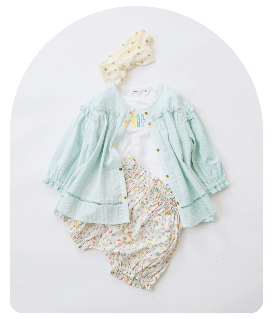 春を感じる陽射しの日には、透け感のあるコットンブラウスをジャケット代わりに。動きやすいブルマはアクティブなベビーにもぴったり。