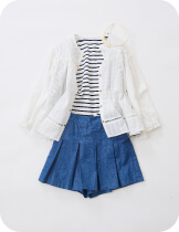 繊細な刺繍のホワイトブラウスに、インナーのボーダーを効かせて。デニムスカートでほどよくカジュアルなムードに。