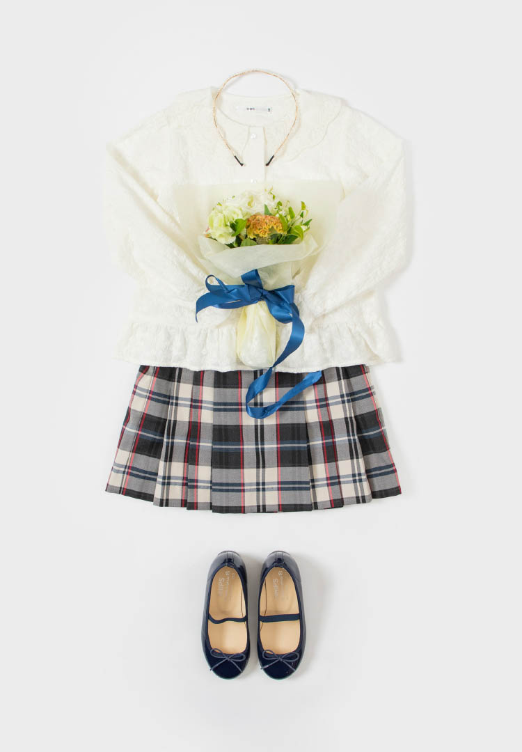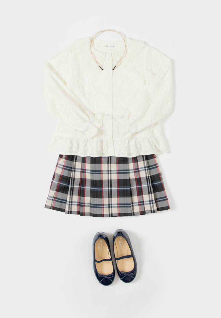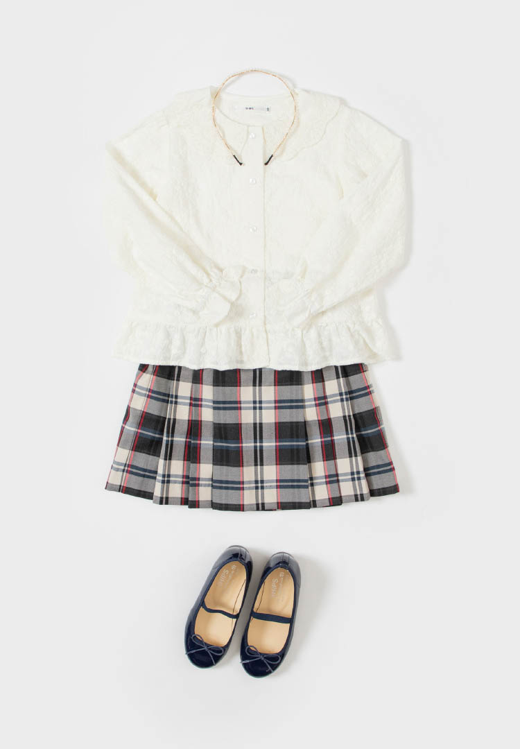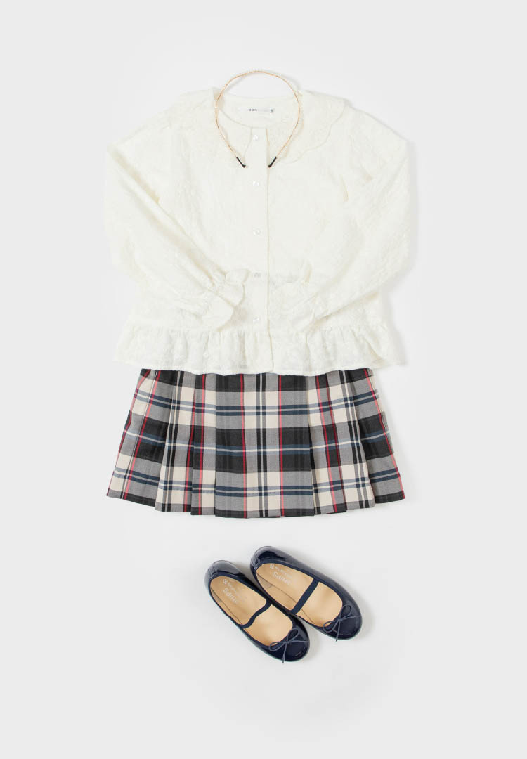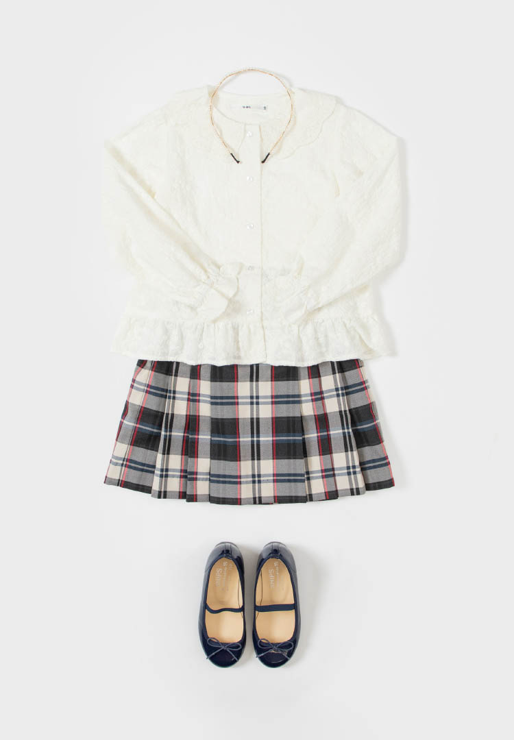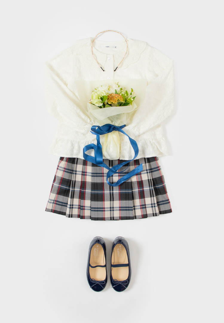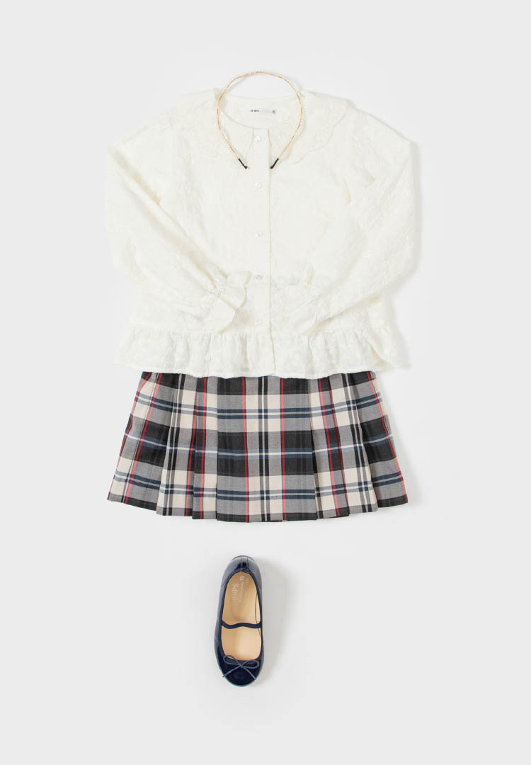 お花の刺しゅうが全体に入ったブラウス。袖や襟はちがう柄になっていて、シンプルなんだけど近くでみるとこだわりがいっぱい。末広がりなペプラム風の裾と赤いチェックのプリーツスカートがつながって、上品さとかわいらしさをひとつに。