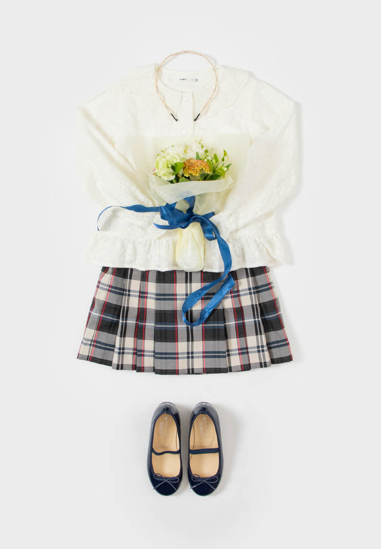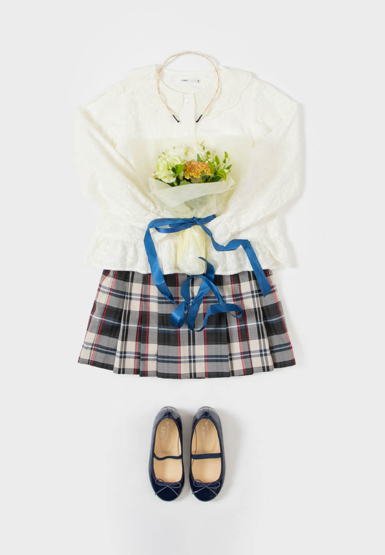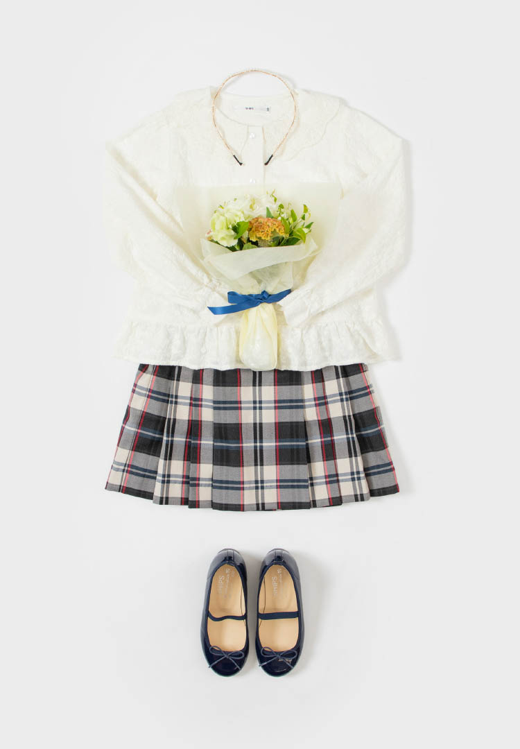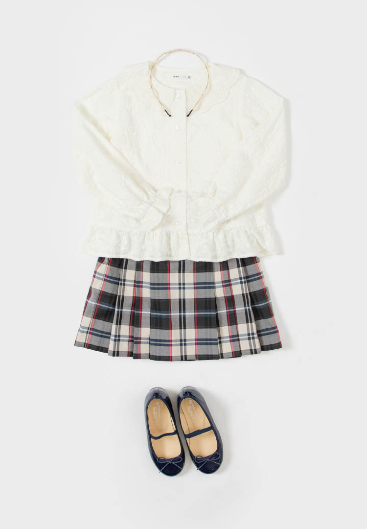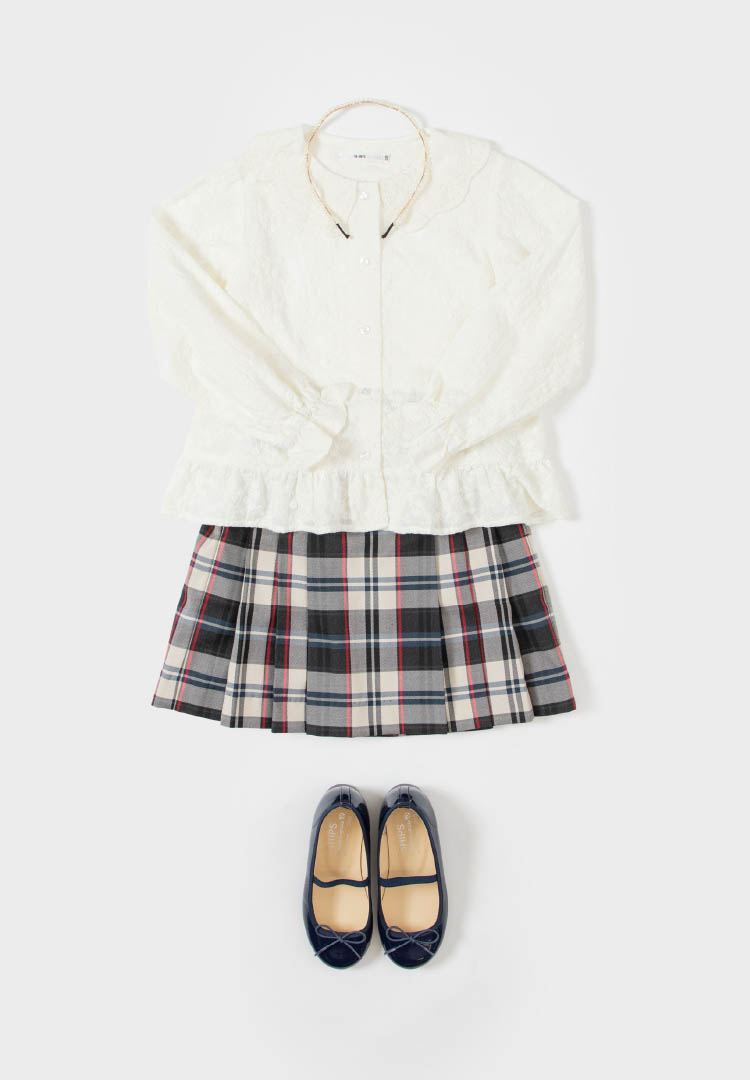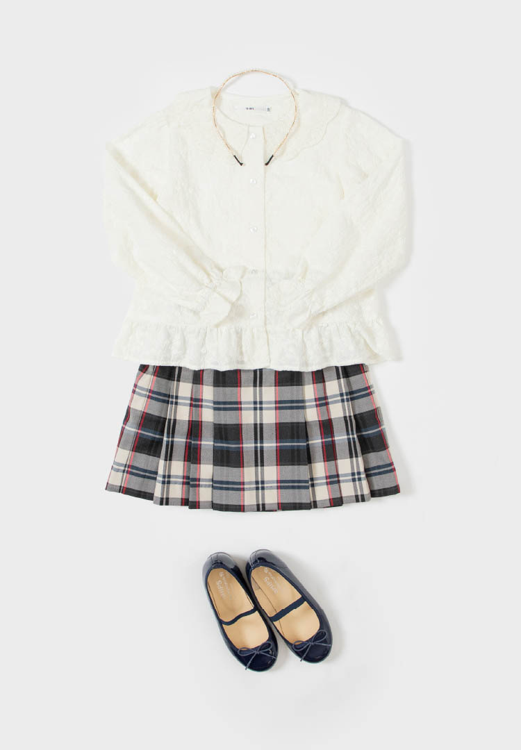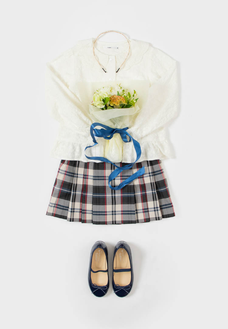お花の刺しゅうが全体に入ったブラウス。袖や襟はちがう柄になっていて、シンプルなんだけど近くでみるとこだわりがいっぱい。末広がりなペプラム風の裾と赤いチェックのプリーツスカートがつながって、上品さとかわいらしさをひとつに。
