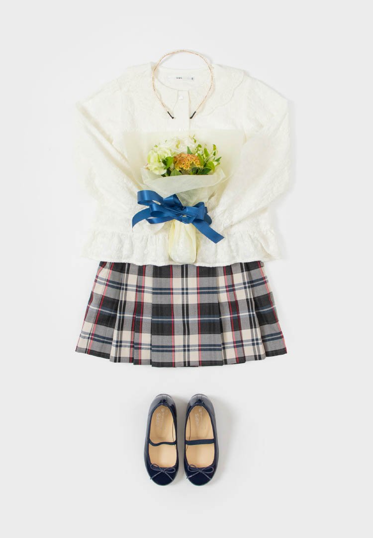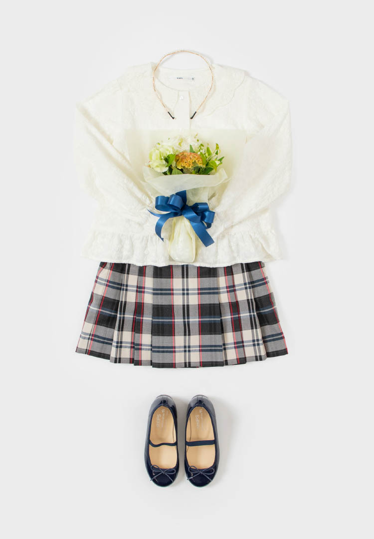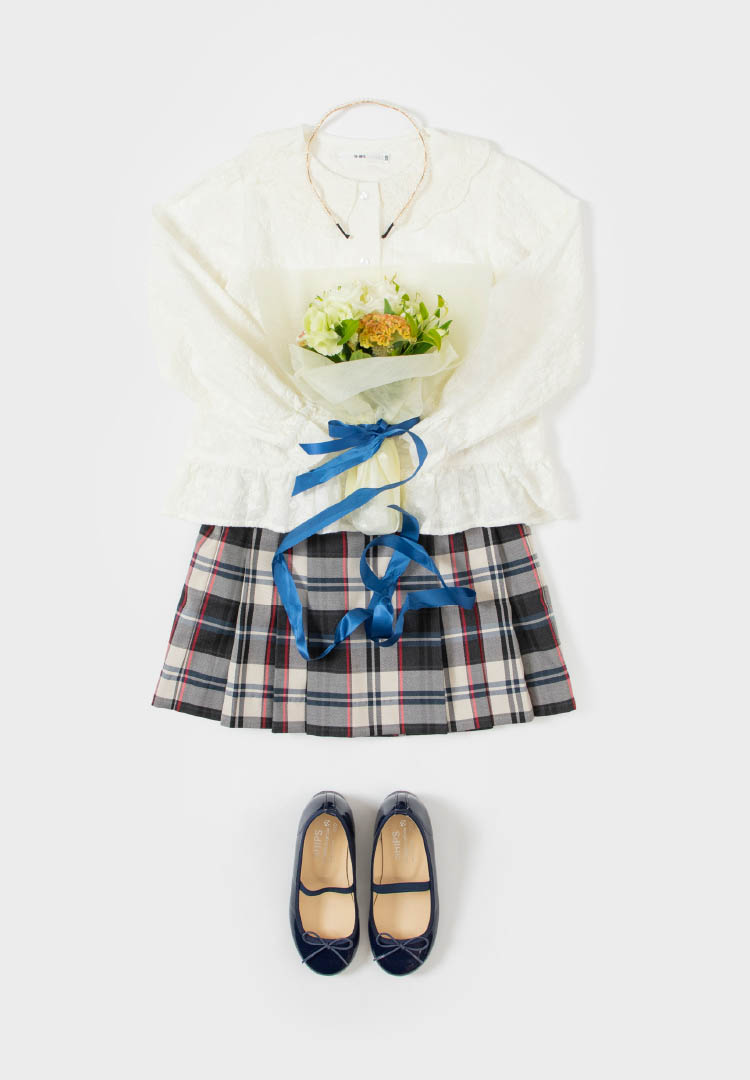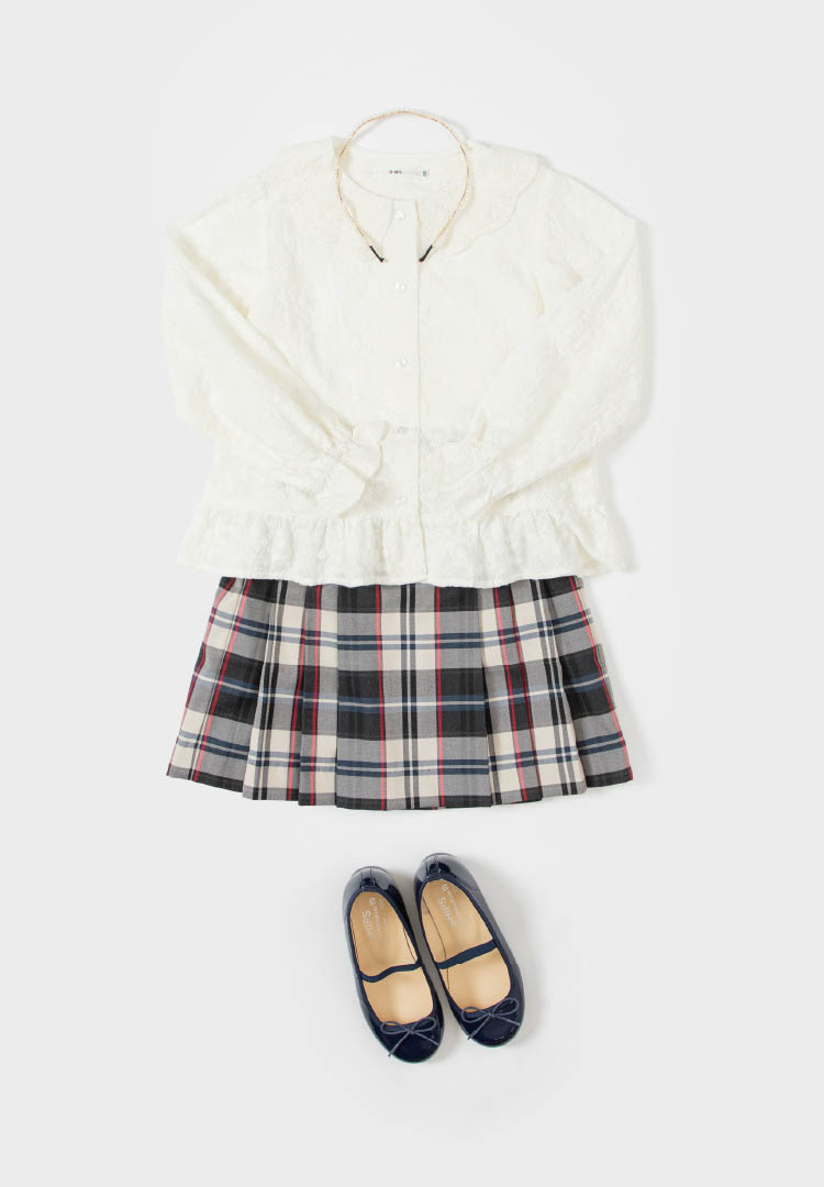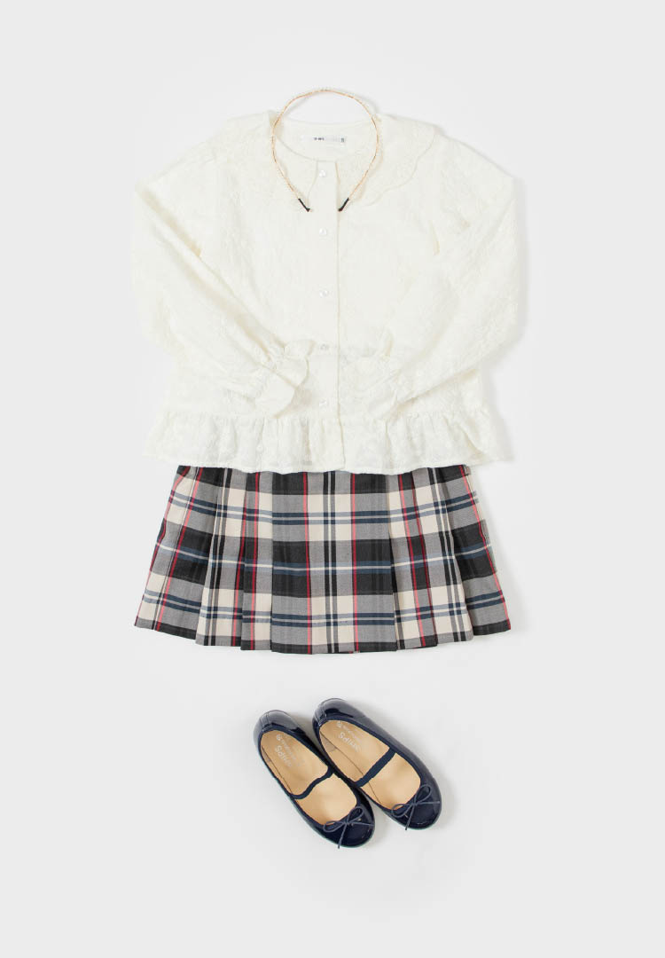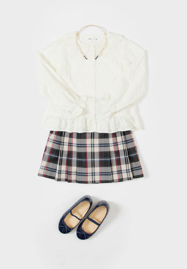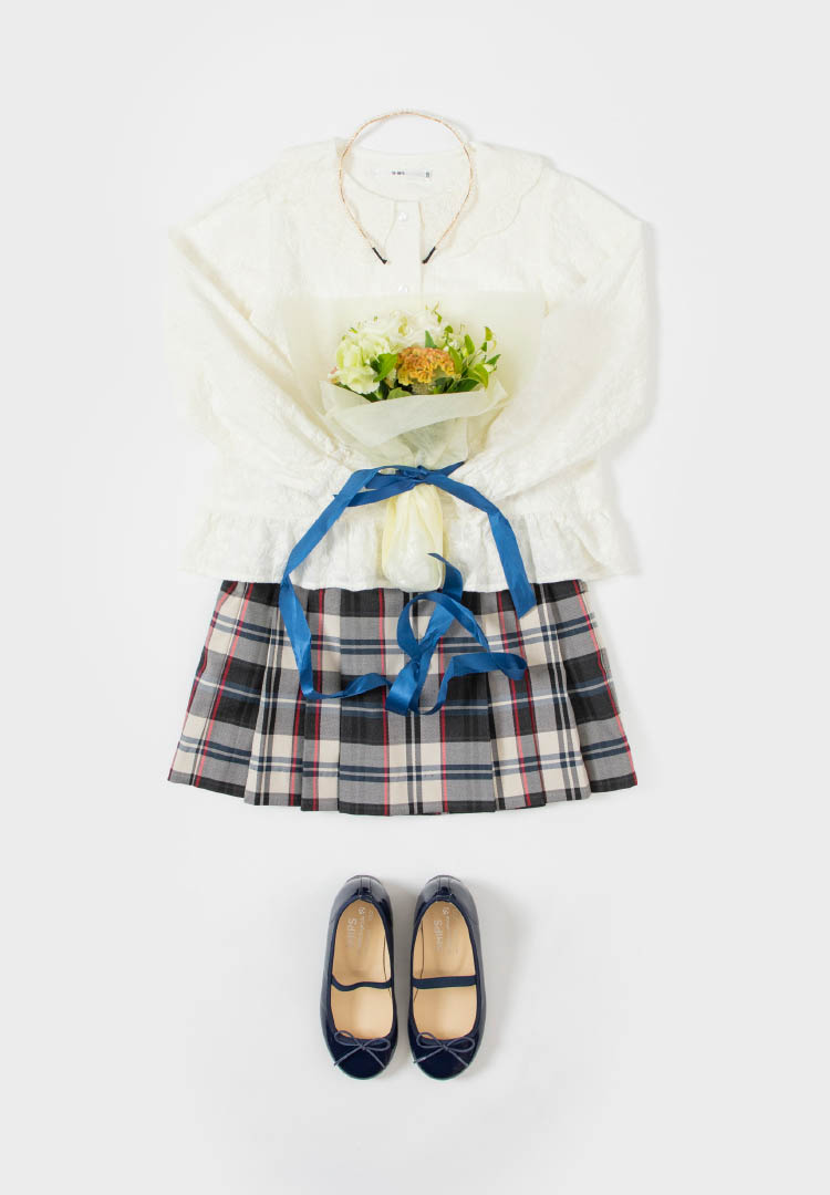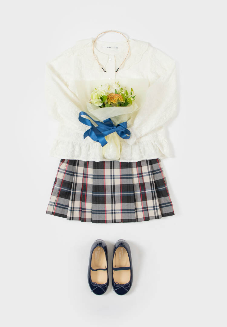 お花の刺しゅうが全体に入ったブラウス。袖や襟はちがう柄になっていて、シンプルなんだけど近くでみるとこだわりがいっぱい。末広がりなペプラム風の裾と赤いチェックのプリーツスカートがつながって、上品さとかわいらしさをひとつに。