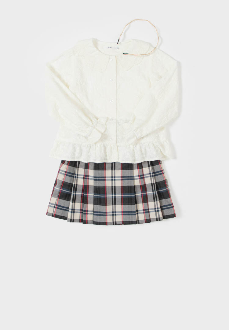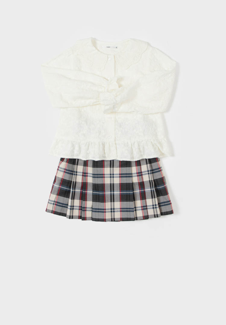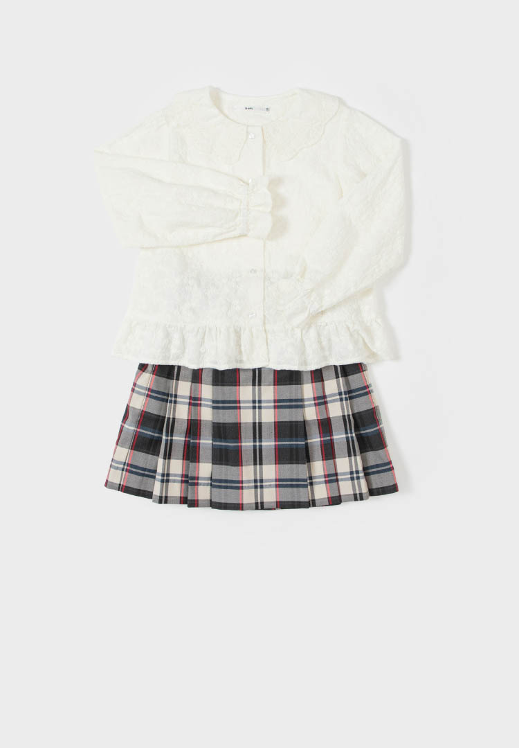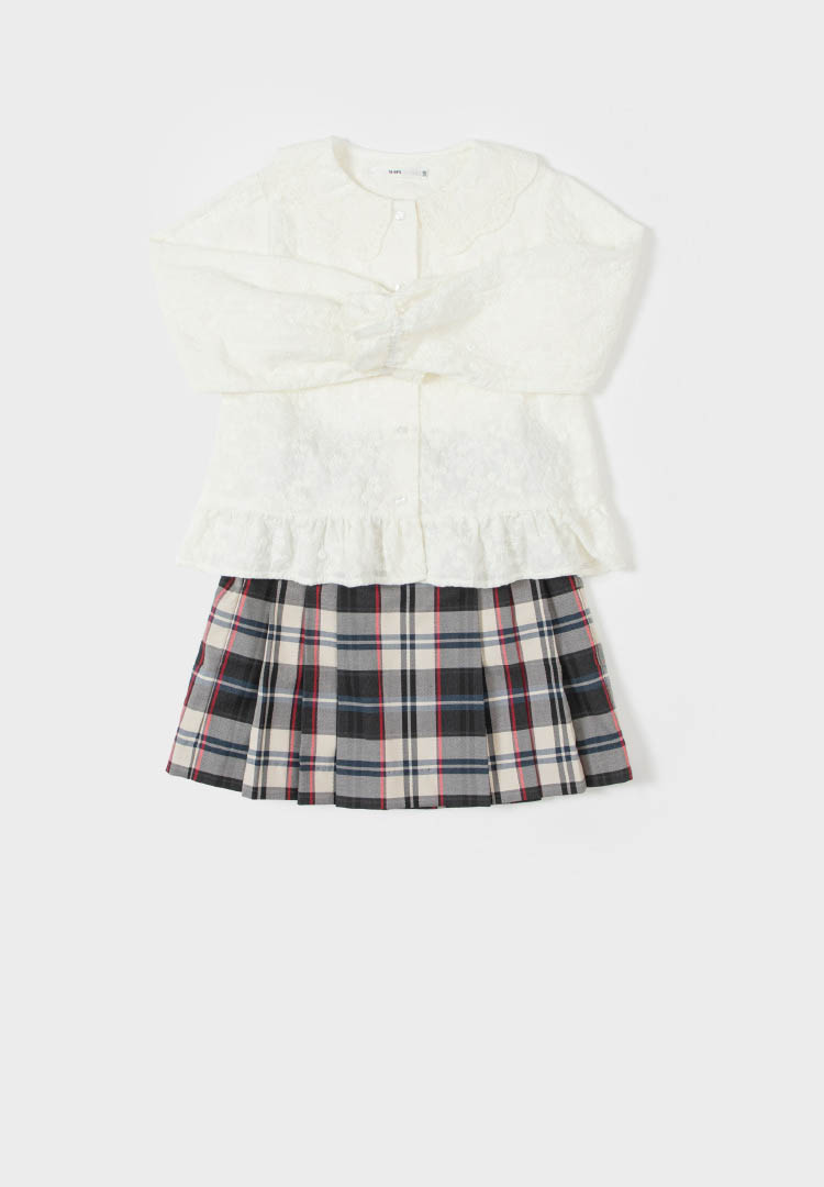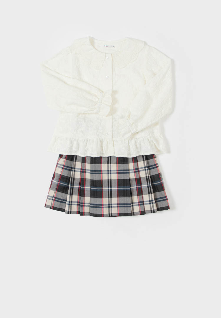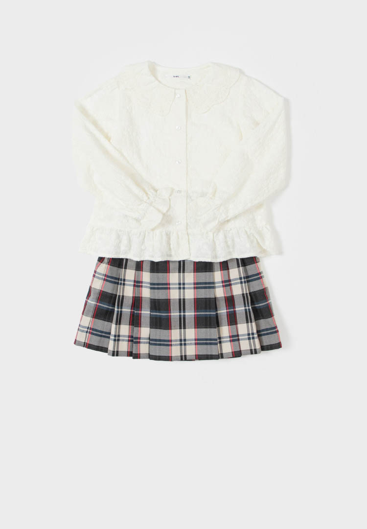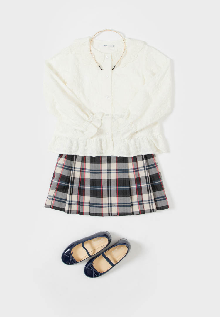 お花の刺しゅうが全体に入ったブラウス。袖や襟はちがう柄になっていて、シンプルなんだけど近くでみるとこだわりがいっぱい。末広がりなペプラム風の裾と赤いチェックのプリーツスカートがつながって、上品さとかわいらしさをひとつに。