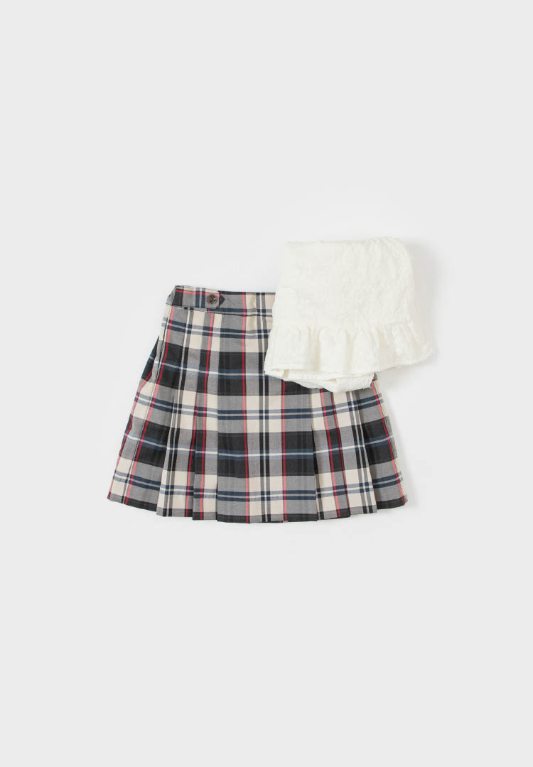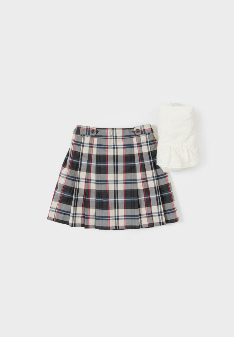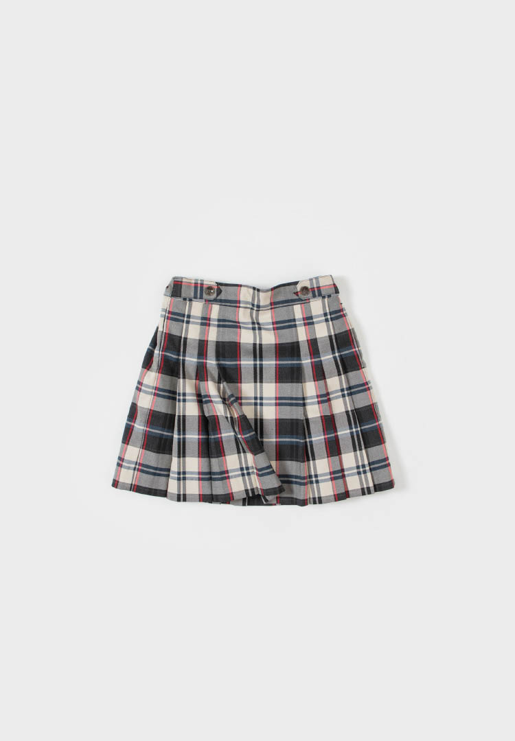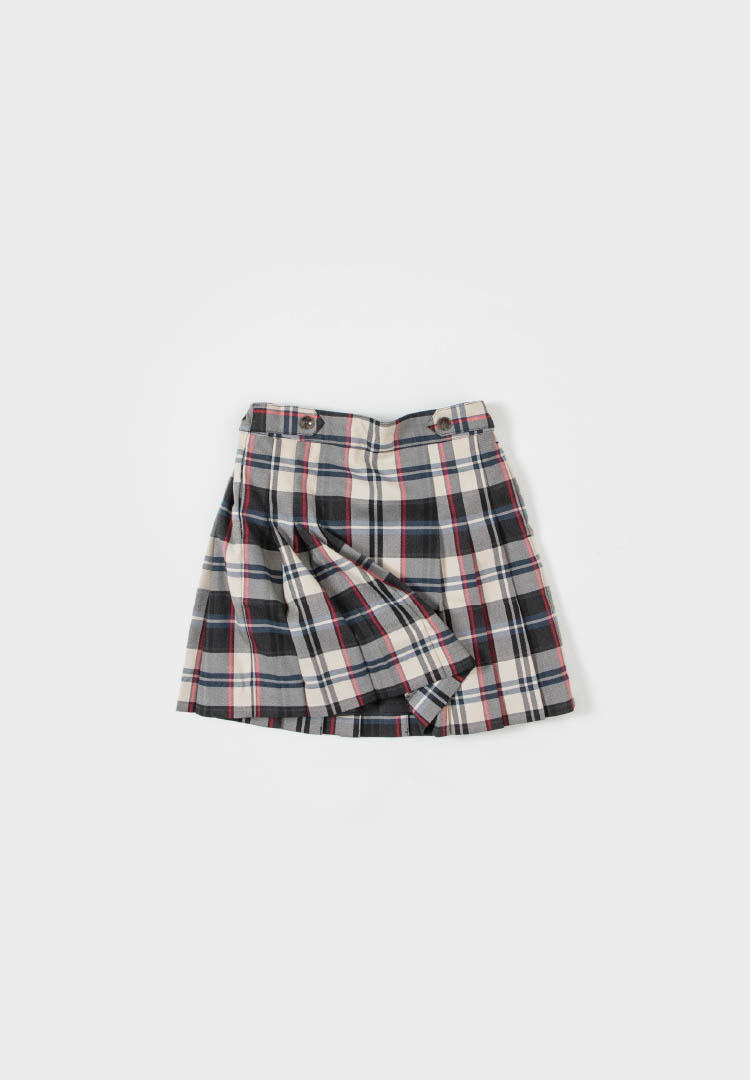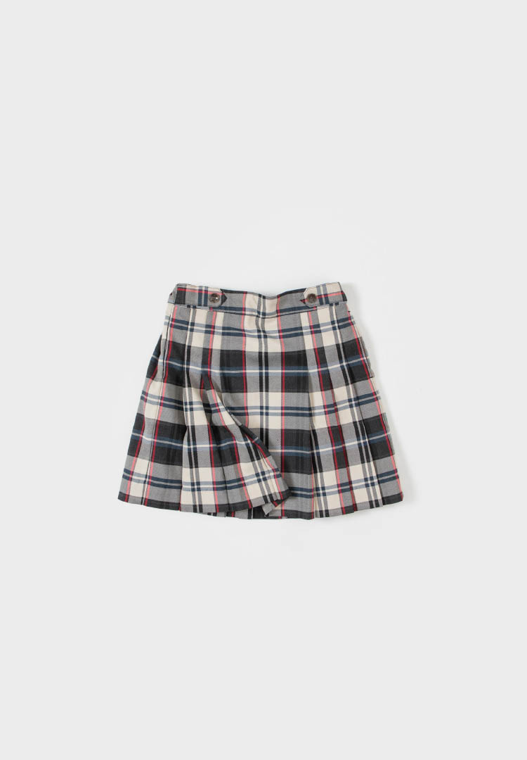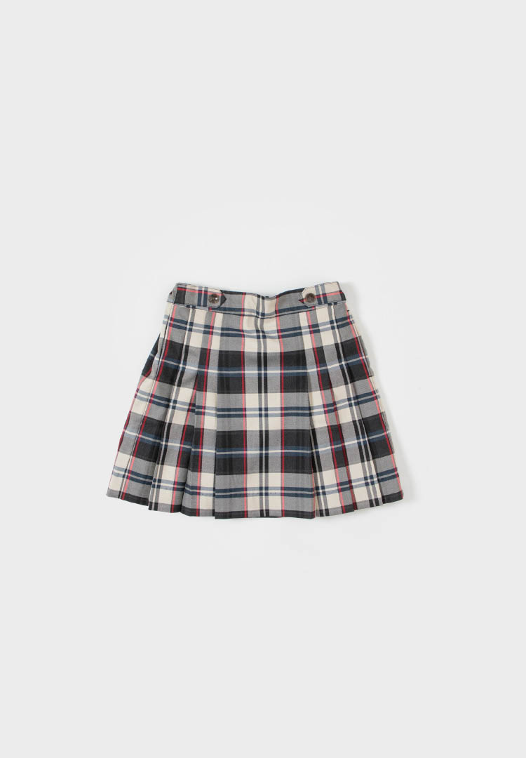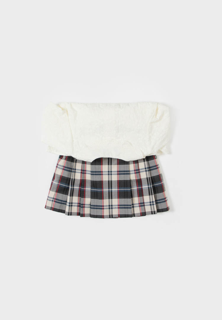 お花の刺しゅうが全体に入ったブラウス。袖や襟はちがう柄になっていて、シンプルなんだけど近くでみるとこだわりがいっぱい。末広がりなペプラム風の裾と赤いチェックのプリーツスカートがつながって、上品さとかわいらしさをひとつに。