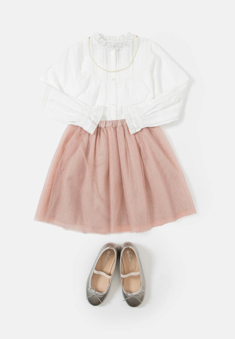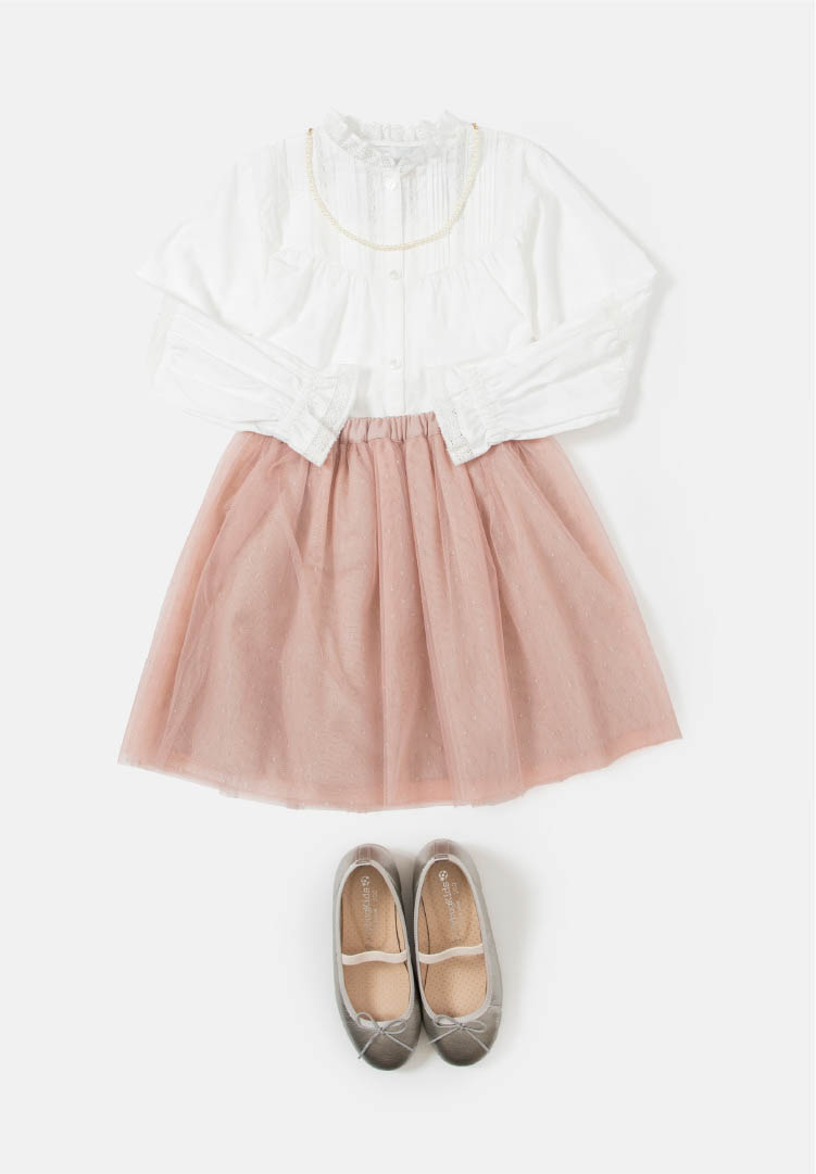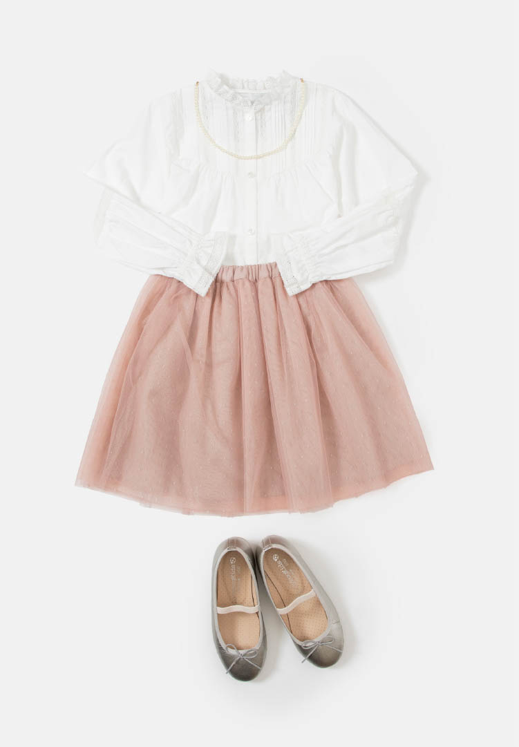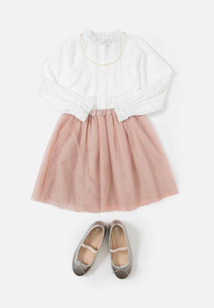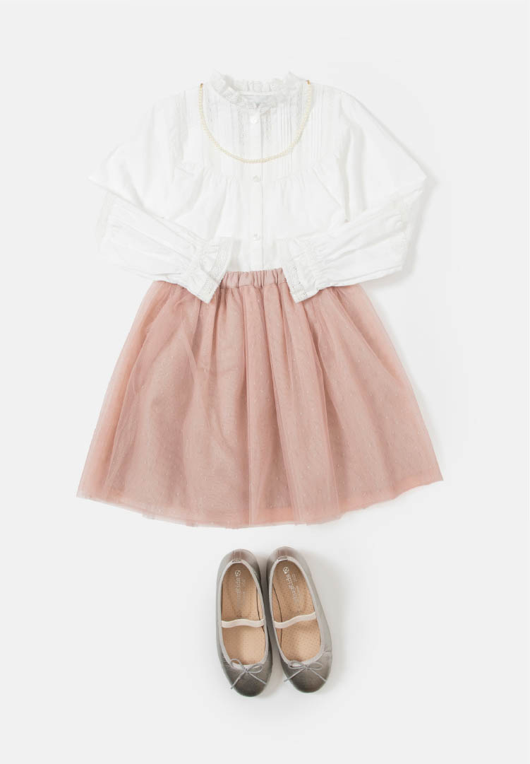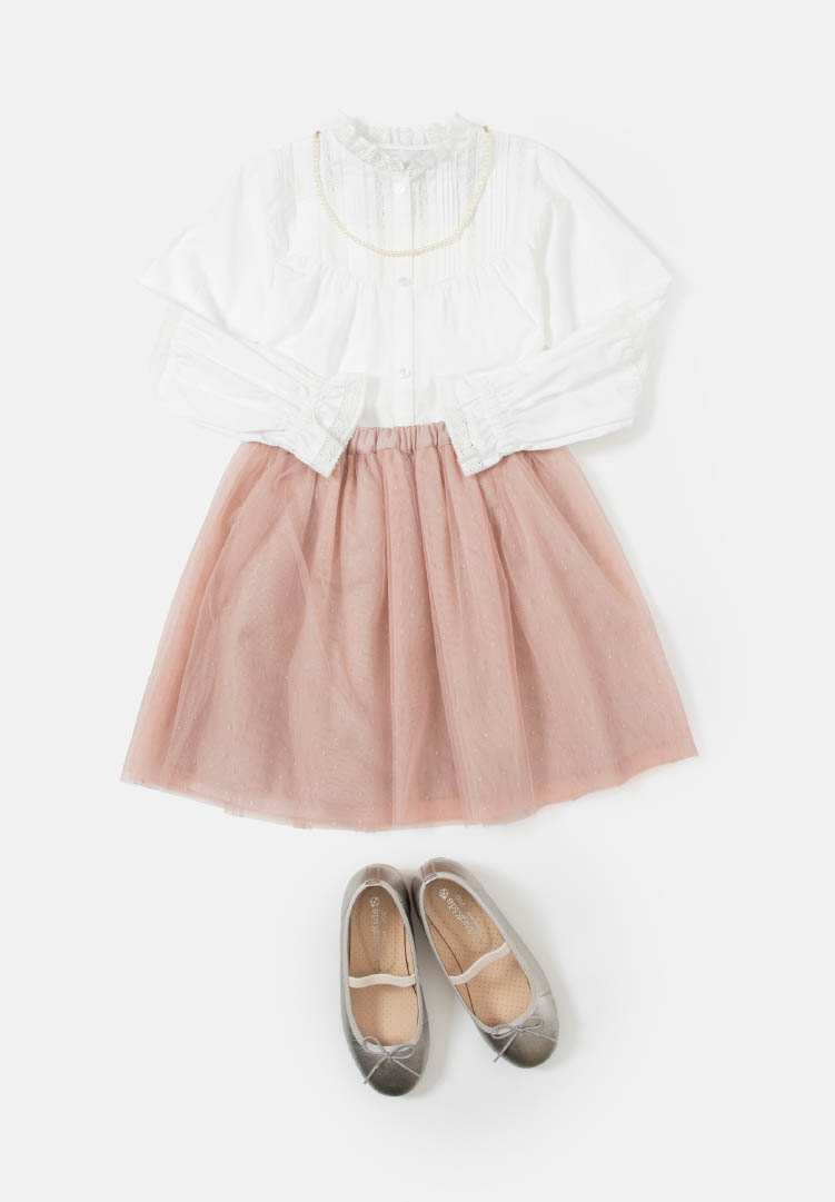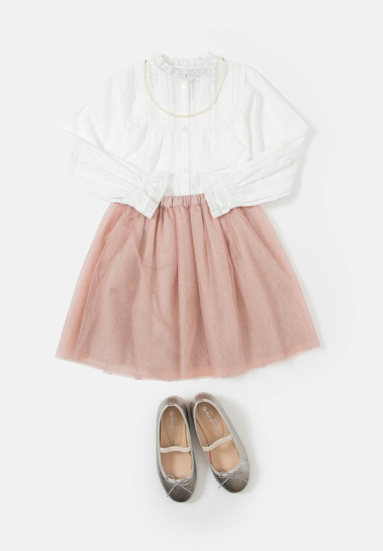 ラメがきらめくチュールスカートは、ドキドキの発表会だってロマンティックな時間に変えてくれる。襟や袖にフリルがついたブラウスは、柔らかな生地がふわっとしたシルエットに。女の子らしさいっぱいのスタイルに、ネックレスで可憐さを添えて。