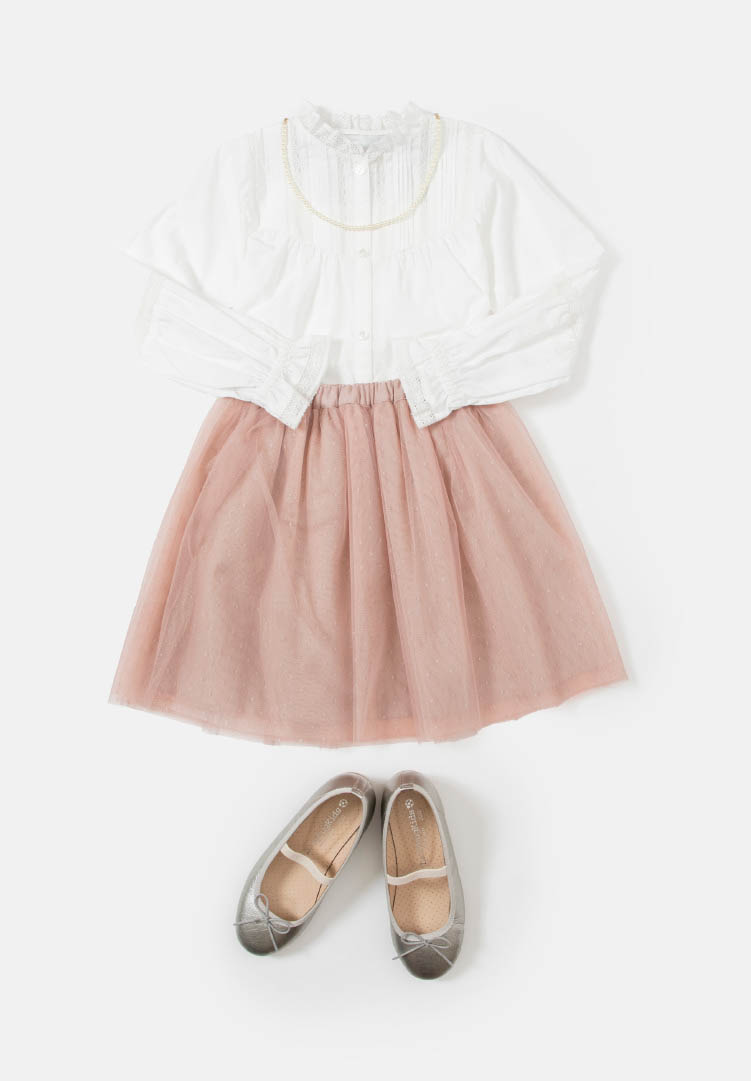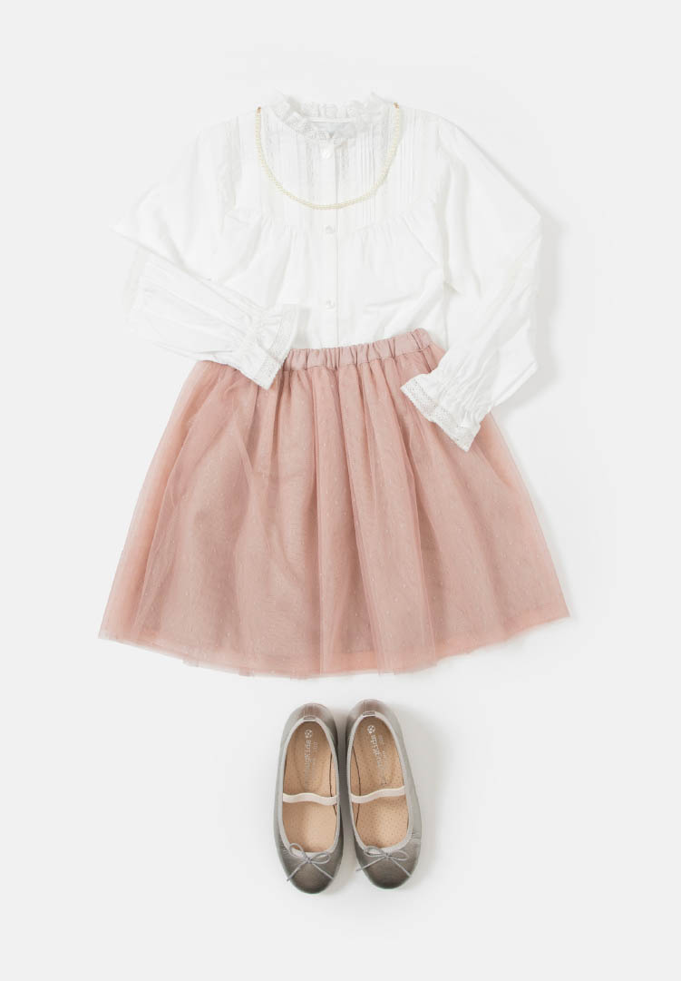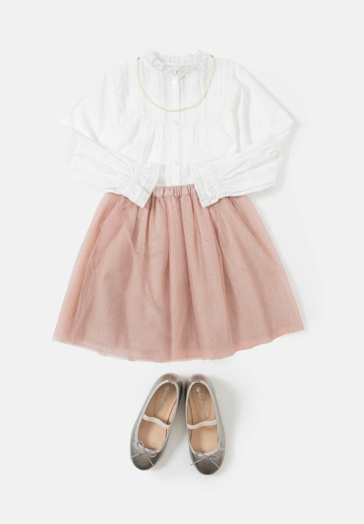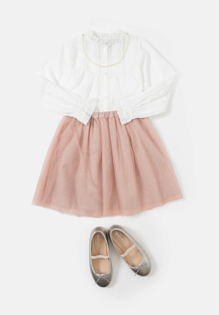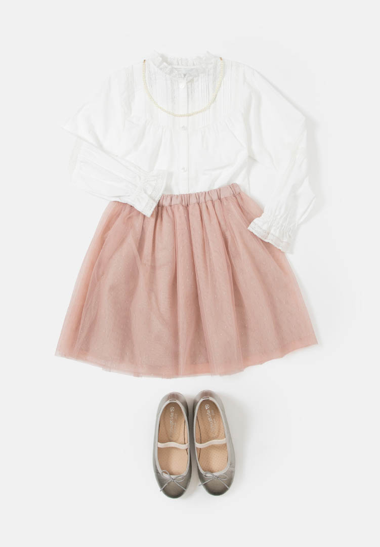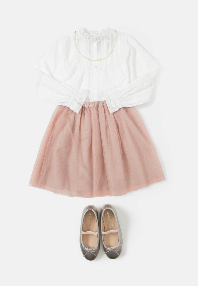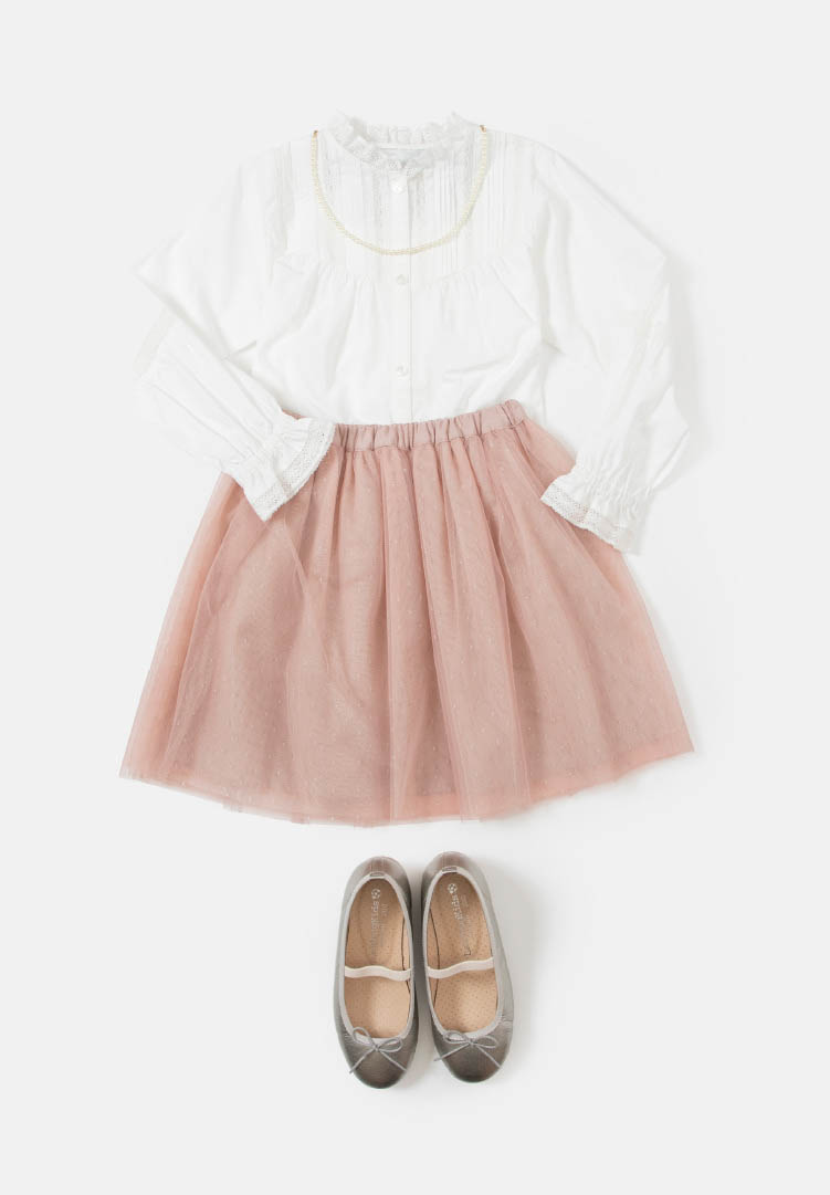 ラメがきらめくチュールスカートは、ドキドキの発表会だってロマンティックな時間に変えてくれる。襟や袖にフリルがついたブラウスは、柔らかな生地がふわっとしたシルエットに。女の子らしさいっぱいのスタイルに、ネックレスで可憐さを添えて。