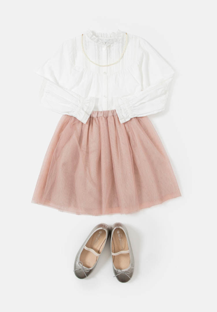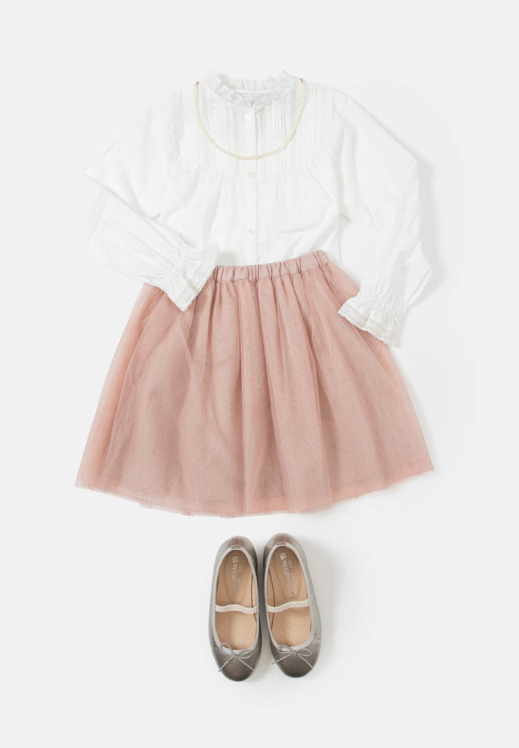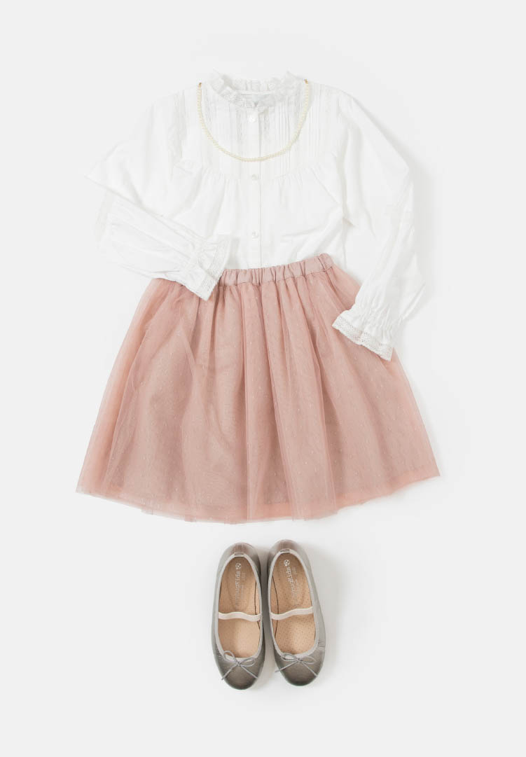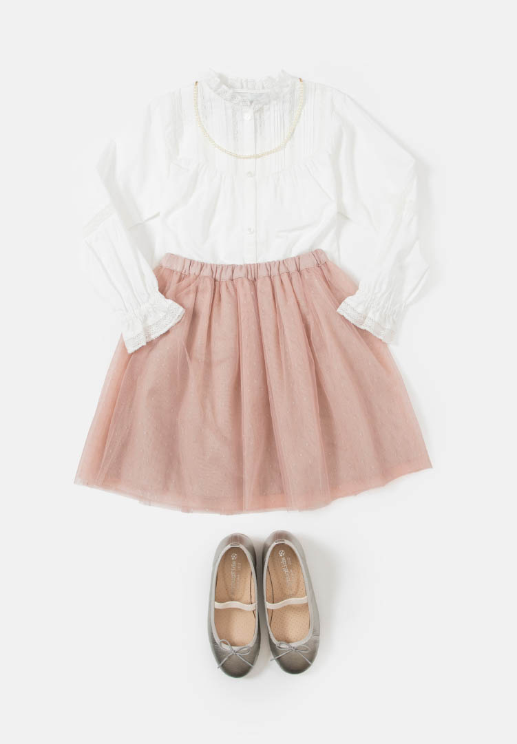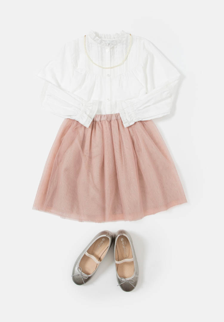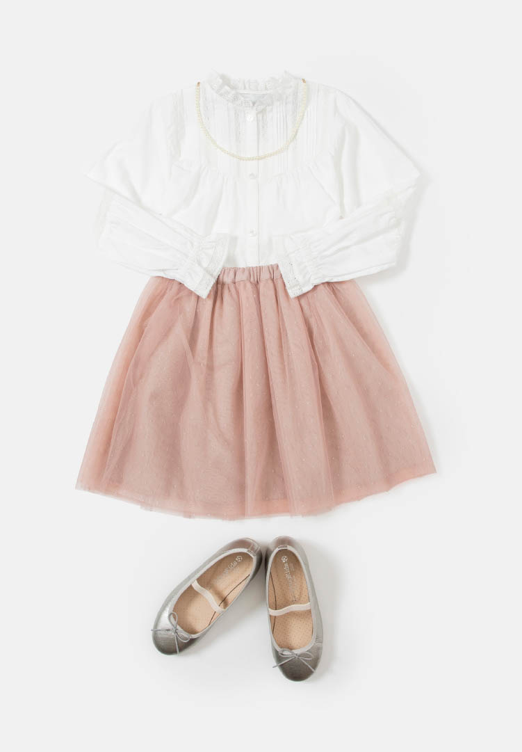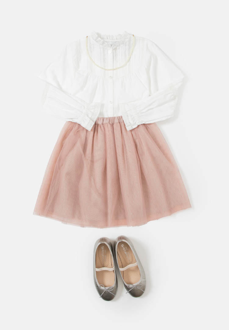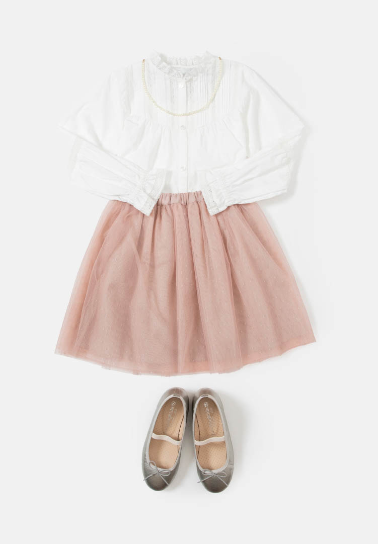 ラメがきらめくチュールスカートは、ドキドキの発表会だってロマンティックな時間に変えてくれる。襟や袖にフリルがついたブラウスは、柔らかな生地がふわっとしたシルエットに。女の子らしさいっぱいのスタイルに、ネックレスで可憐さを添えて。
