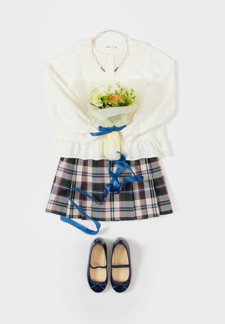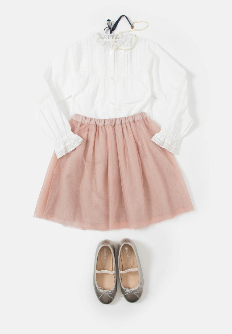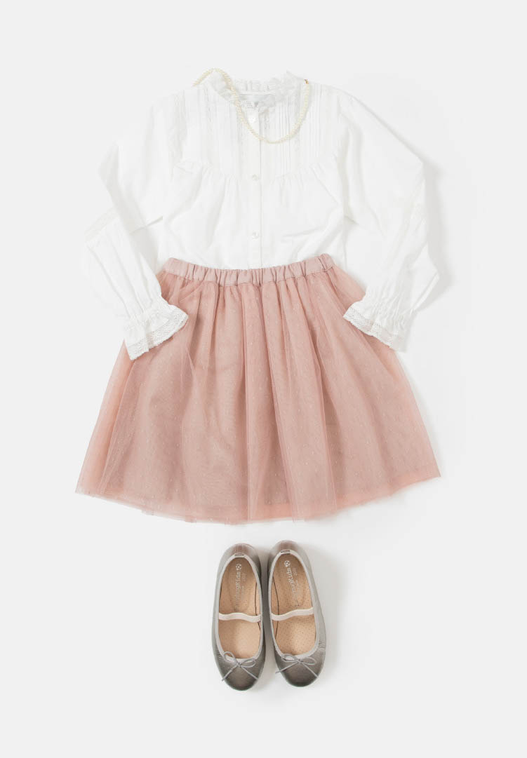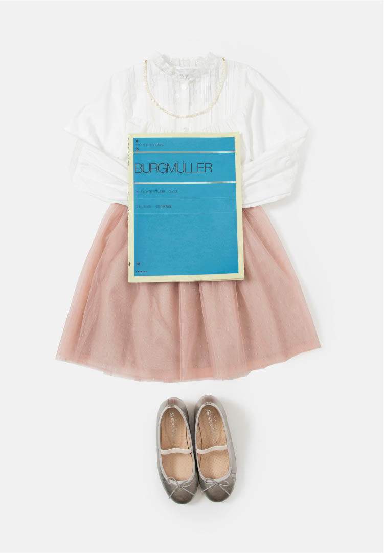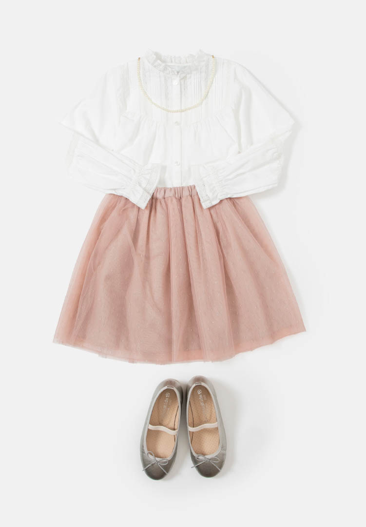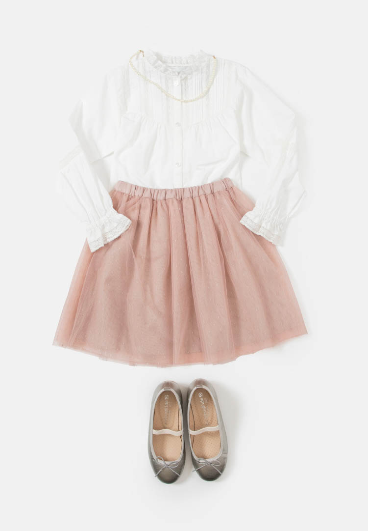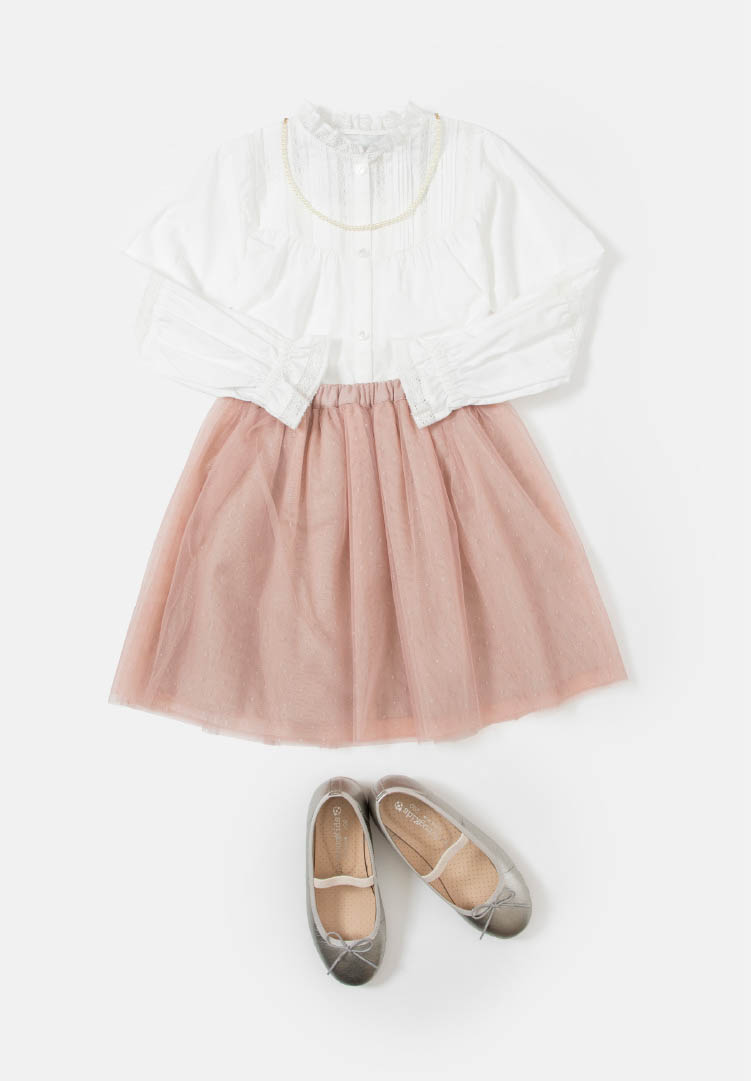 ラメがきらめくチュールスカートは、ドキドキの発表会だってロマンティックな時間に変えてくれる。襟や袖にフリルがついたブラウスは、柔らかな生地がふわっとしたシルエットに。女の子らしさいっぱいのスタイルに、ネックレスで可憐さを添えて。
