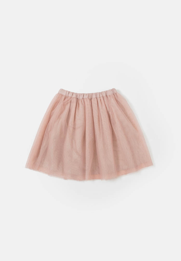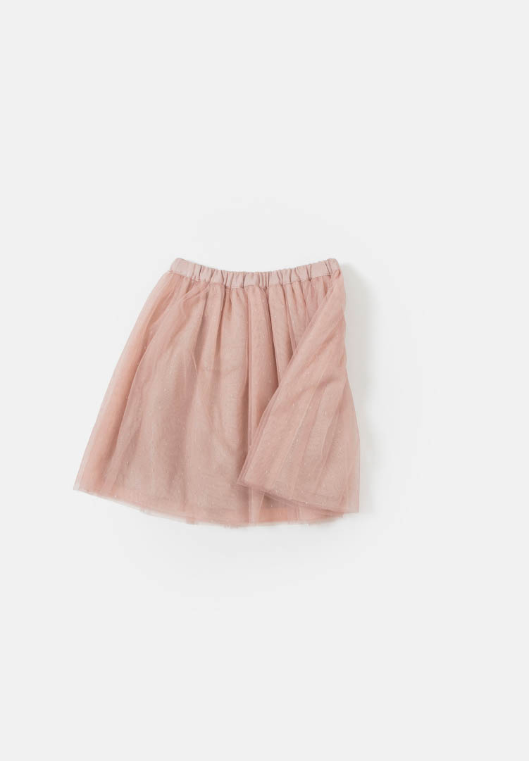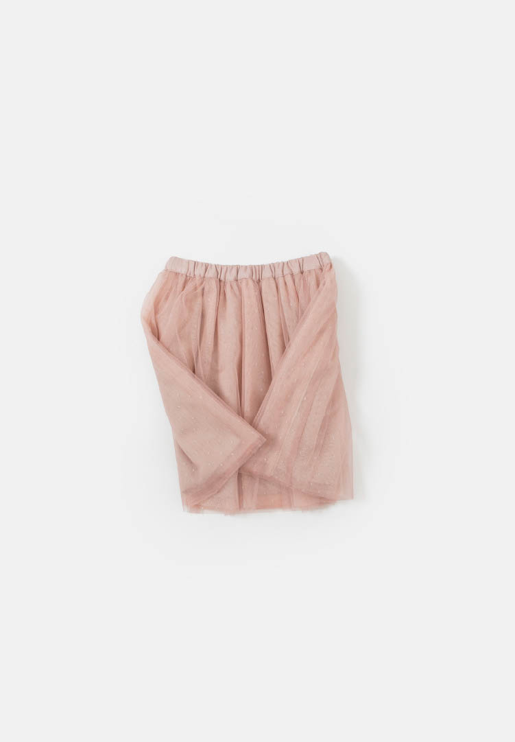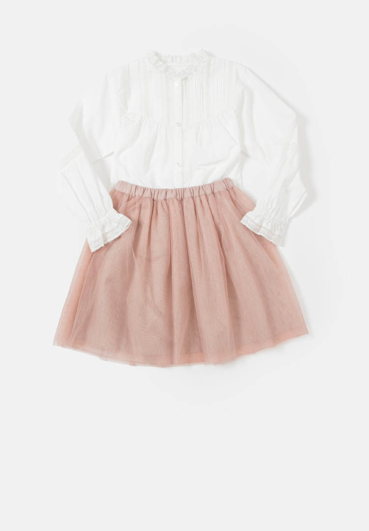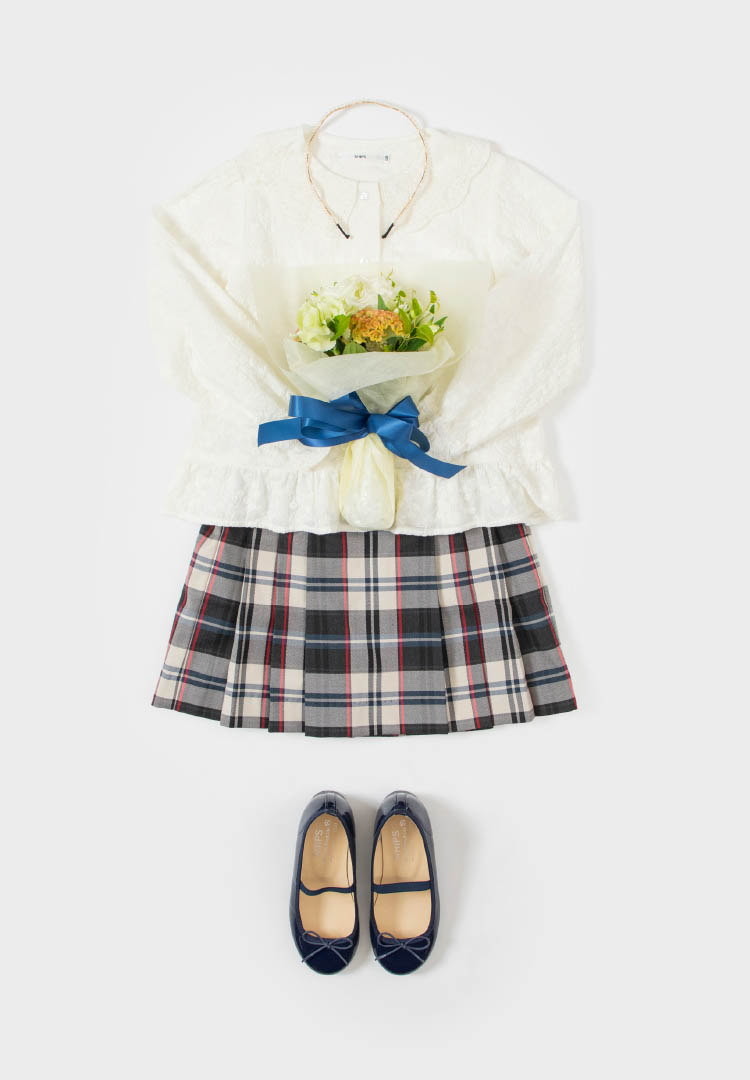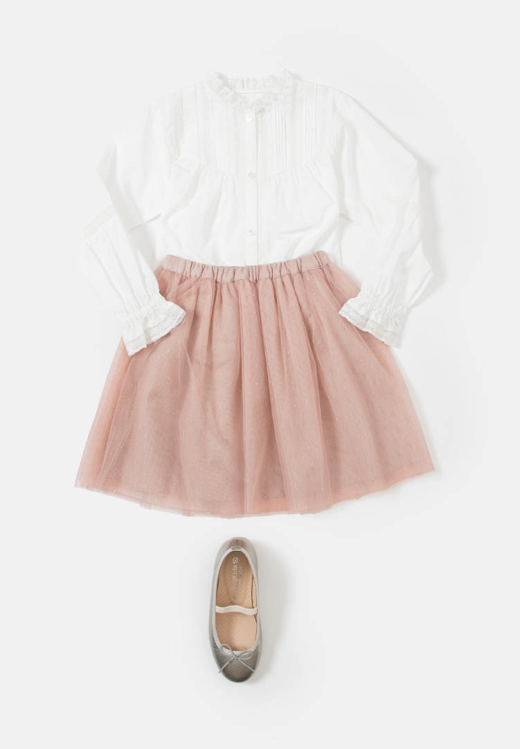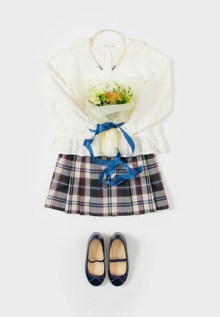 ラメがきらめくチュールスカートは、ドキドキの発表会だってロマンティックな時間に変えてくれる。襟や袖にフリルがついたブラウスは、柔らかな生地がふわっとしたシルエットに。女の子らしさいっぱいのスタイルに、ネックレスで可憐さを添えて。