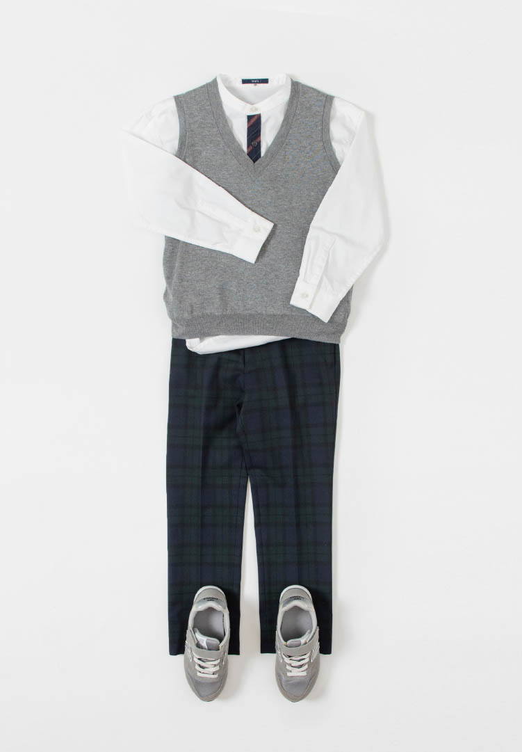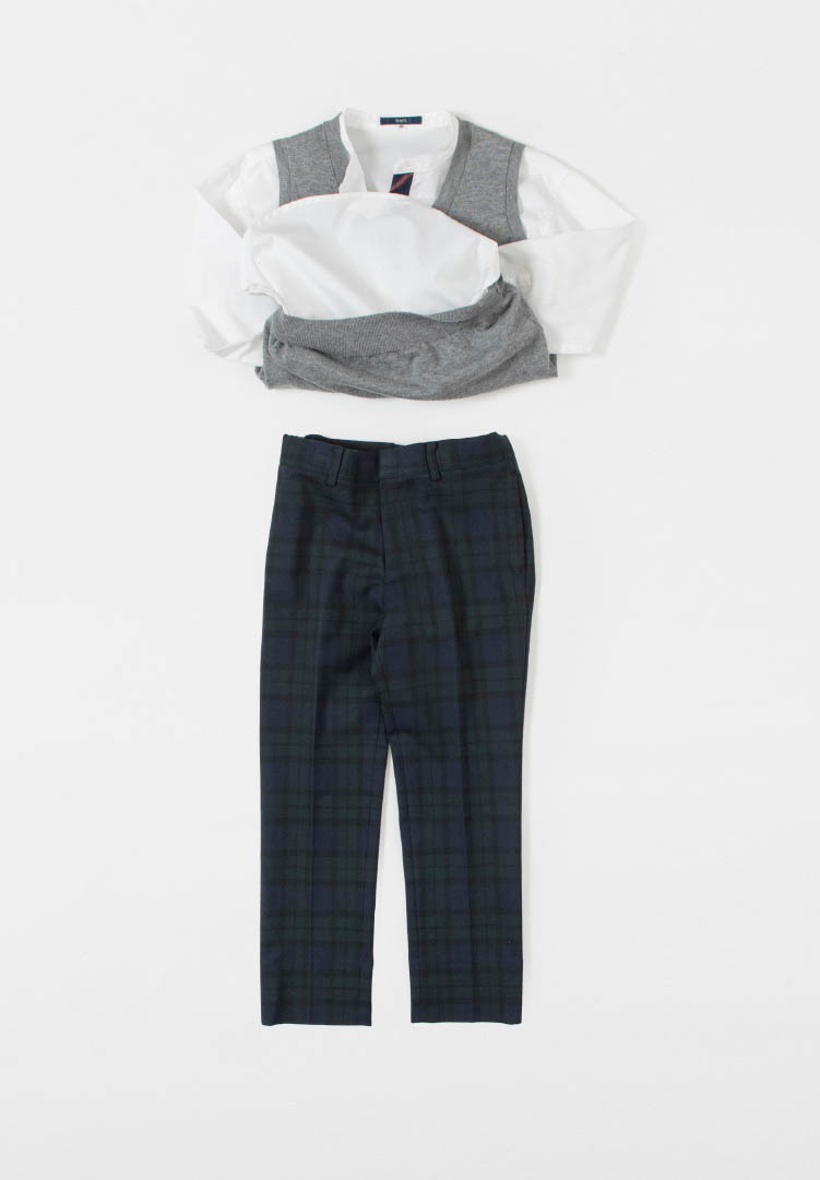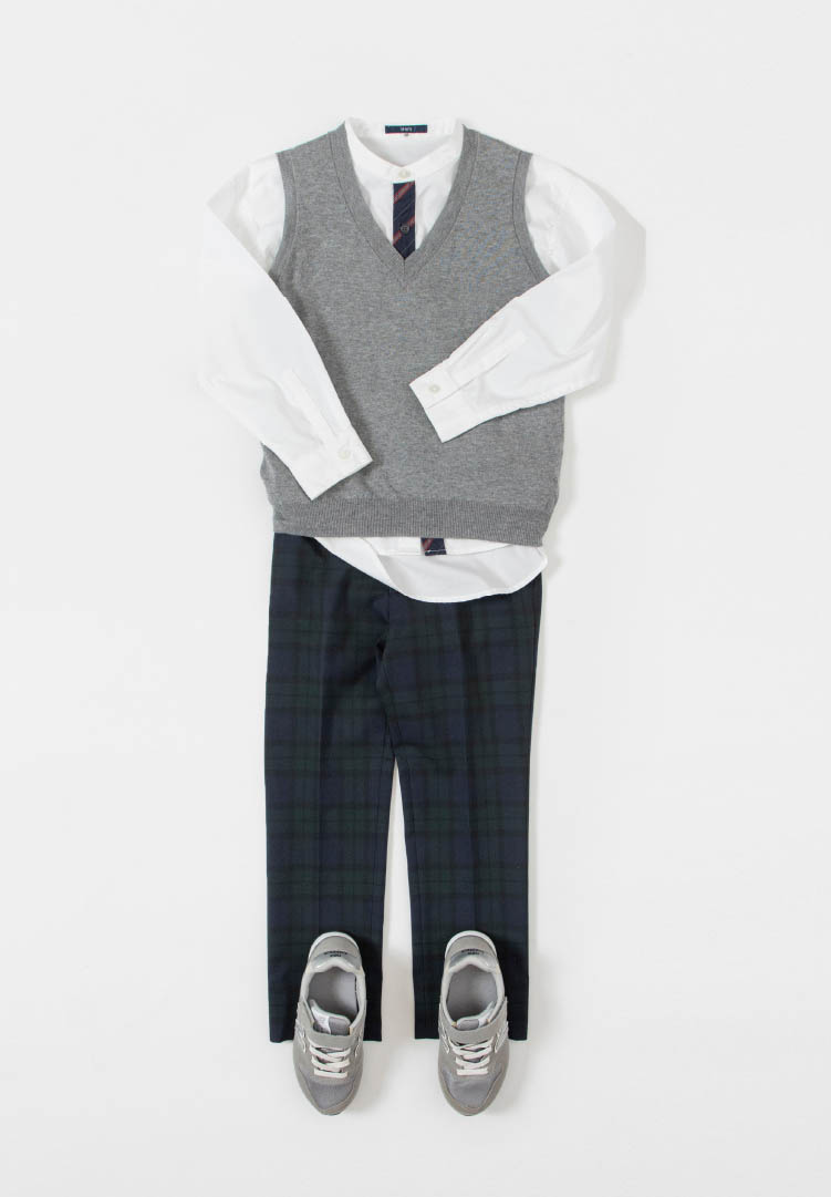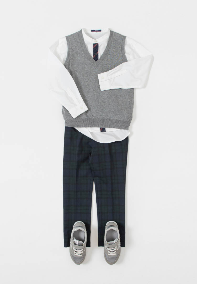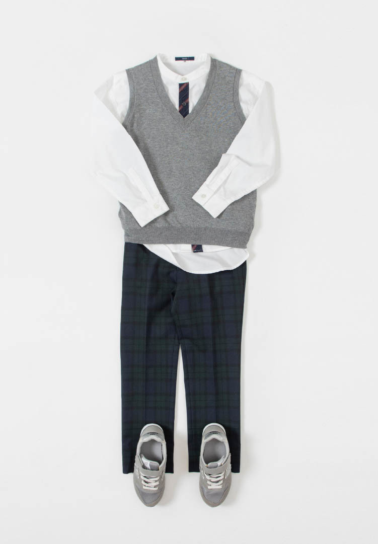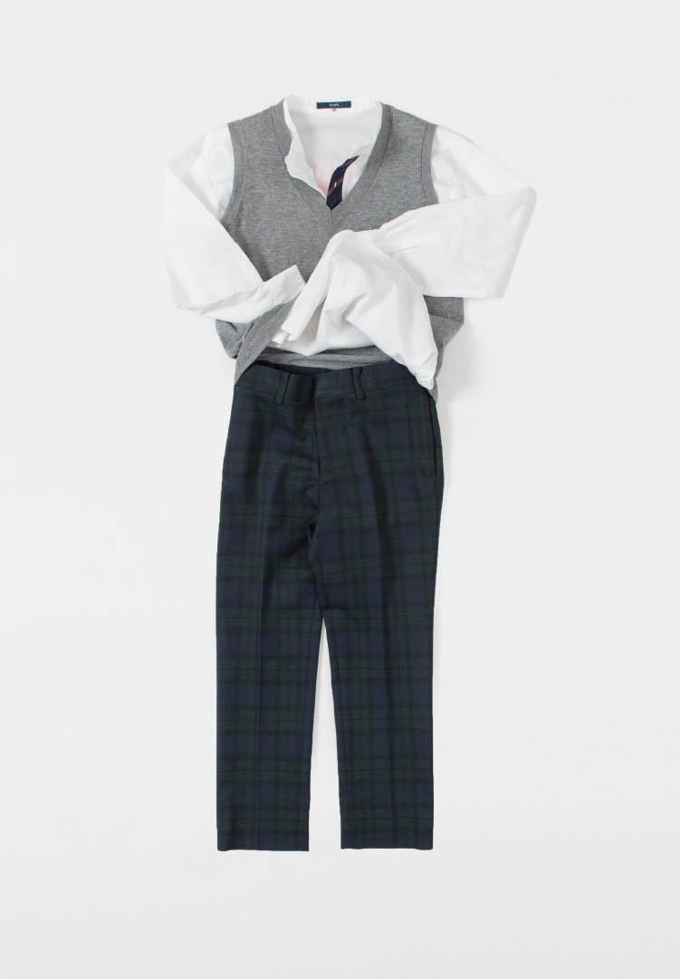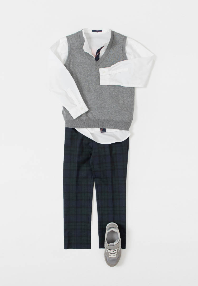 SHIPSが得意なブラックウォッチは、身につけるだけでお行儀よく見える魔法のパターン。シャツの前立てはネクタイに見えるような切り替えになっていて、ボタンを留めるだけでおしゃれに。グレーのベストとスニーカーでシックに色合わせ。