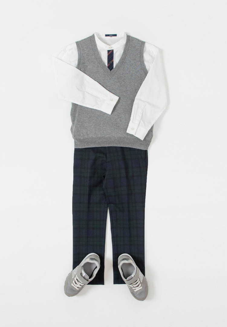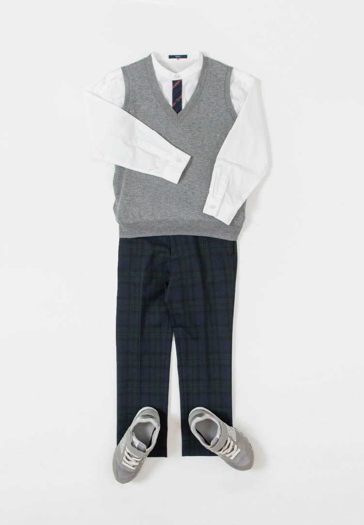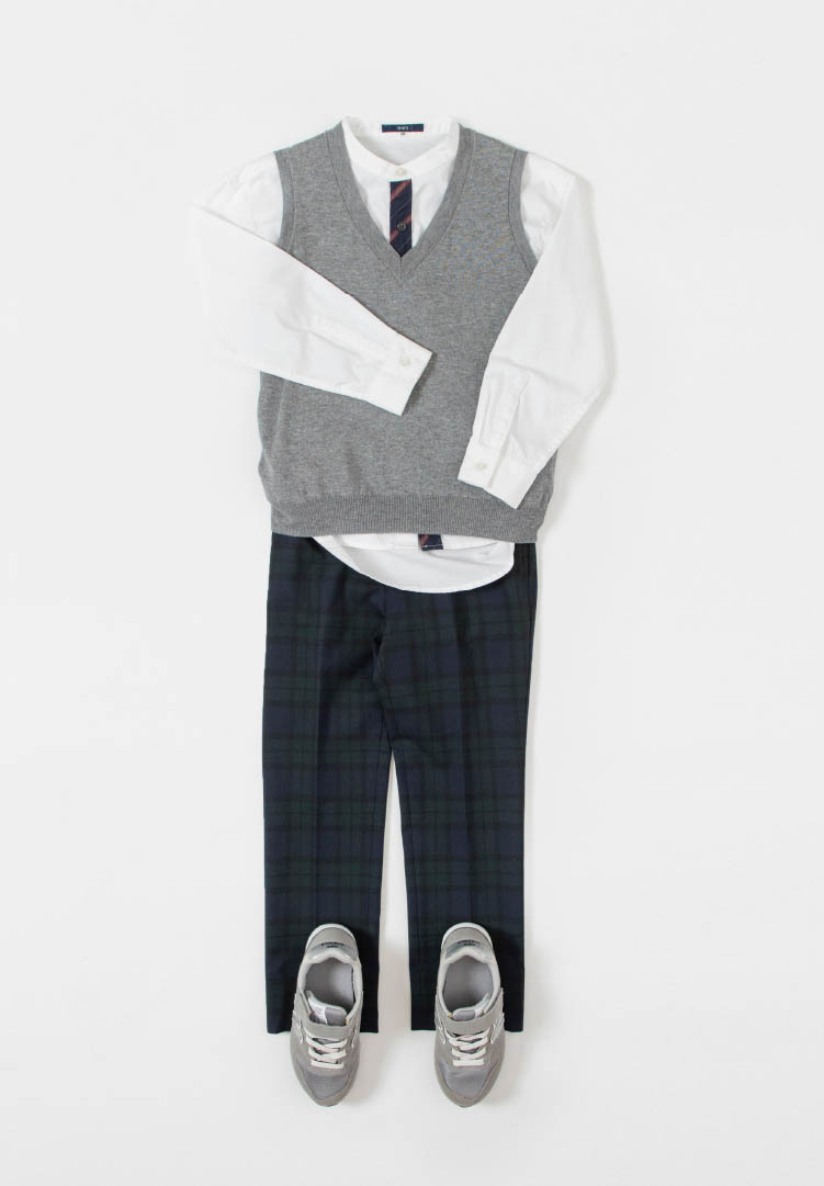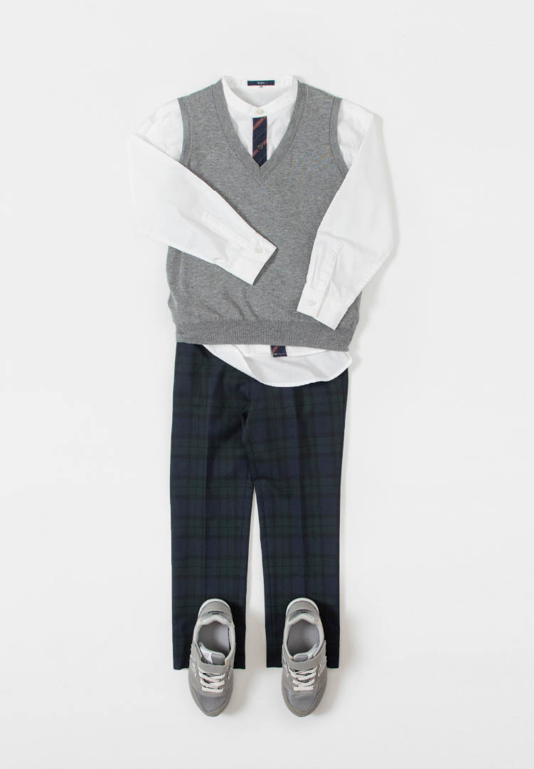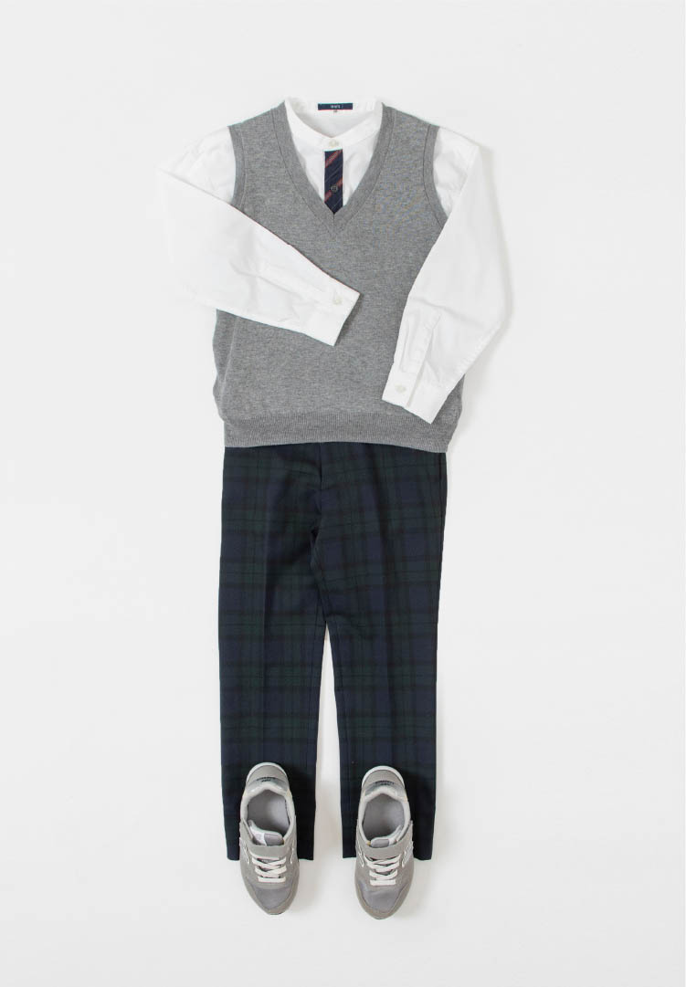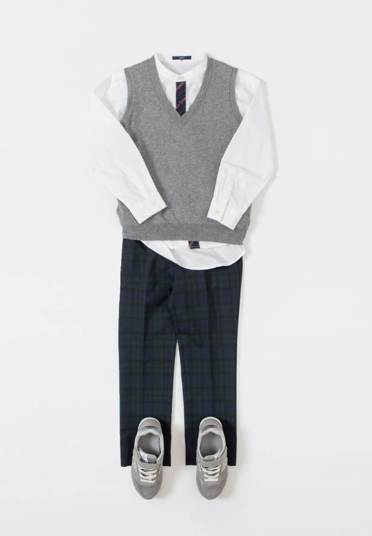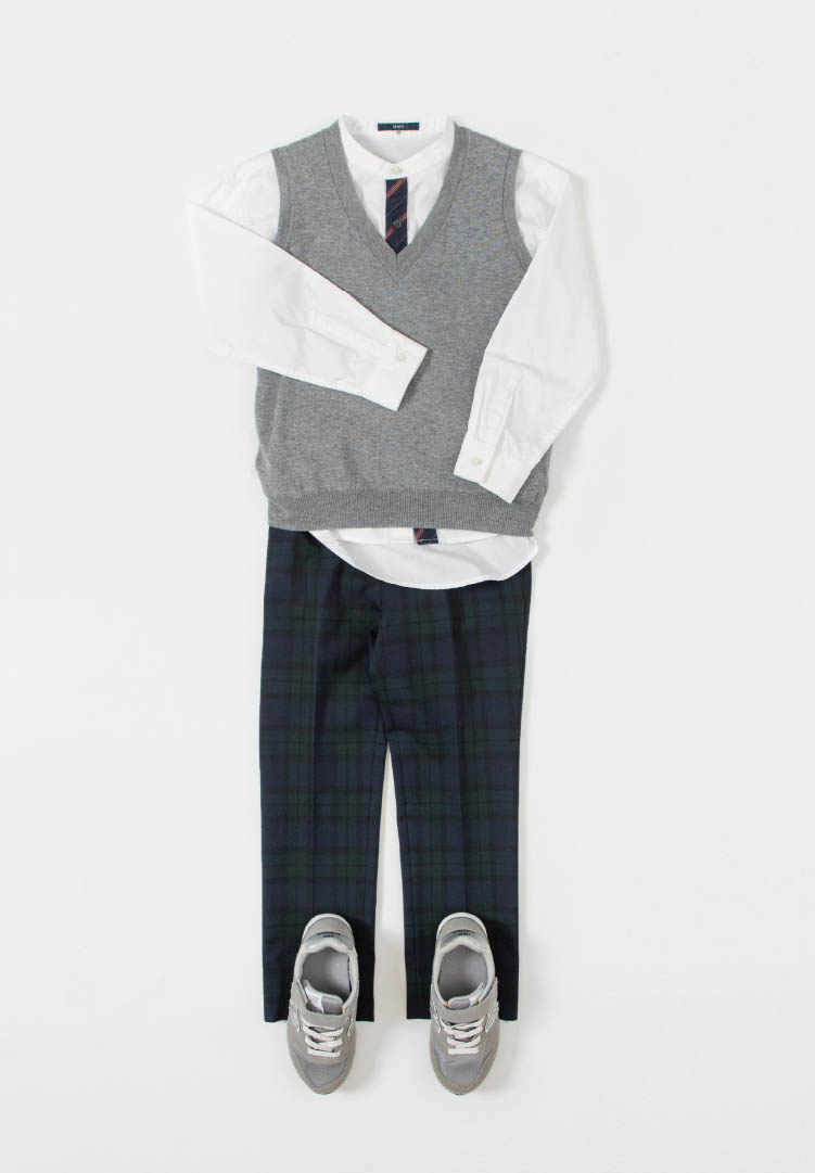 SHIPSが得意なブラックウォッチは、身につけるだけでお行儀よく見える魔法のパターン。シャツの前立てはネクタイに見えるような切り替えになっていて、ボタンを留めるだけでおしゃれに。グレーのベストとスニーカーでシックに色合わせ。