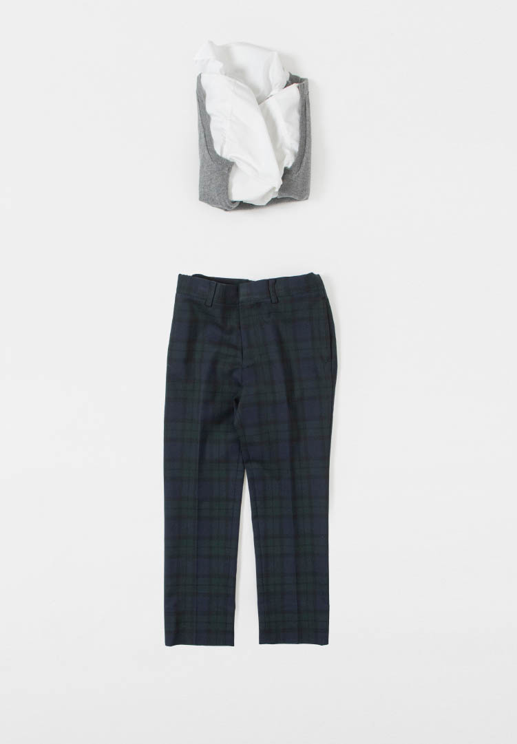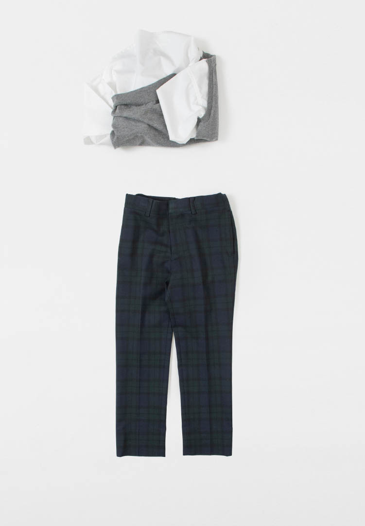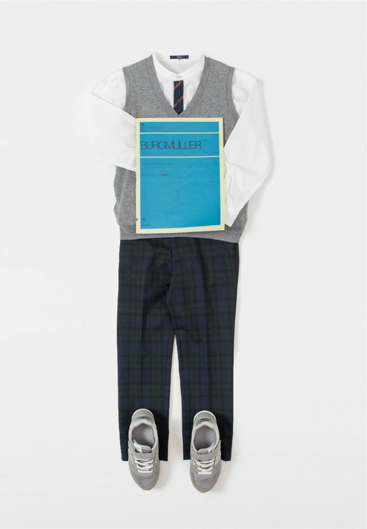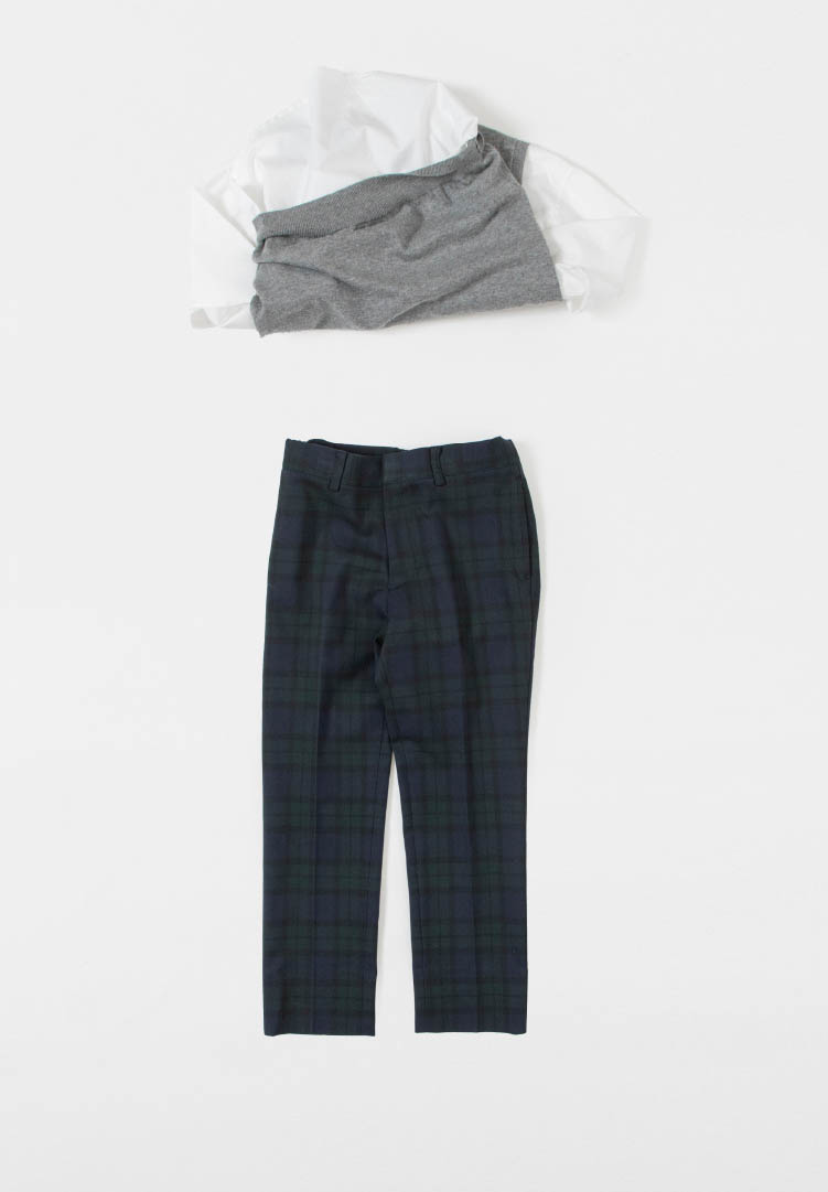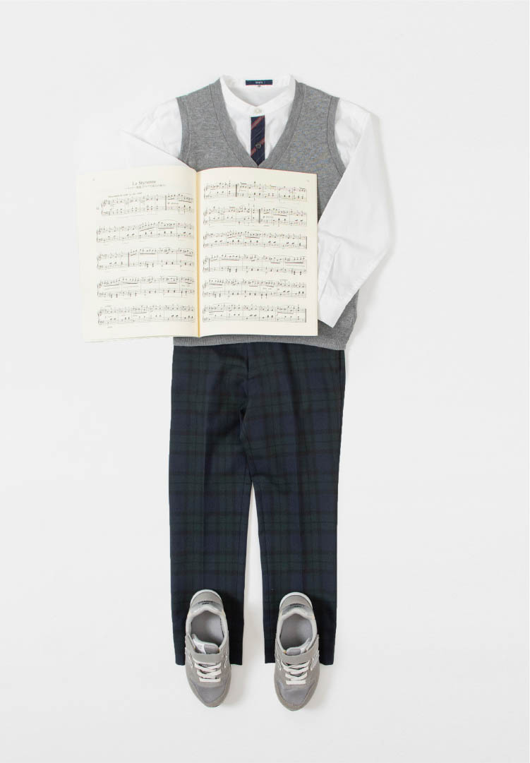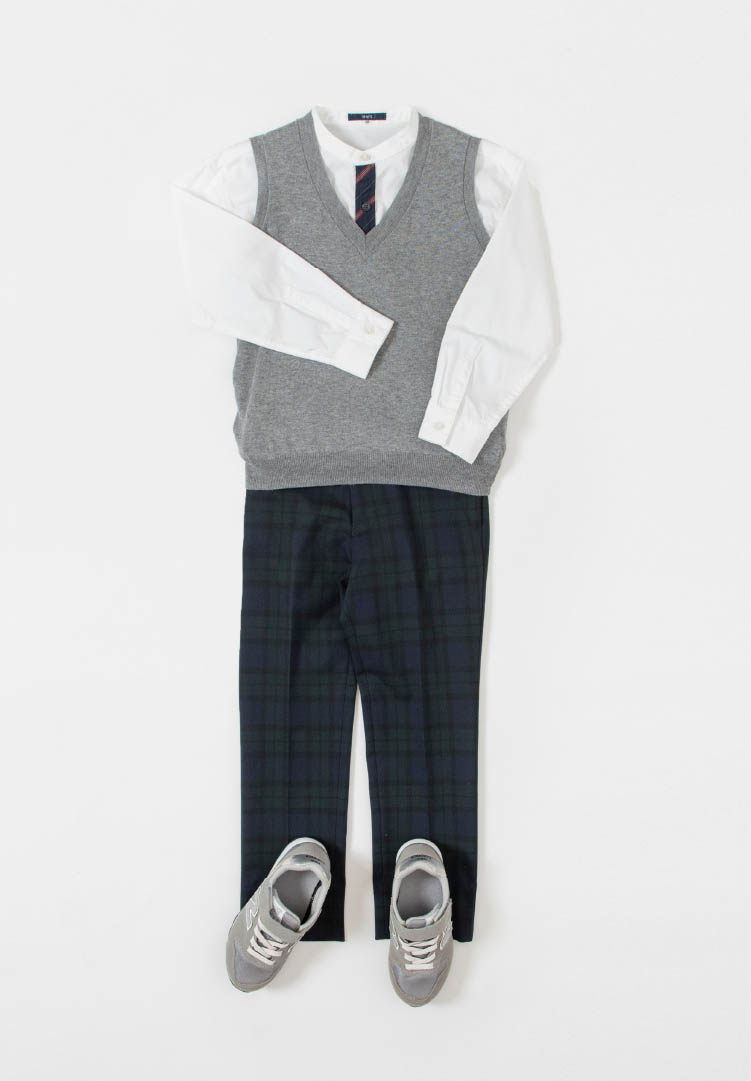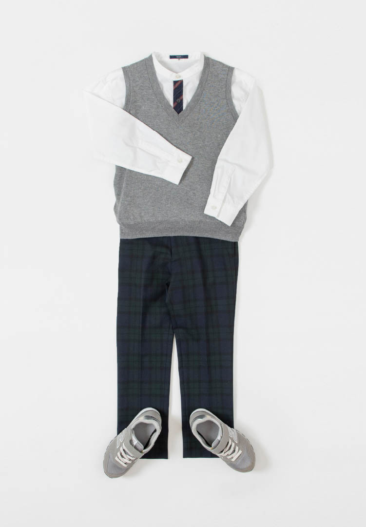 SHIPSが得意なブラックウォッチは、身につけるだけでお行儀よく見える魔法のパターン。シャツの前立てはネクタイに見えるような切り替えになっていて、ボタンを留めるだけでおしゃれに。グレーのベストとスニーカーでシックに色合わせ。
