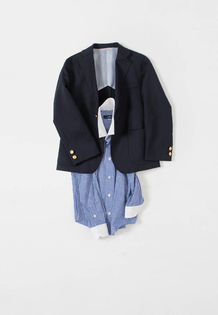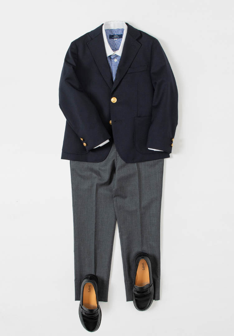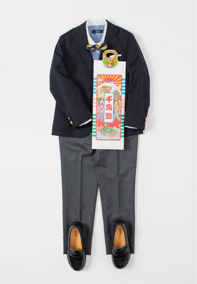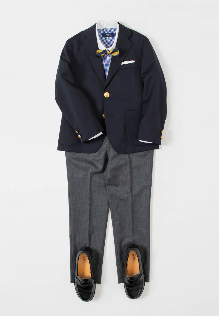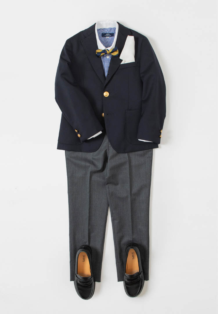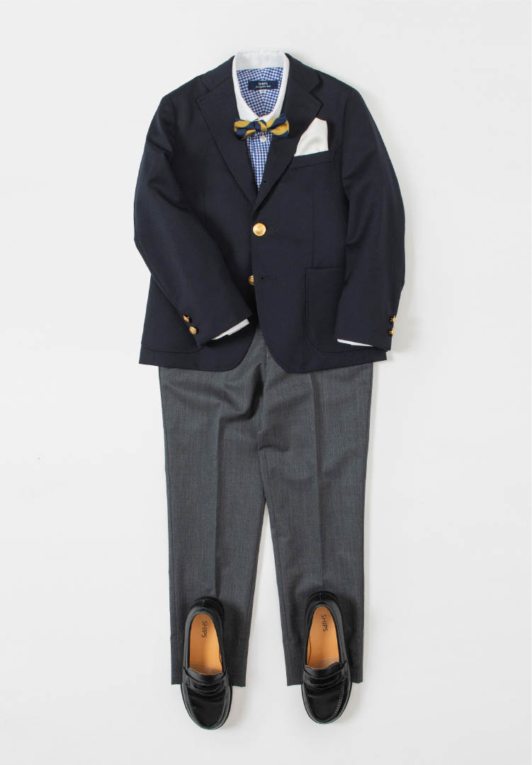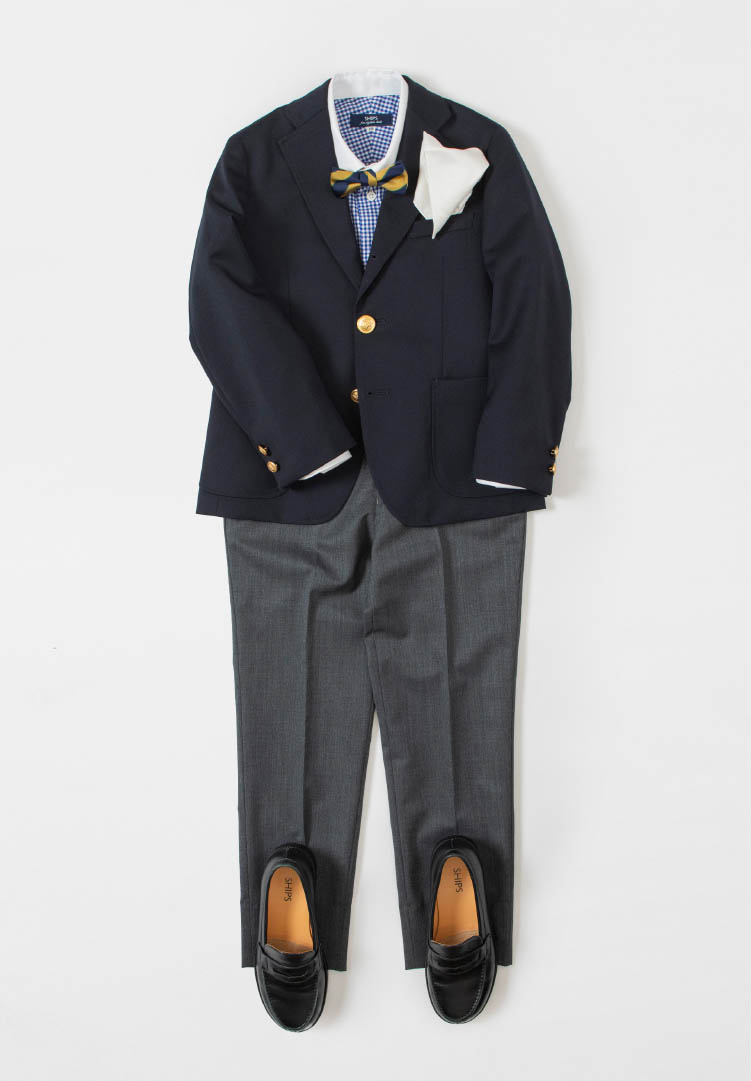 七五三の正装といえば紋付き袴だけど、現代ならジャケットも選択肢のひとつ。動きやすいと一日をご機嫌に過ごせるよ。SHIPS KIDS定番のブレザーにギンガムチェックを合わせ、金ボタンと蝶ネクタイの色をリンクすれば写真映えもばっちり。