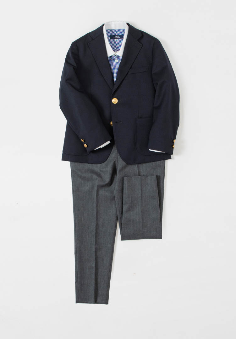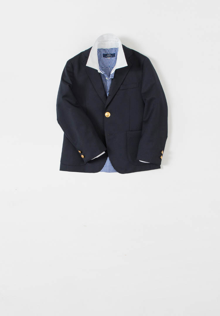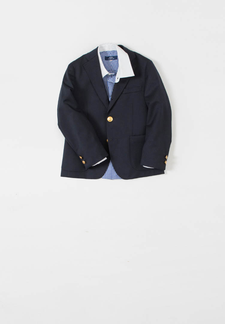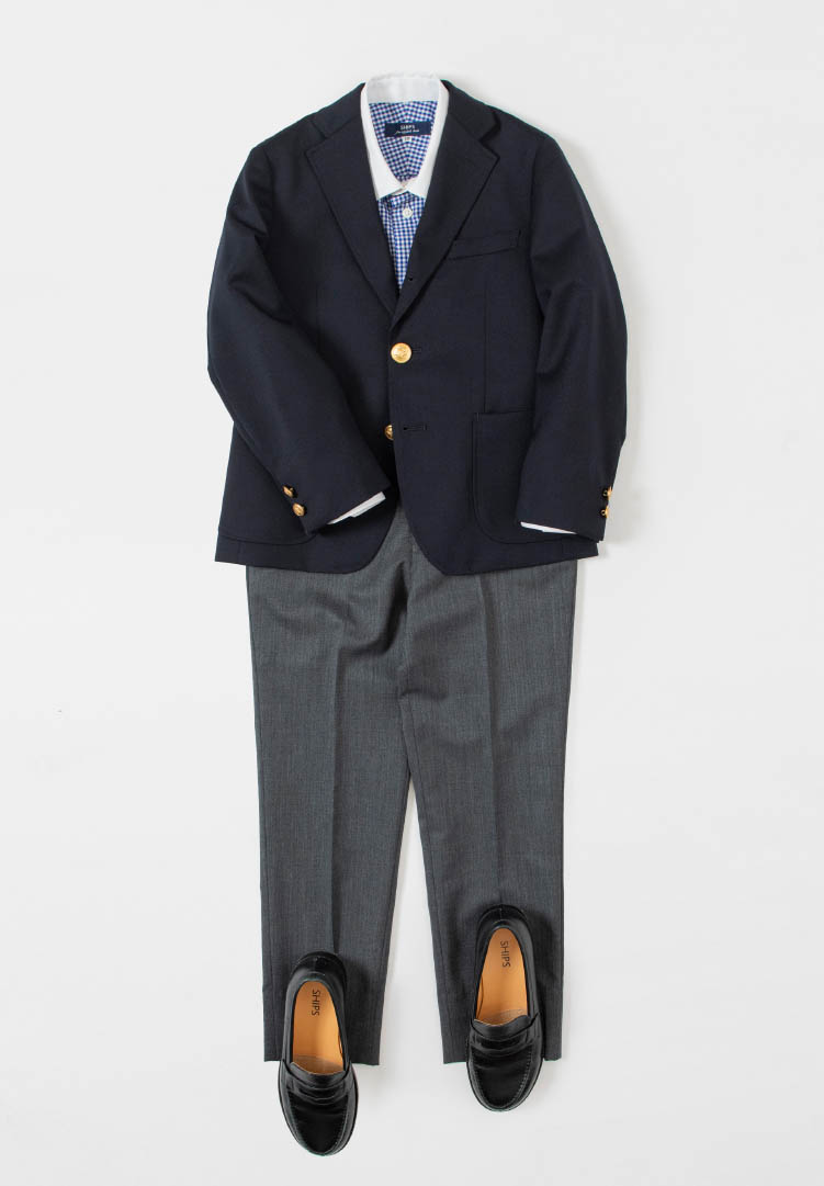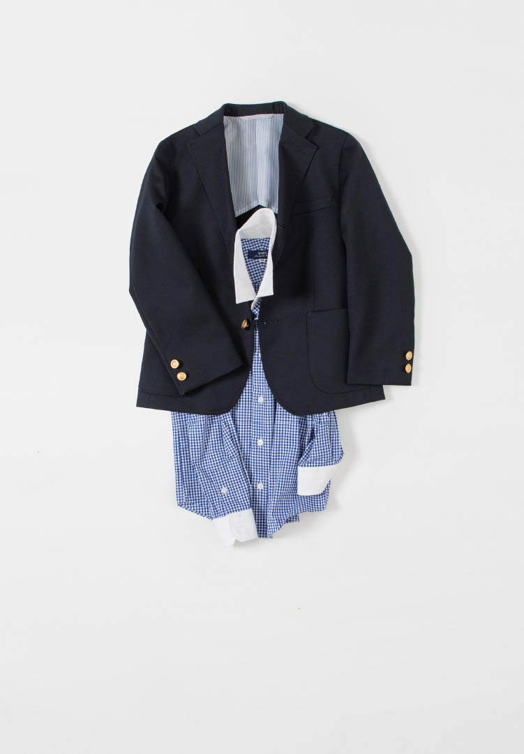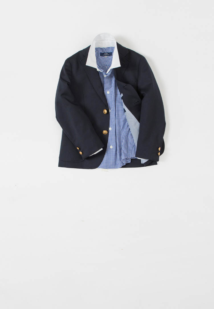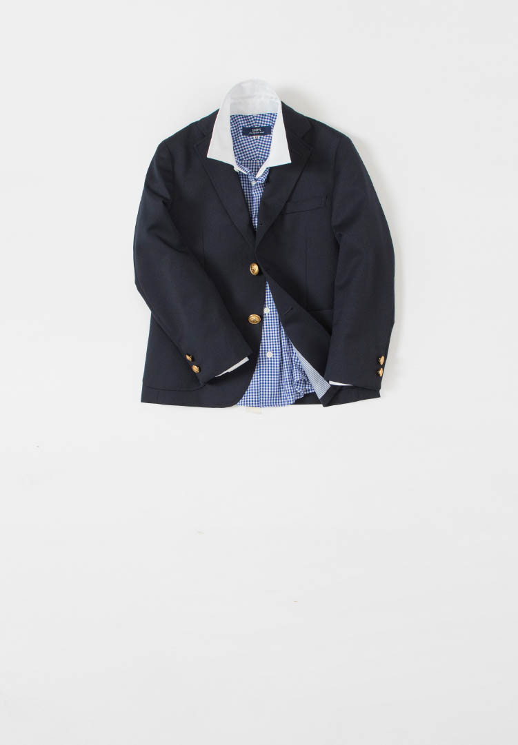 七五三の正装といえば紋付き袴だけど、現代ならジャケットも選択肢のひとつ。動きやすいと一日をご機嫌に過ごせるよ。SHIPS KIDS定番のブレザーにギンガムチェックを合わせ、金ボタンと蝶ネクタイの色をリンクすれば写真映えもばっちり。