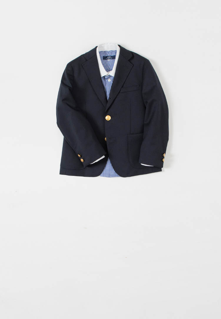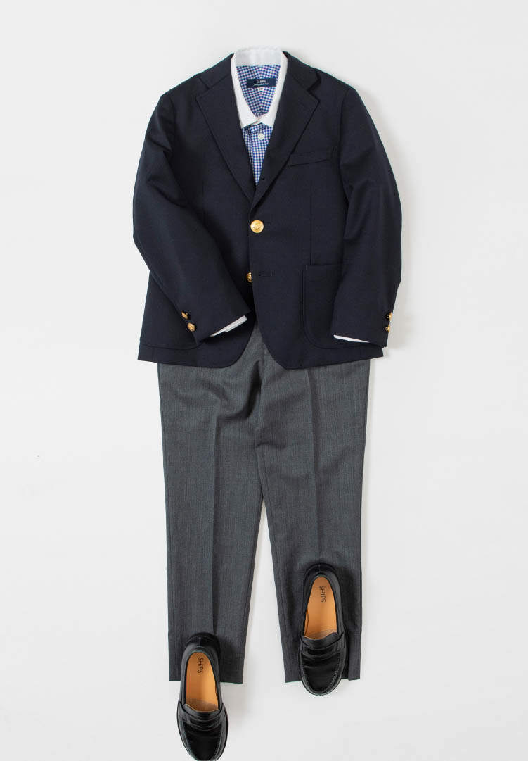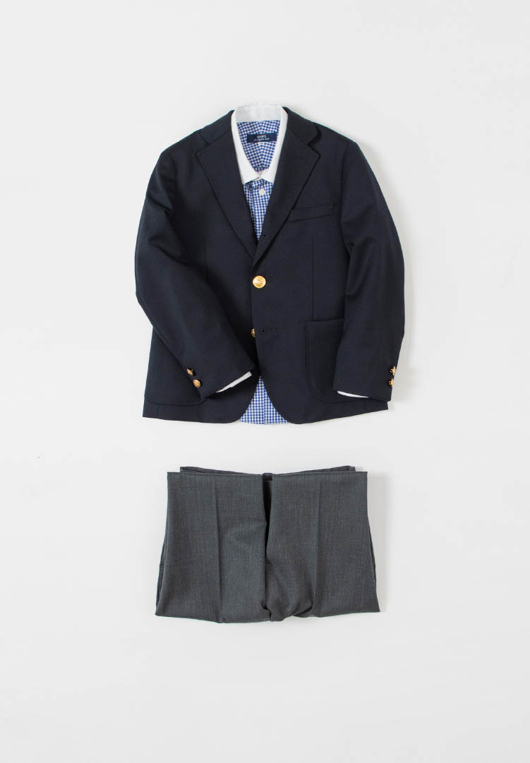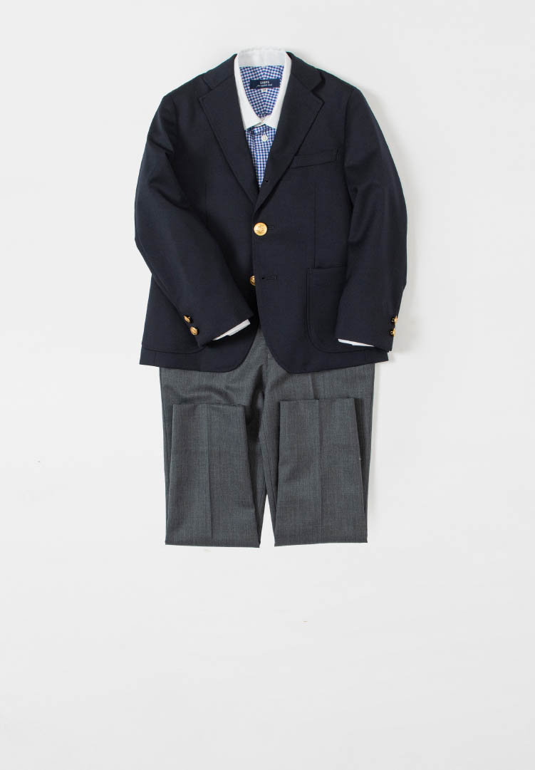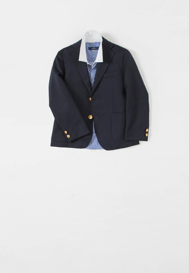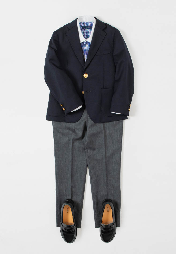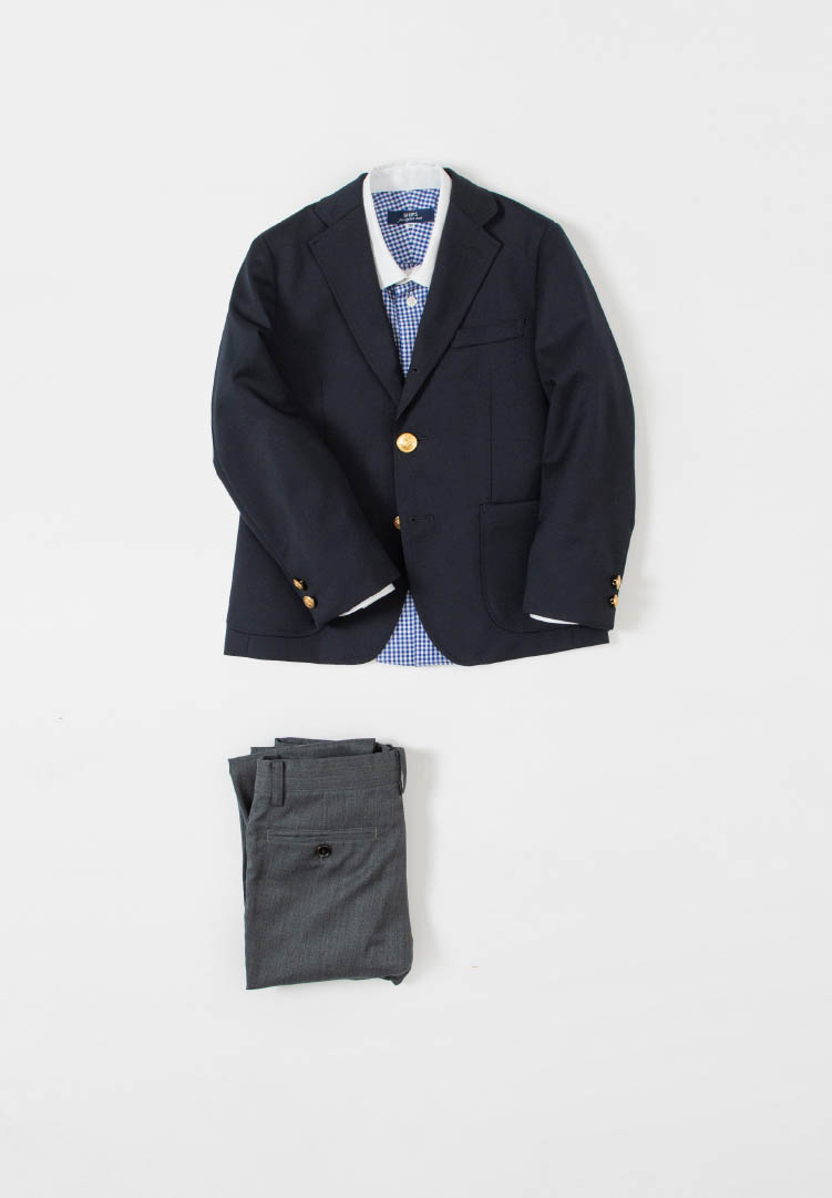 七五三の正装といえば紋付き袴だけど、現代ならジャケットも選択肢のひとつ。動きやすいと一日をご機嫌に過ごせるよ。SHIPS KIDS定番のブレザーにギンガムチェックを合わせ、金ボタンと蝶ネクタイの色をリンクすれば写真映えもばっちり。