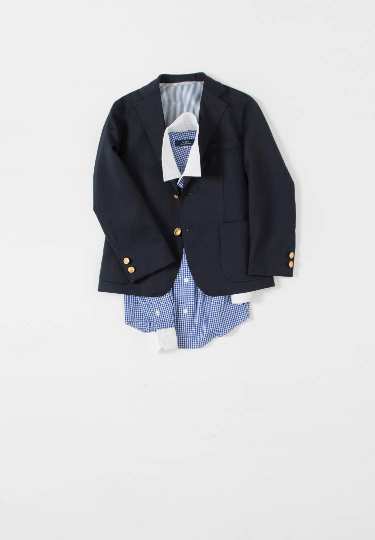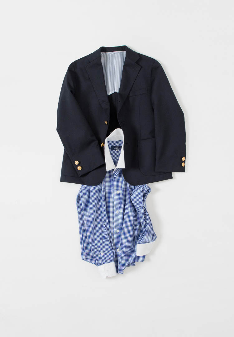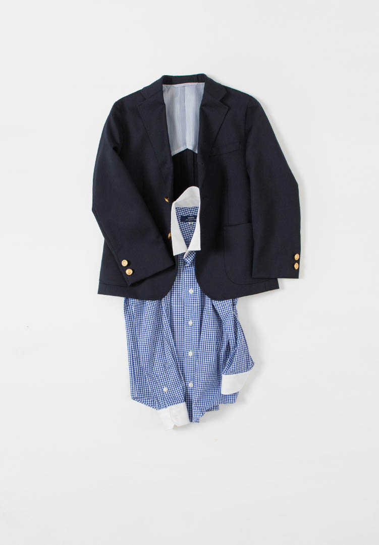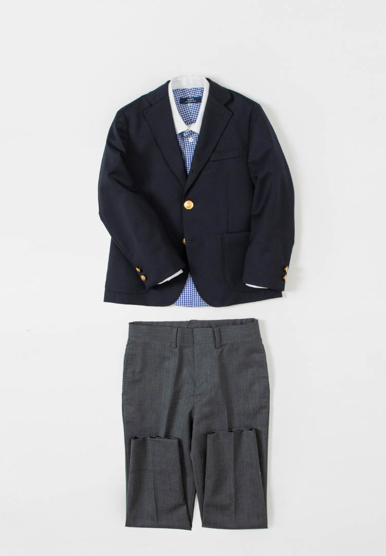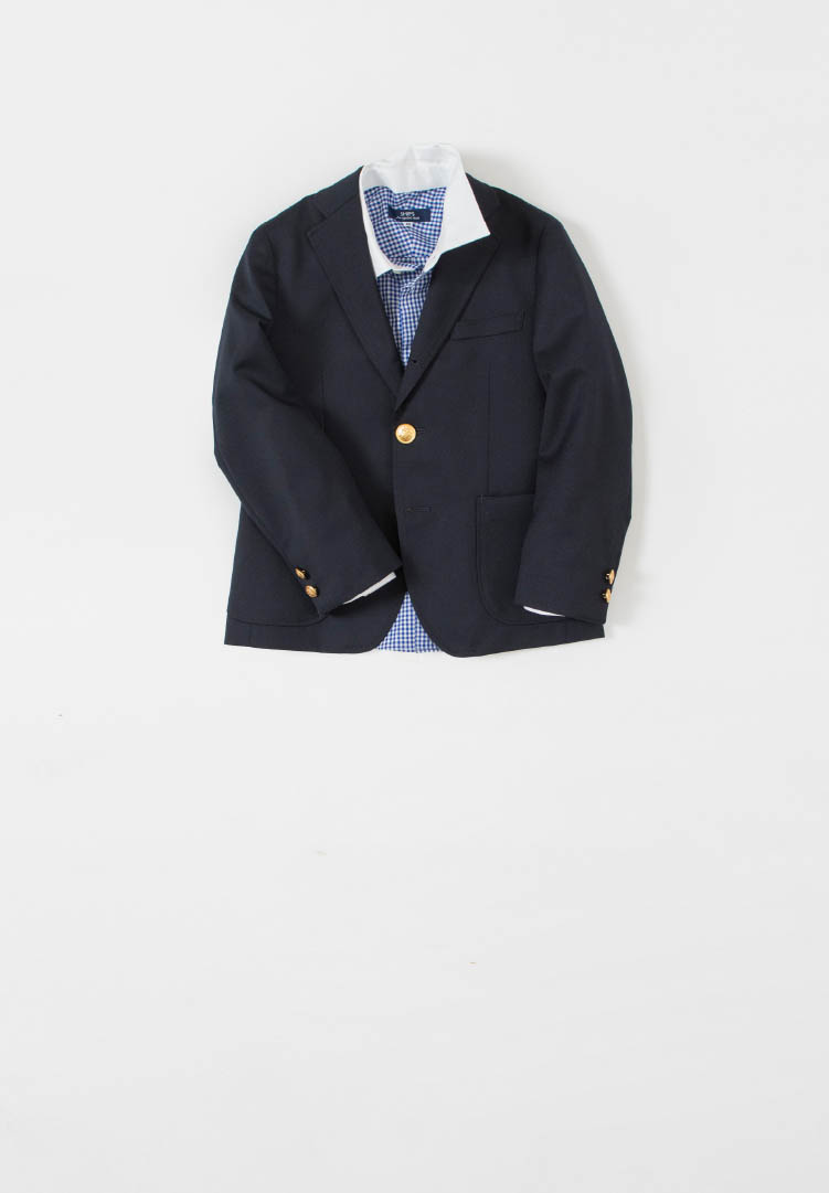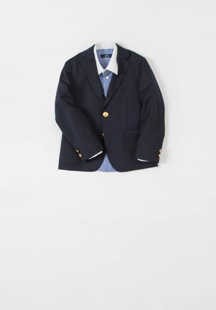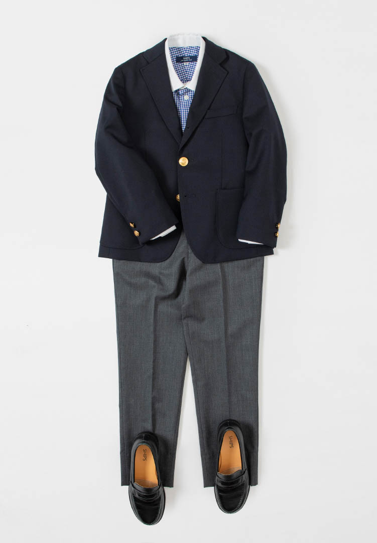 七五三の正装といえば紋付き袴だけど、現代ならジャケットも選択肢のひとつ。動きやすいと一日をご機嫌に過ごせるよ。SHIPS KIDS定番のブレザーにギンガムチェックを合わせ、金ボタンと蝶ネクタイの色をリンクすれば写真映えもばっちり。