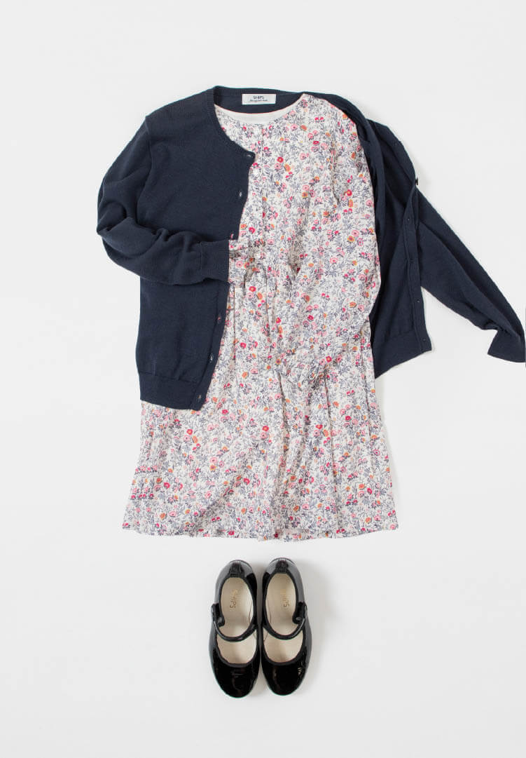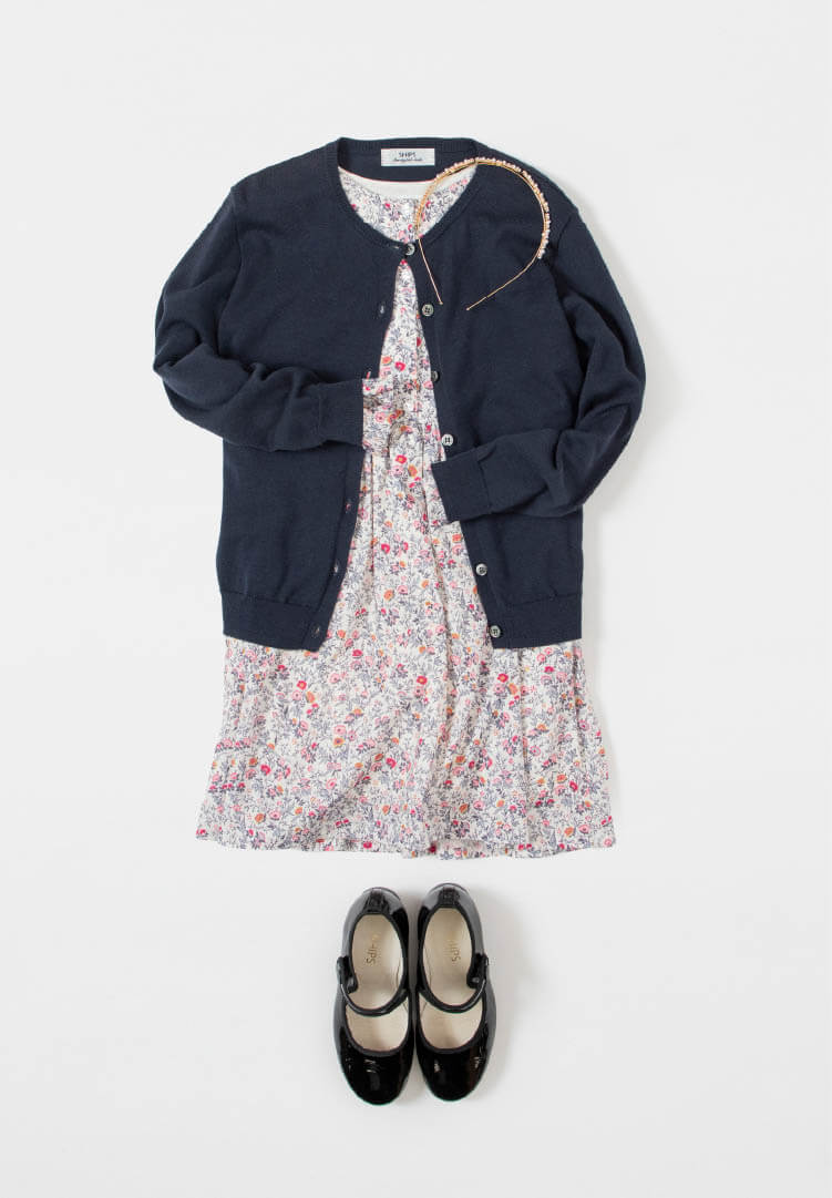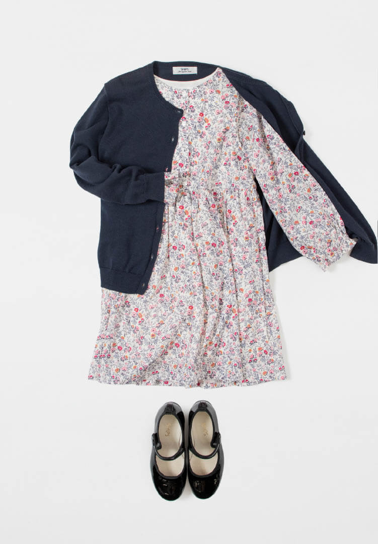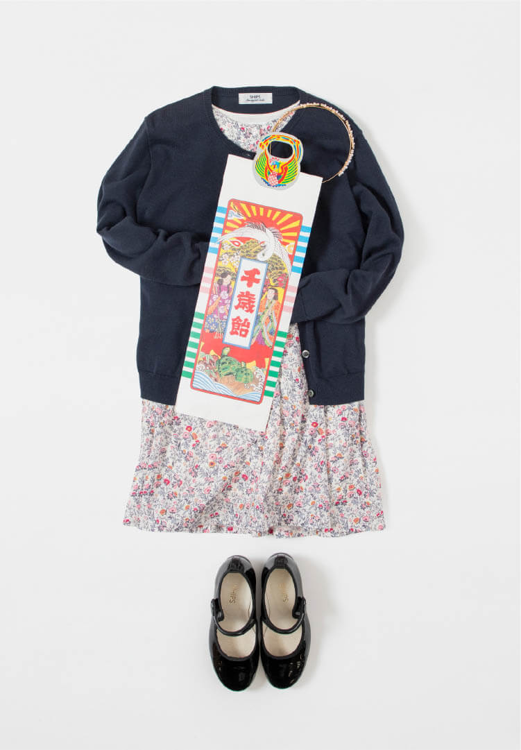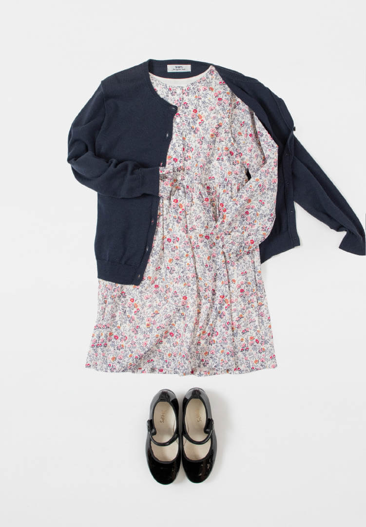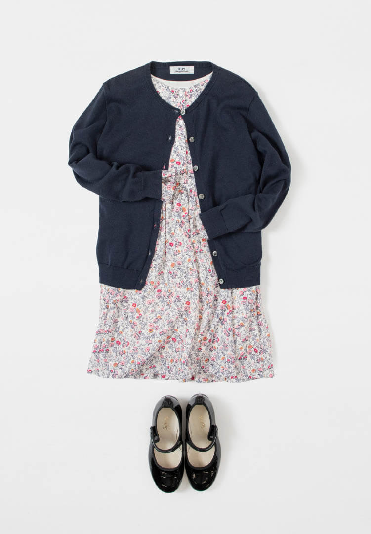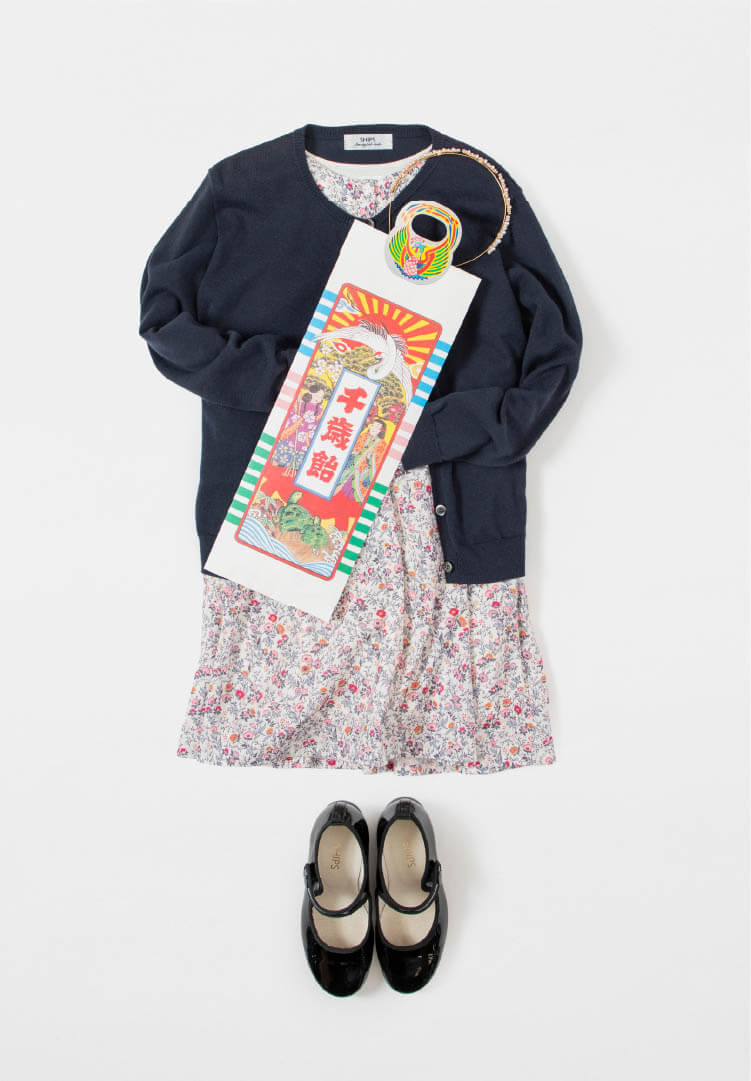 兄弟の七五三を一緒にお祝いするなら、リバティプリントのワンピースでおめかし。ウエストのギャザーが女の子らしいシルエットを作ってくれる。カーディガンとエナメルのバレエシューズはネイビー。SHIPS KIDSらしい、甘くトラッドなよそおいに。