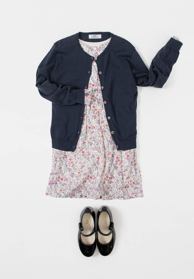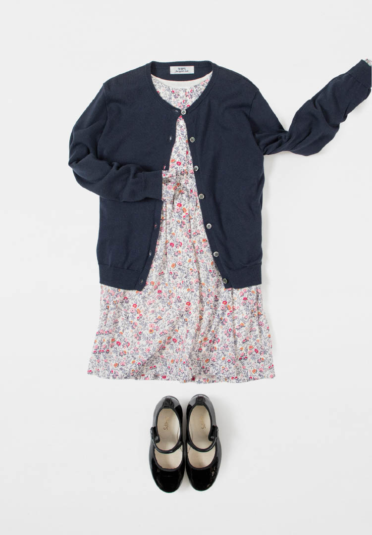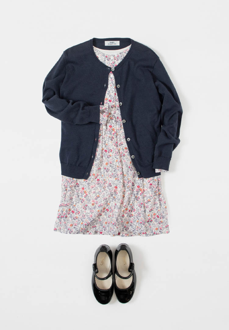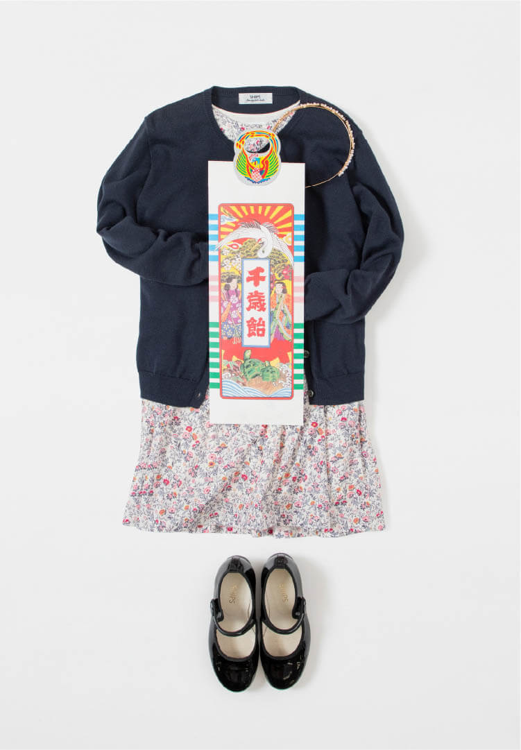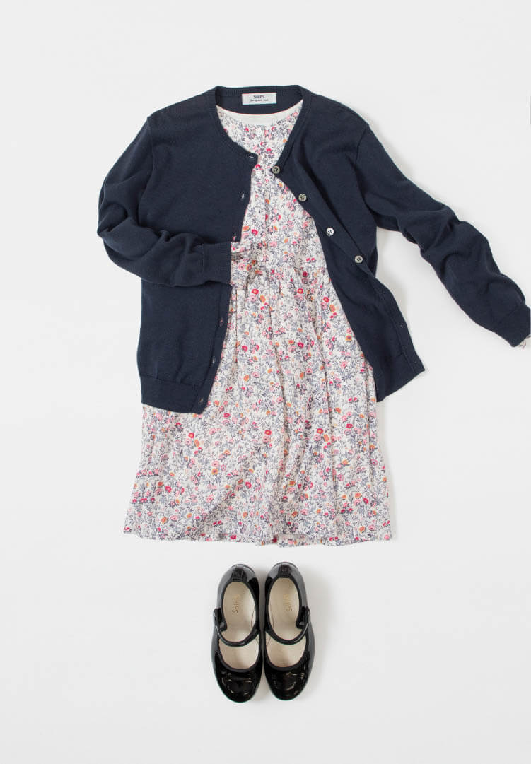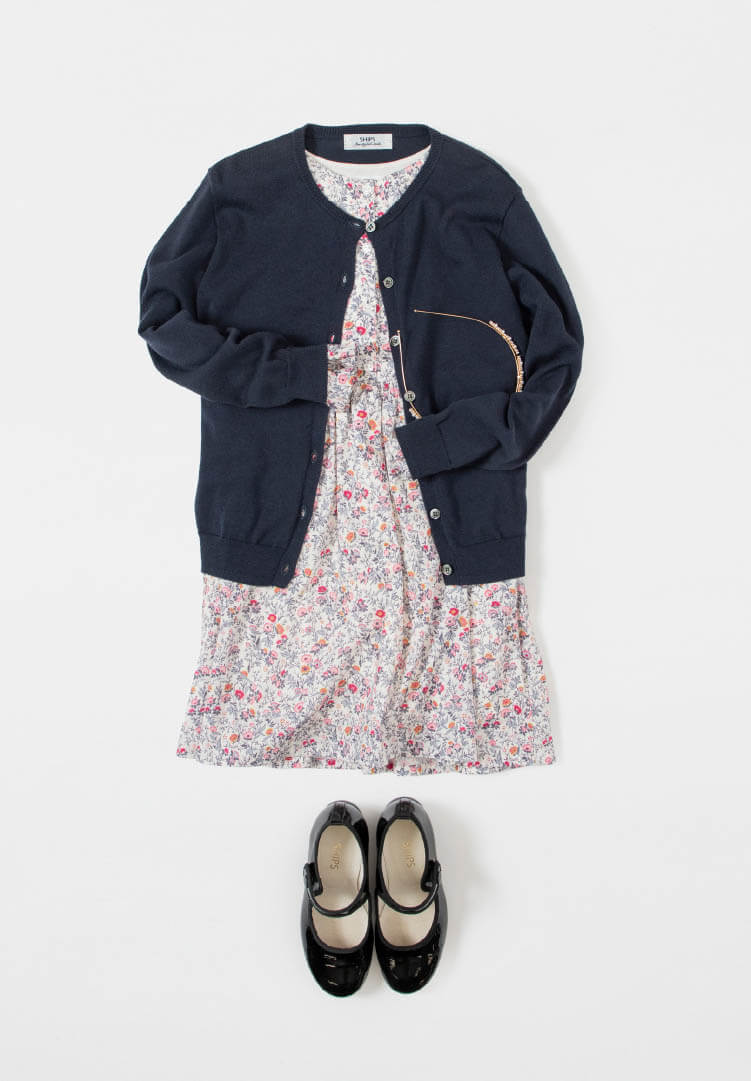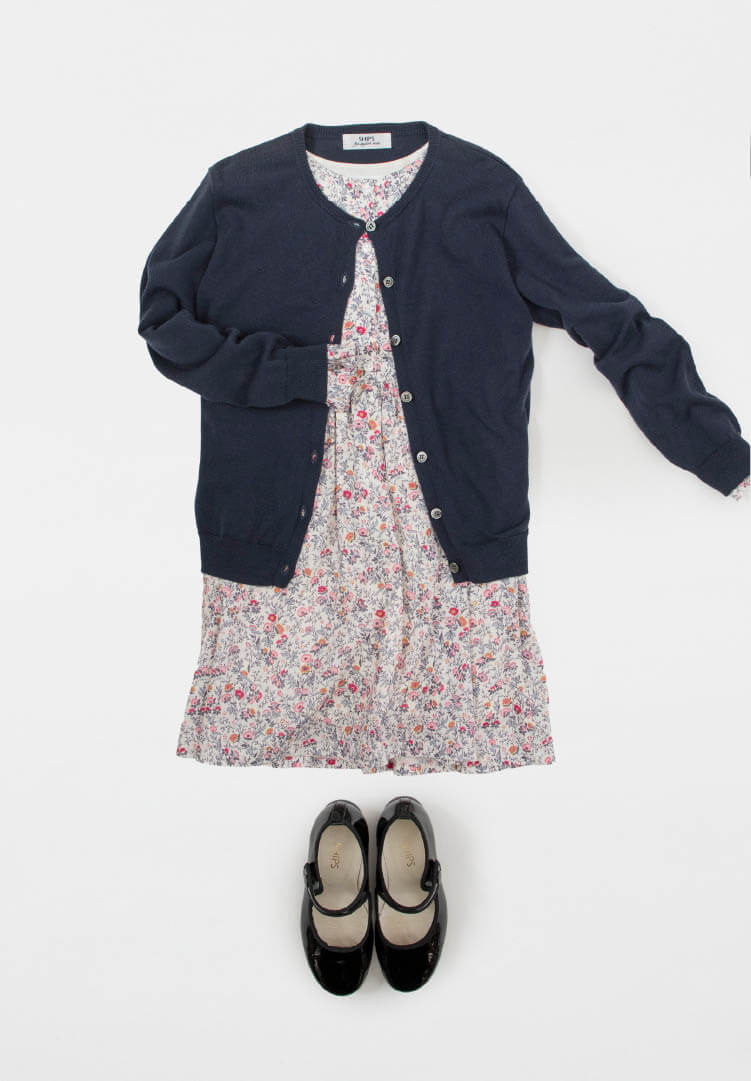 兄弟の七五三を一緒にお祝いするなら、リバティプリントのワンピースでおめかし。ウエストのギャザーが女の子らしいシルエットを作ってくれる。カーディガンとエナメルのバレエシューズはネイビー。SHIPS KIDSらしい、甘くトラッドなよそおいに。