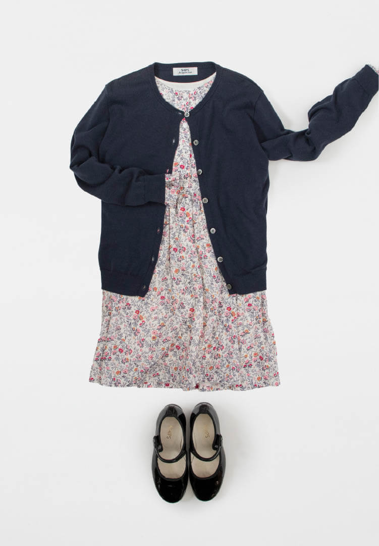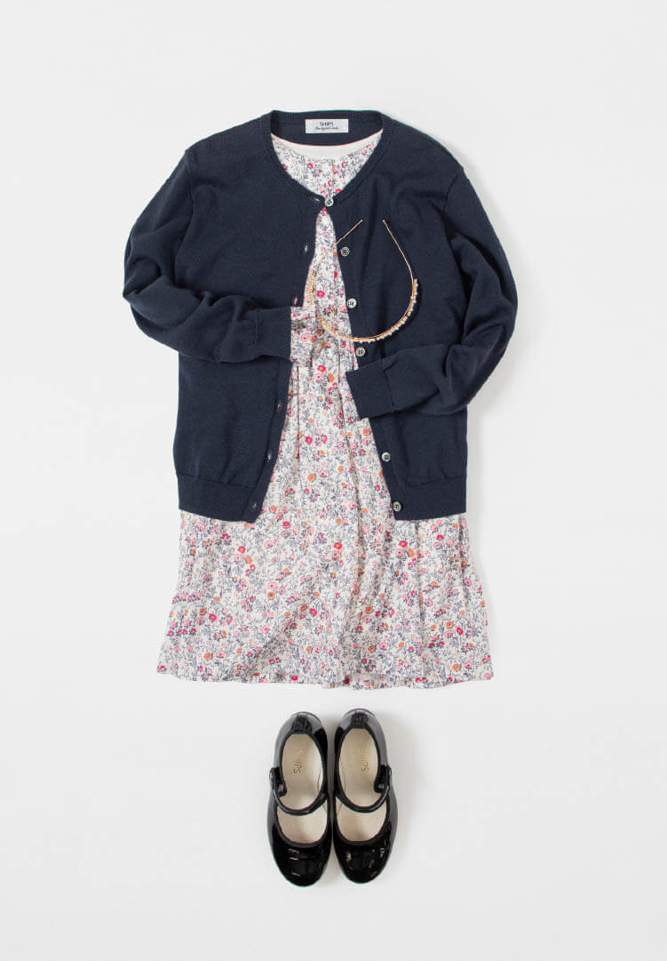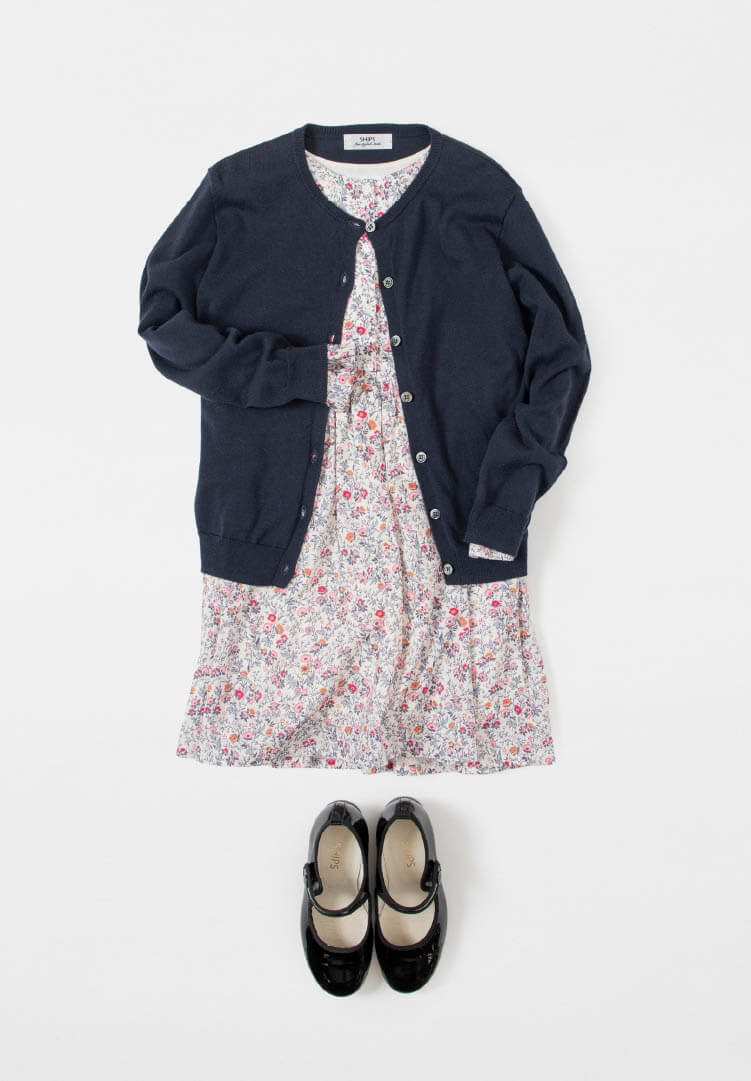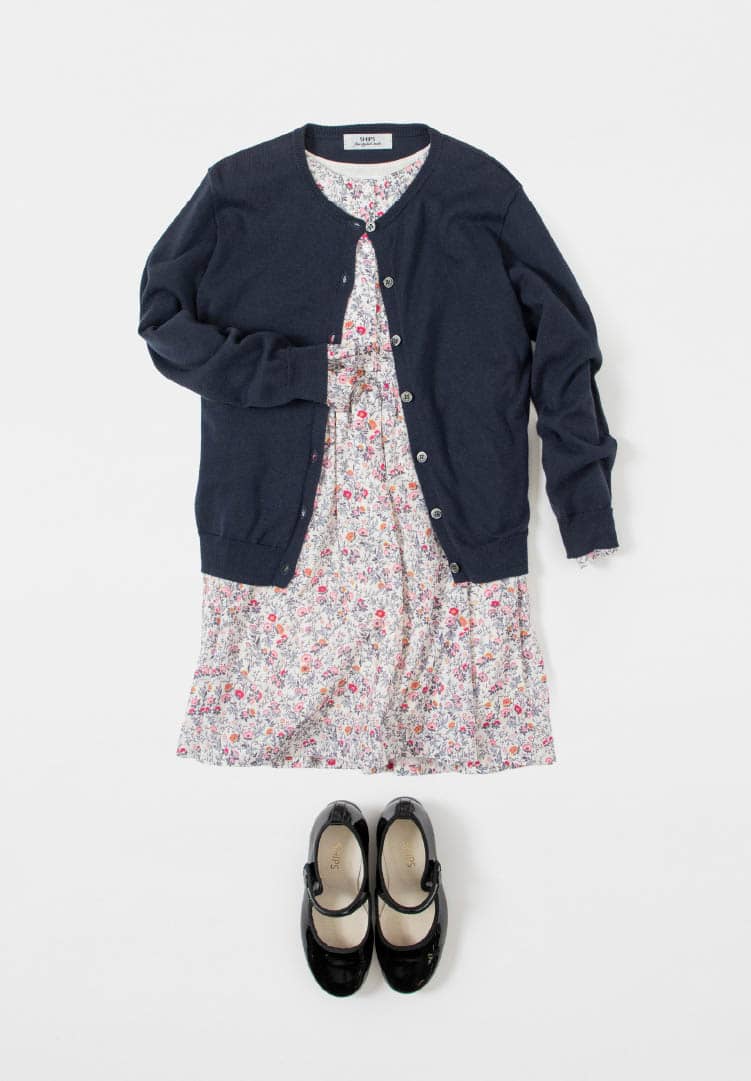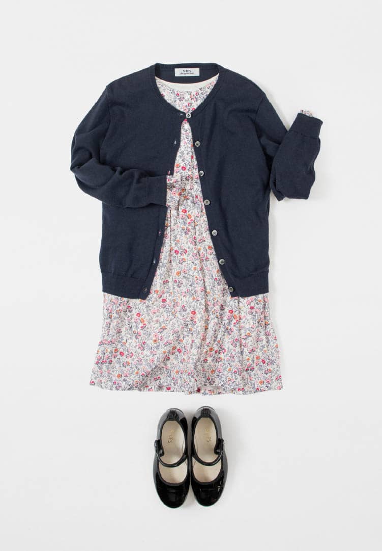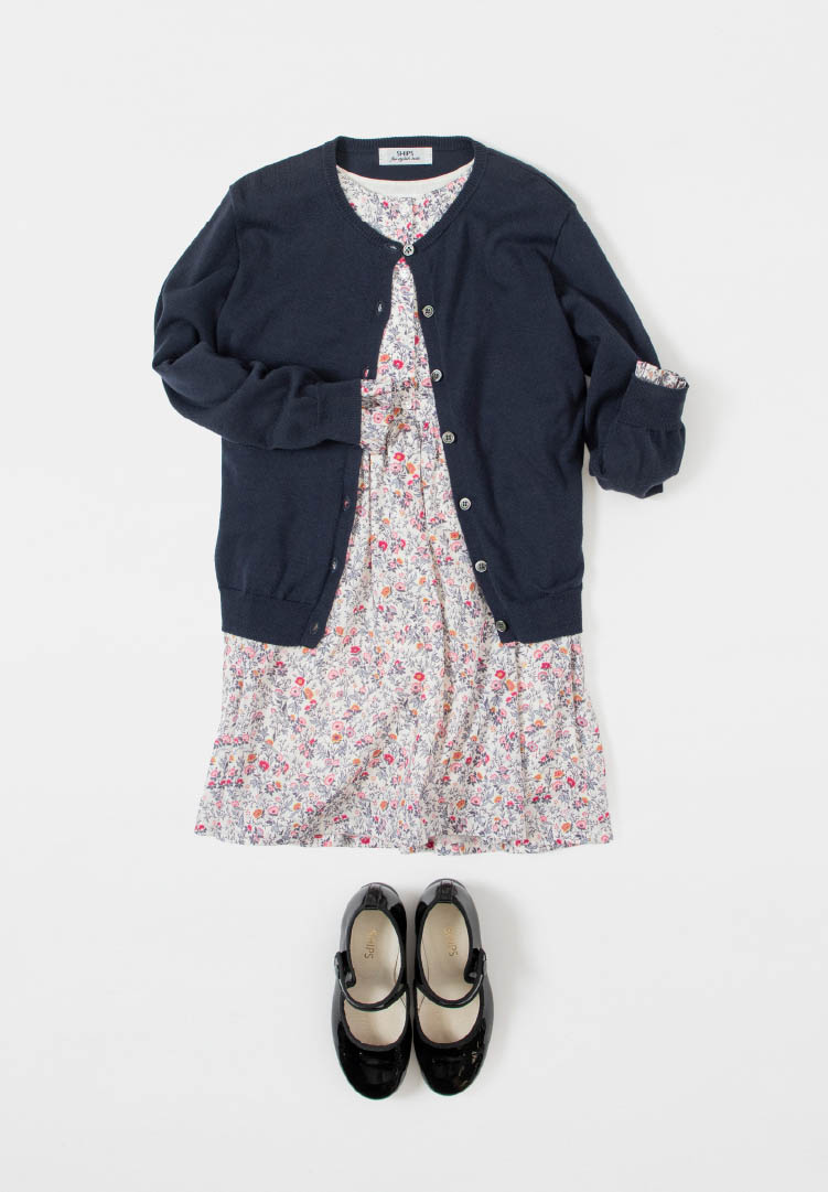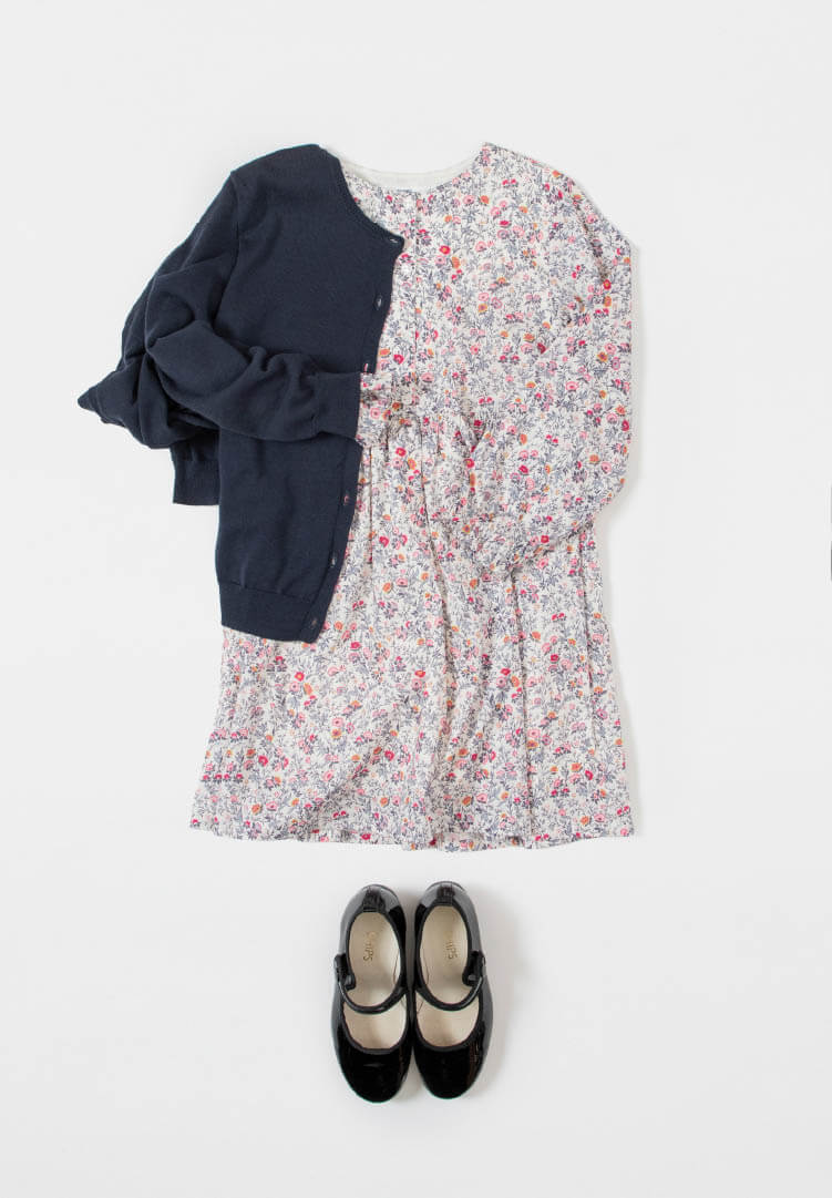 兄弟の七五三を一緒にお祝いするなら、リバティプリントのワンピースでおめかし。ウエストのギャザーが女の子らしいシルエットを作ってくれる。カーディガンとエナメルのバレエシューズはネイビー。SHIPS KIDSらしい、甘くトラッドなよそおいに。