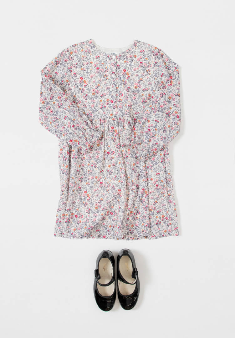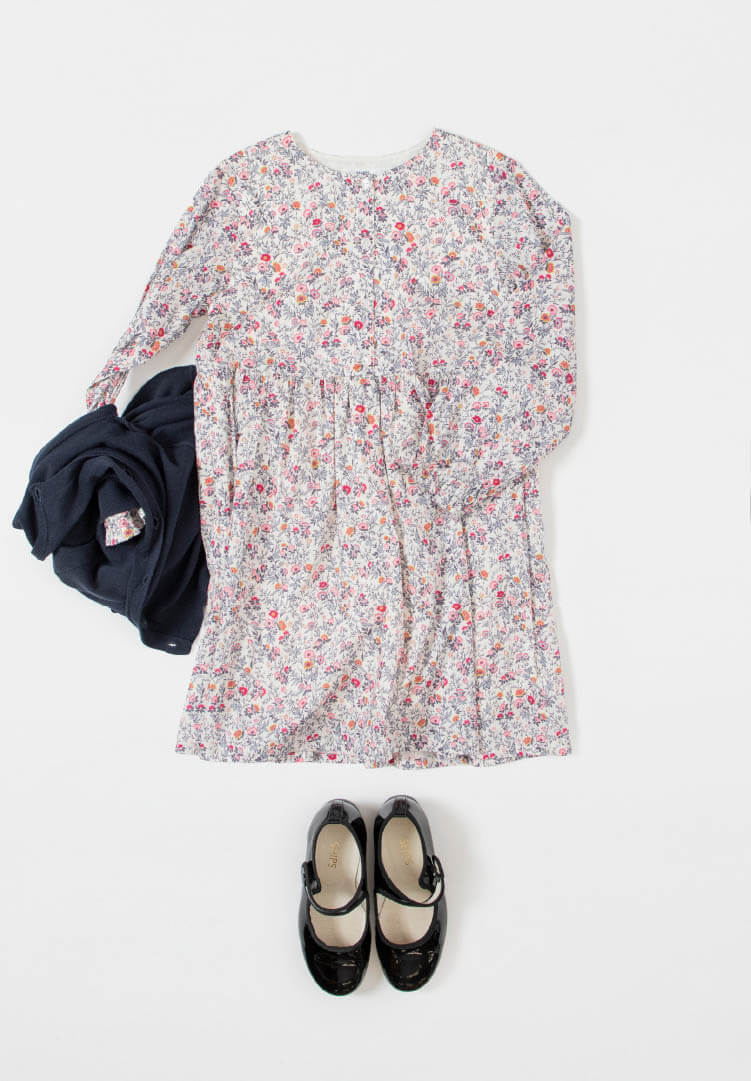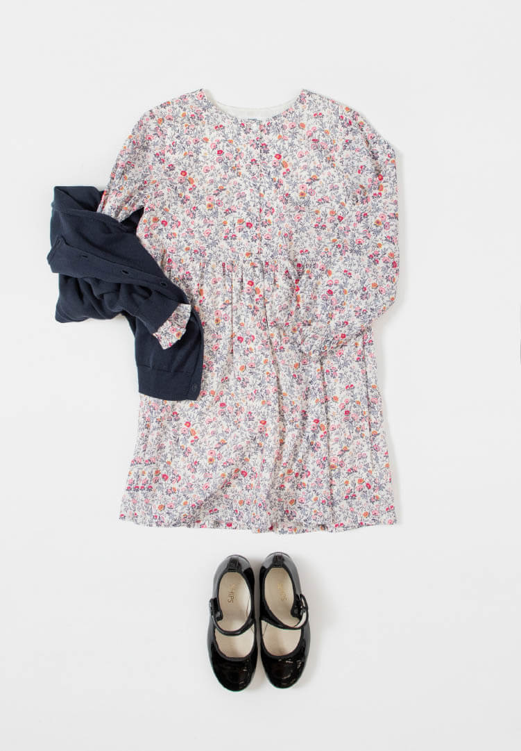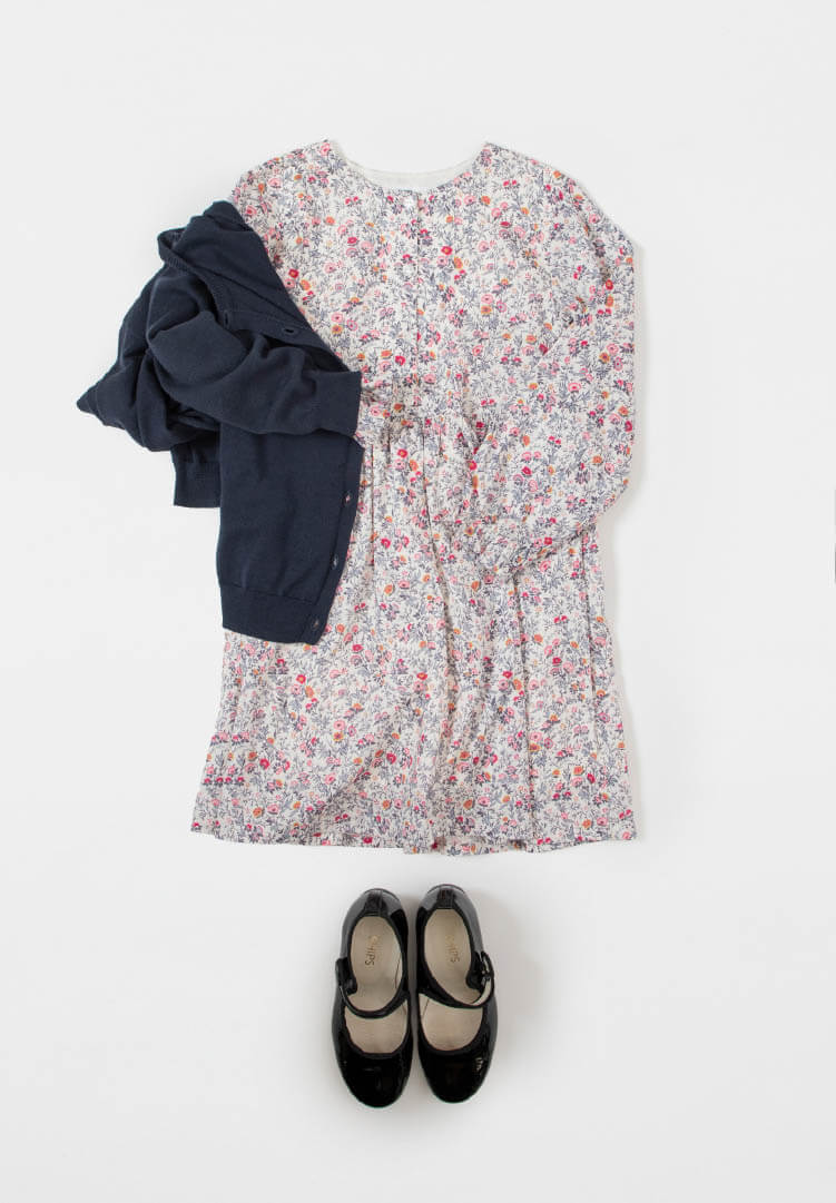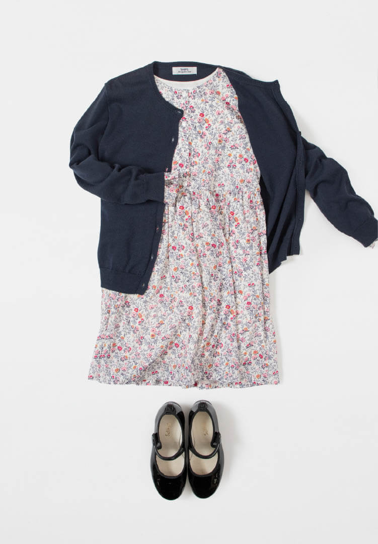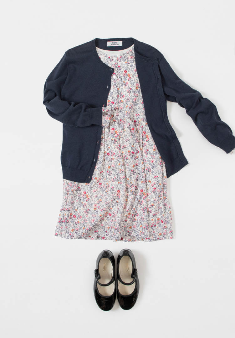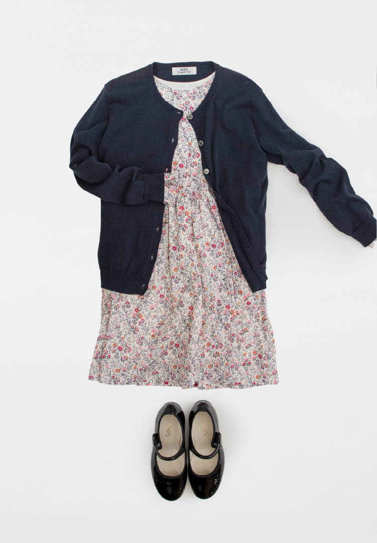 兄弟の七五三を一緒にお祝いするなら、リバティプリントのワンピースでおめかし。ウエストのギャザーが女の子らしいシルエットを作ってくれる。カーディガンとエナメルのバレエシューズはネイビー。SHIPS KIDSらしい、甘くトラッドなよそおいに。