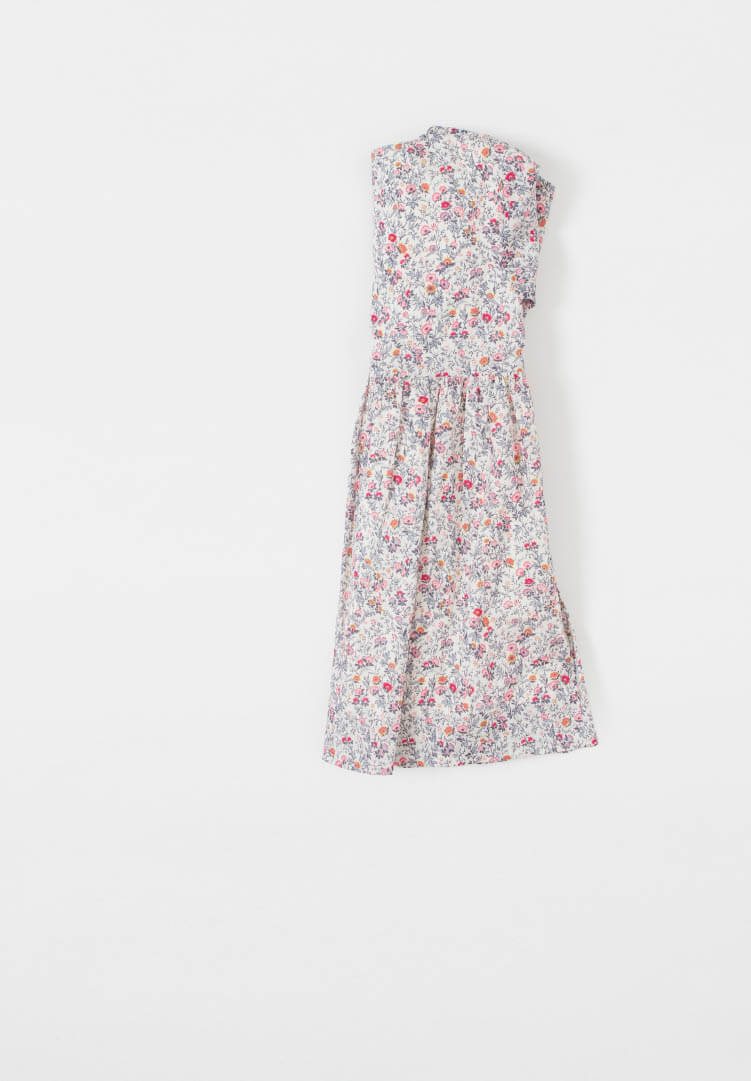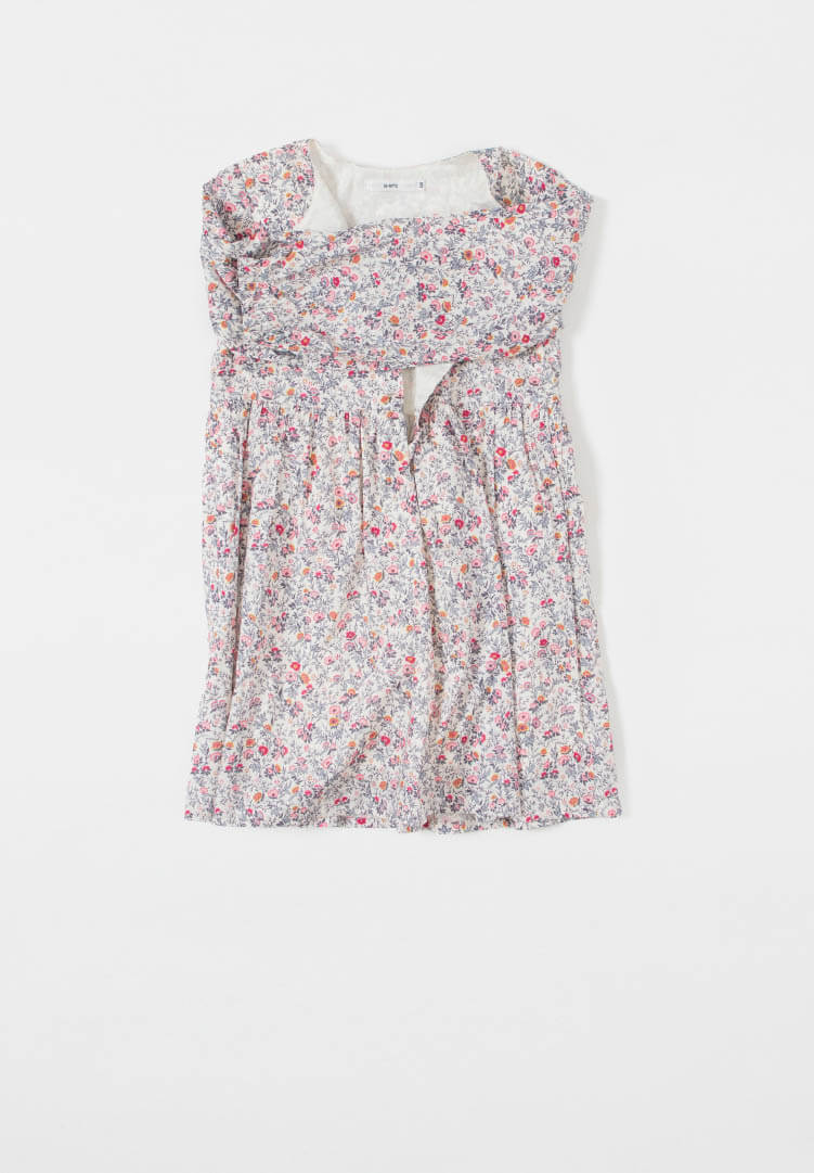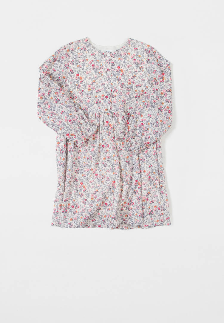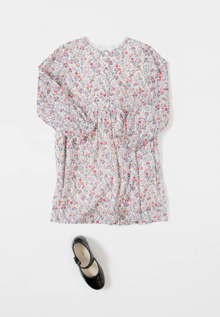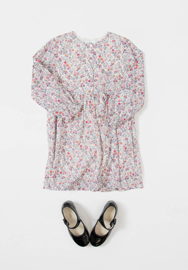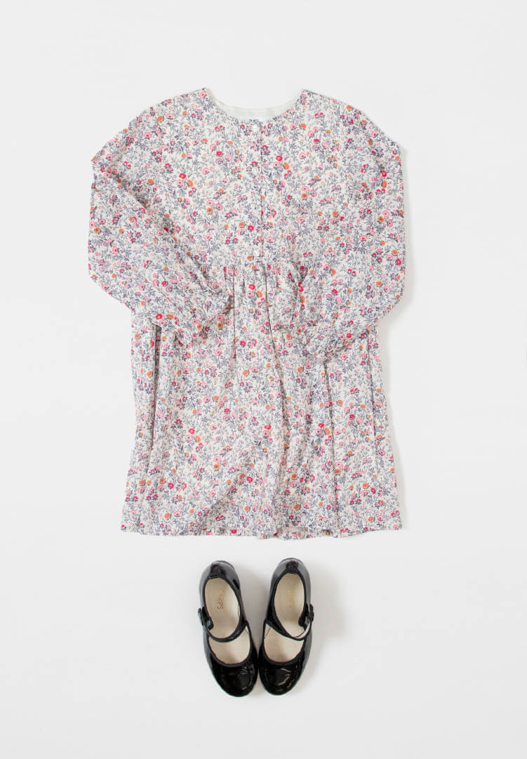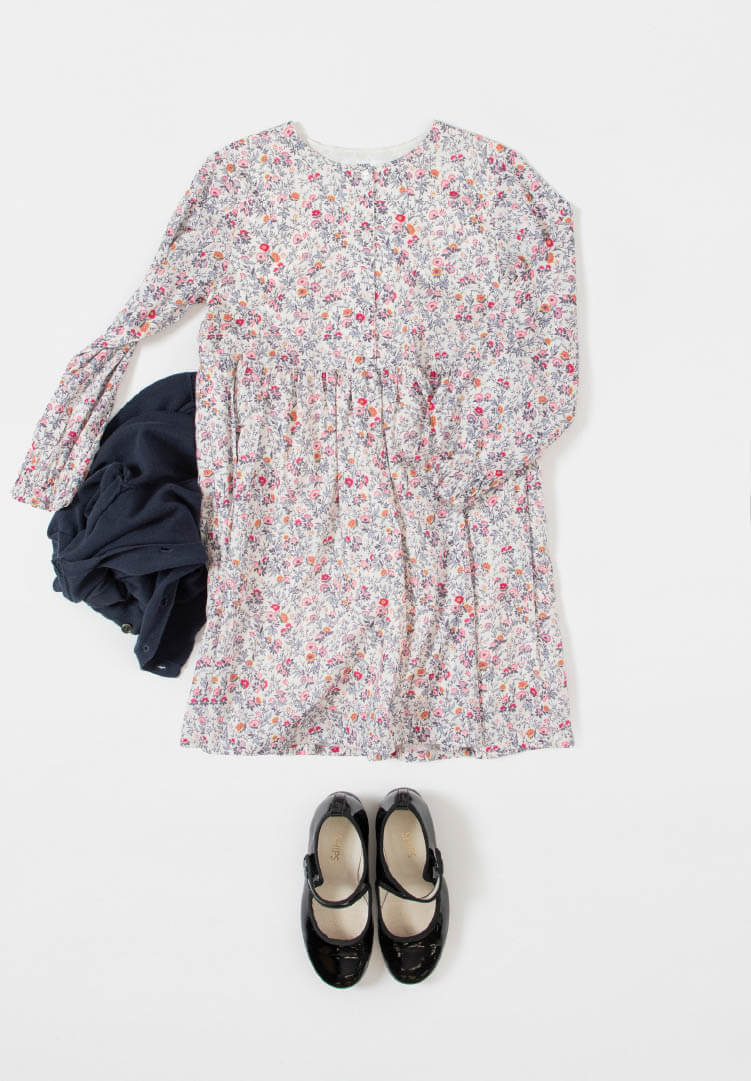 兄弟の七五三を一緒にお祝いするなら、リバティプリントのワンピースでおめかし。ウエストのギャザーが女の子らしいシルエットを作ってくれる。カーディガンとエナメルのバレエシューズはネイビー。SHIPS KIDSらしい、甘くトラッドなよそおいに。
