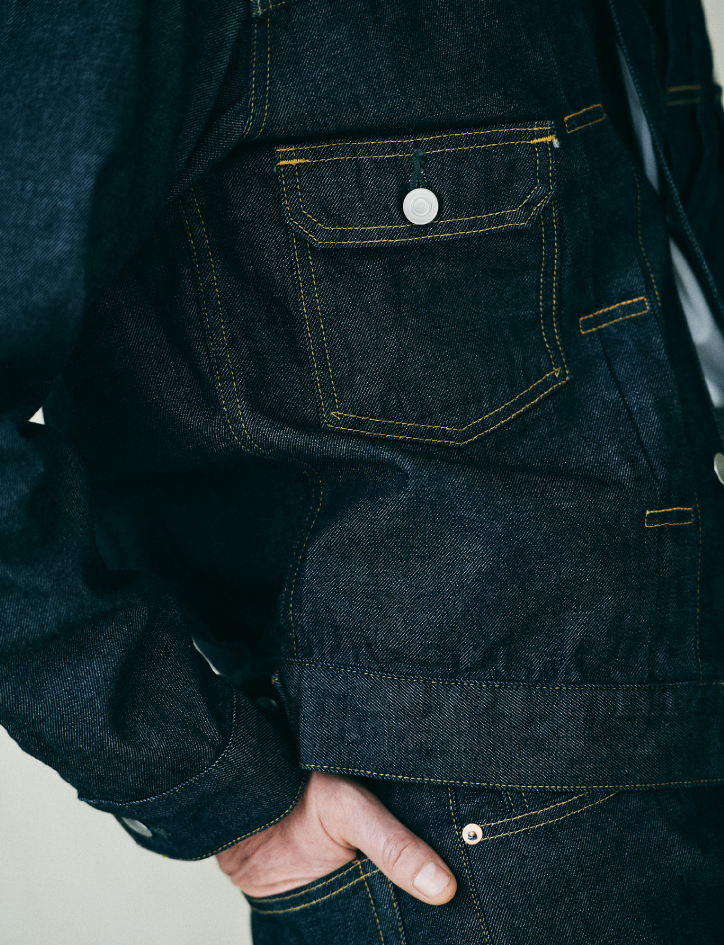 ヴィンテージの名品から着想を得た、オーセンティックなトラッカージャケット。縦糸に超長綿のスーピマコットンのインディゴ糸を使い、程よい光沢をもたせました。アメカジの野暮ったさをなくすために着丈は少し長めに、身幅はすっきりと、ボタンはミニマルにあしらい、品格を大切にしています。大人であれば、ジャケパンのようにセットアップ感覚で着たいもの。ボタンを留めてかっちり着るのもおすすめです。ジーンズは、テーパードを微妙に効かせた王道のヴィンテージデニムがモチーフ。セルヴィッジデニムゆえに生まれる美しいアタリは、古き良きルーツへのオマージュです。