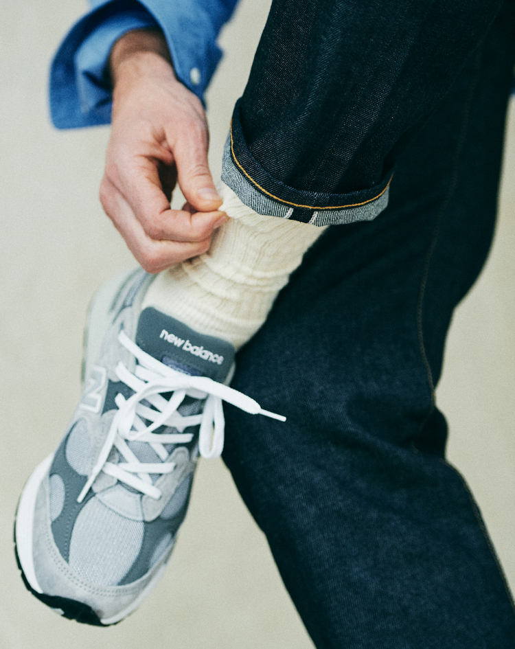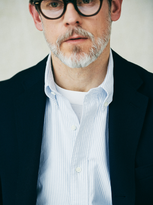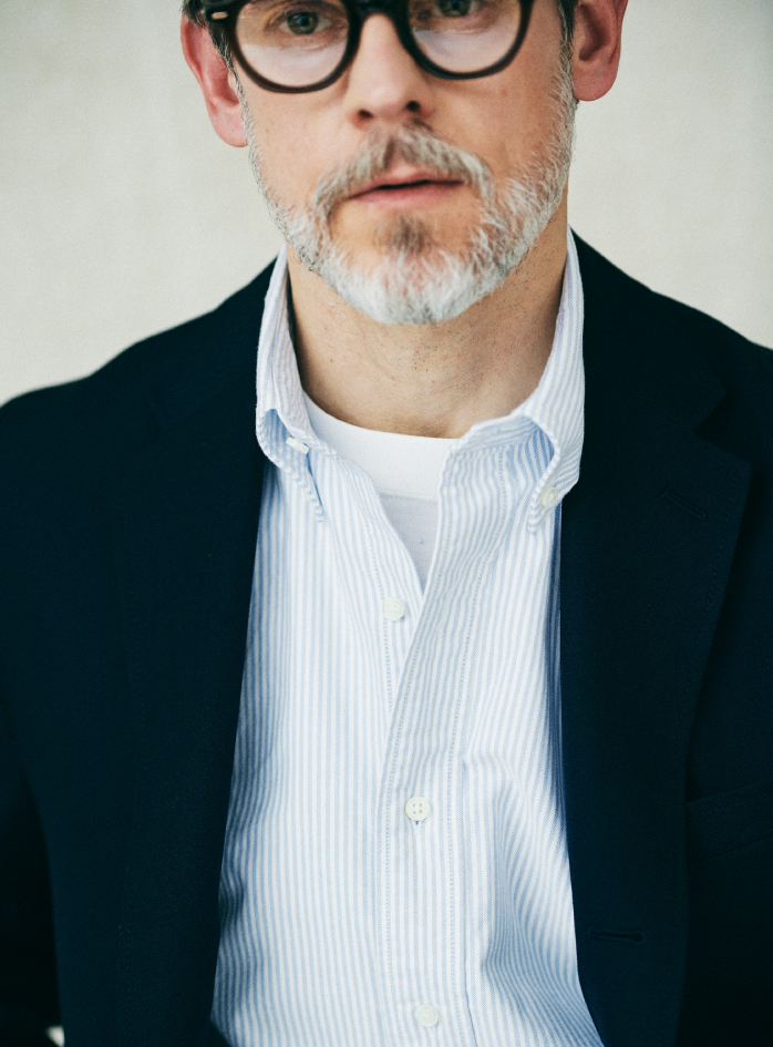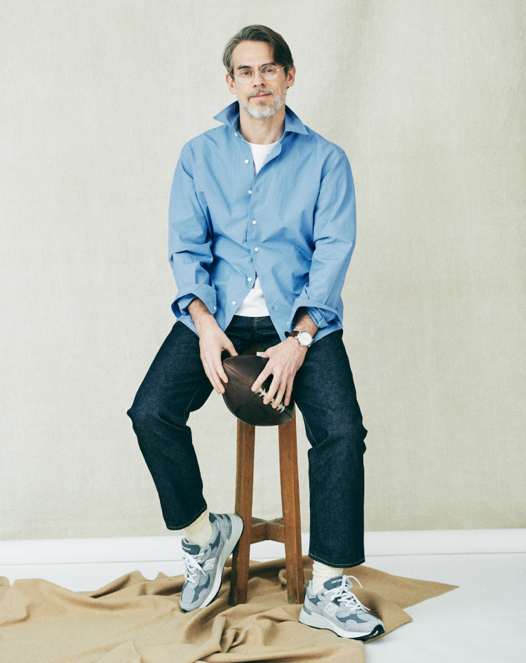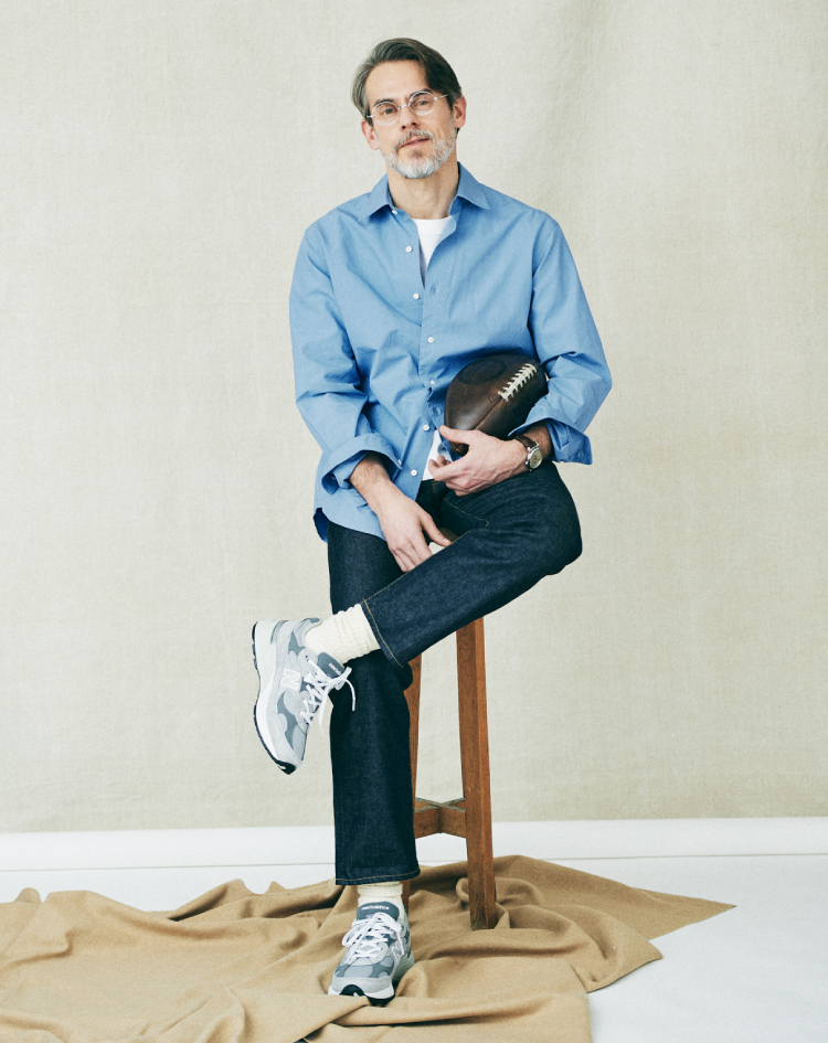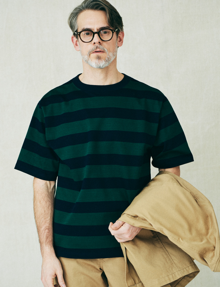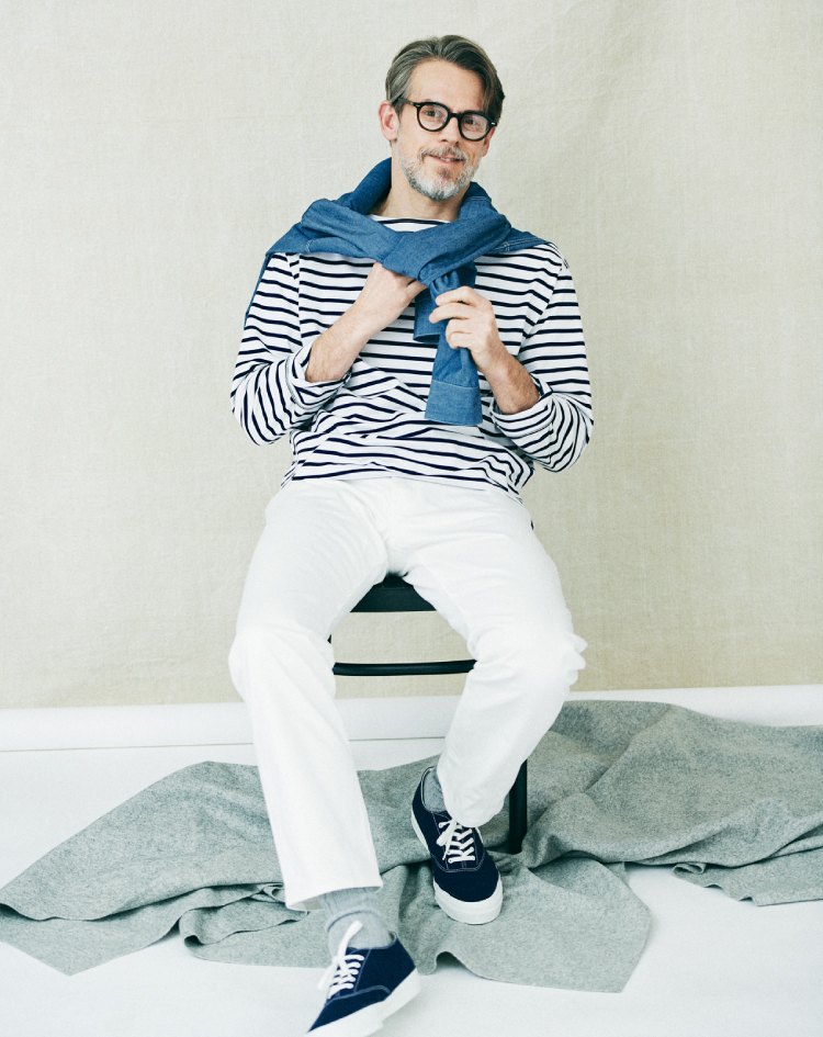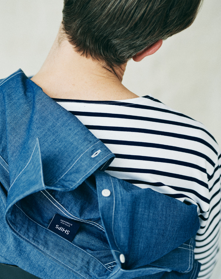 頭に思い浮かぶバスクシャツの定番はいくつかありますが、SHIPS STANDARDは、オーセンティックにはないバランス感を意識しました。着丈は少し長め、身幅は少し広め、袖丈はロングスリーブ。フレンチなバスクシャツの魅力でもあったコンパクトなムードを一新し、今の気分に合わせています。また贅沢な発想として、超長綿のスビンコットンを20番手の単糸で引き揃えました。ハリとコシがあり、一枚でも凛とした印象を保つことができます。今季トレンドに復帰したホワイトデニムは、LOOK1、2のジーンズと同素材、同シルエット。古着の愛好家も納得頂けるこだわりで、モダンを表現しています。