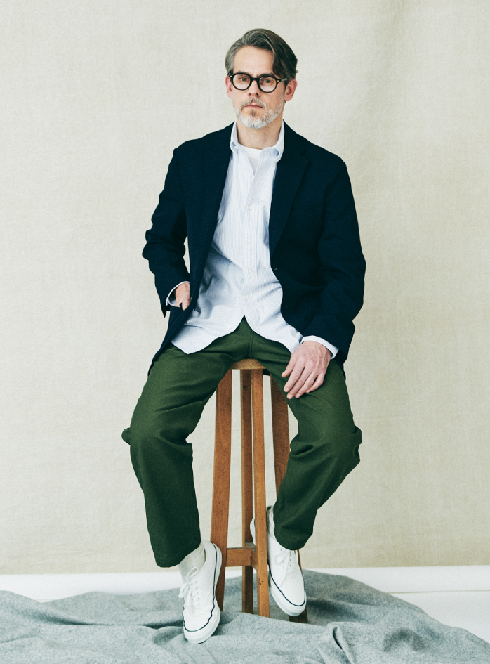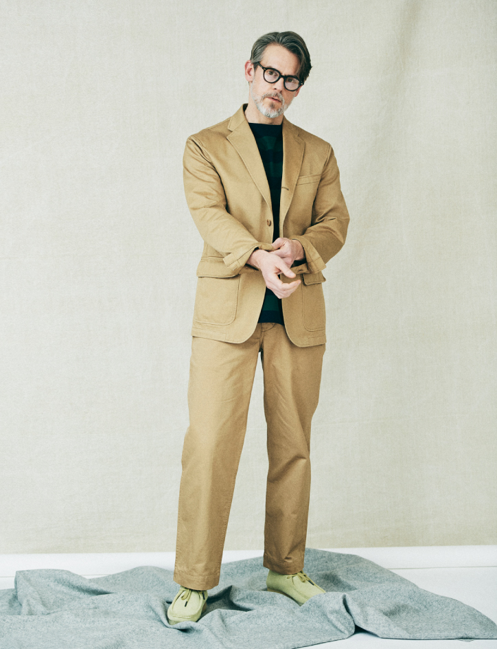 ブレザーはポリエステルとウールを交織させたオリジナル糸のギャバジンを使い、普段着としてのスペックを持ち合わせました。ボタンはあえてナットを採用し、アイビーの畏まった印象を受けるブレザーではなく、気軽なブルゾンのような立ち位置を目指しています。ベイカーパンツは、光沢のあるフィンクスコットンを表裏が逆になる組織で綾織りしました。本来、表にくる滑らかな面をあえて裏面にし、肌に触れることで着心地を高め、自然なムラや風合いが外に出るように工夫しています。80年代の渋カジ全盛期を知る世代には懐かしい紺ブレとミリタリーパンツですが、改めて今、提案したいコーディネートです。