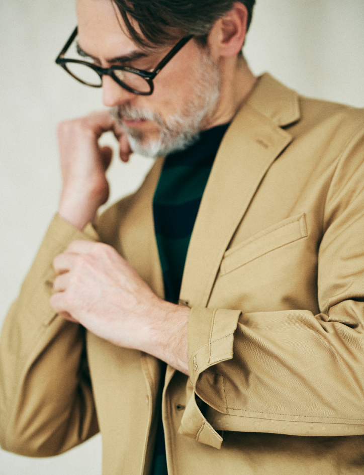 LOOK2のシャツと同じく最高級のフィンクスコットンを使い、ツイル織のしっかりとした生地を作りました。これ以上ない上質なチノともいえます。ブレザーはアメリカントラディショナルらしく、3つボタン段返りにパッチポケット。ナチュラルなフィットを意識しながら、縦にすっきりと伸びるシルエットで品格を持たせました。ボトムスは、米軍のミリタリーパンツ、M-41を感じさせる、やや骨太なリラックスフィット。側部の巻縫いの細ステッチワークにも注目してください。ドレスパンツのような細かい運針がカジュアル感を払拭しながら、穿き込んだ際に理想的な風合いをもたらします。