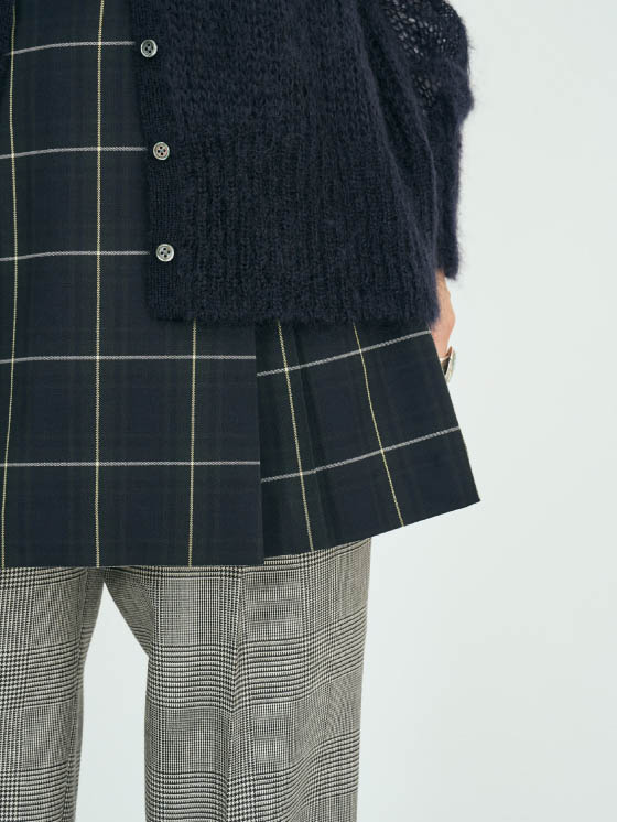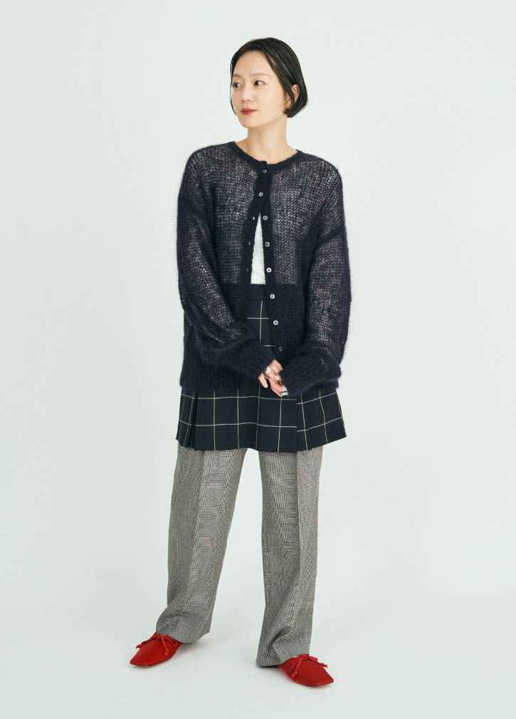 メッシュニットにラップスカート、チェックパンツを重ねたトレンド感のあるスタイルです。透け感のある素材を取り入れることで、女性らしい軽さ抜け感をプラスしました。ネイビーでトーンをまとめて品よく仕上げ、ボタン位置を高めに留めることでIラインを強調したのがポイントです。