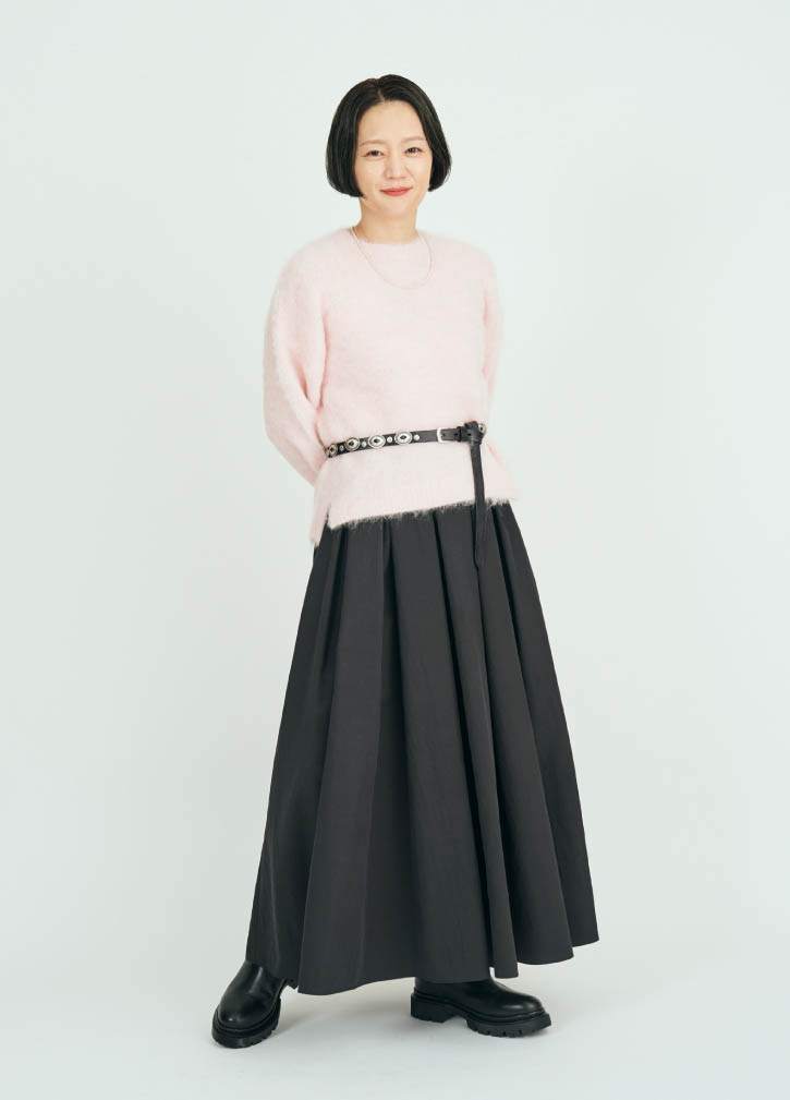 ボリューム感のあるピンクニットは、軽やかで着心地も抜群です。ピンクの甘さを、黒のロングスカートとコンチョベルトで引き締めました。トップスの柔らかさとボトムの強さをベルトでつなぐことで、まとまりのある印象に。年齢を重ねるにつれ、カラーニットの明るさを自然に楽しめるようになりました。