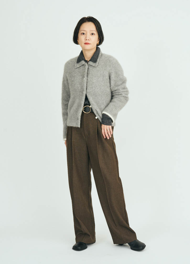 襟付きのニットを重ねて、首元に視線を集めたレイヤードスタイルです。ほどよいカジュアルさと上品さを両立しているのがお気に入り。パールボタンやパイピングのアクセントで、ベーシックな中にも華やぎを添えました。ツイード調パンツを合わせ、素材の表情を楽しみながら全体をソフトにまとめた、理論と感性の融合コーデです。