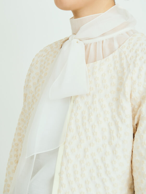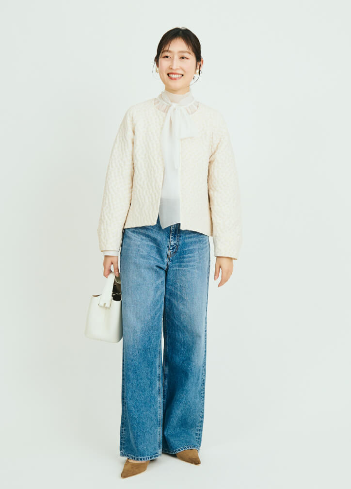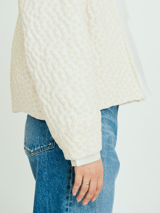 オリジナルのジャカード生地が特徴のブルゾンは、オケージョンシーンにもおすすめの一着。あえて相反するテイストのデニムを合わせ、ドレスダウン。立体感のある素材やボリュームのあるスリーブが、シンプルな着こなしの中に程よく甘いアクセントを添えてくれます。