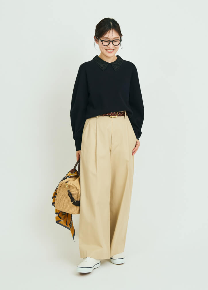襟付きニットは、人に会う日でもラフに見えず、きちんと感を見せられます。チノ素材のワイドパンツとスニーカーを合わせることで、通勤や展示会まわりなどにぴったりな、動きやすさを重視したスタイルに。ベージュを合わせたやわらかな2トーンでまとめました。